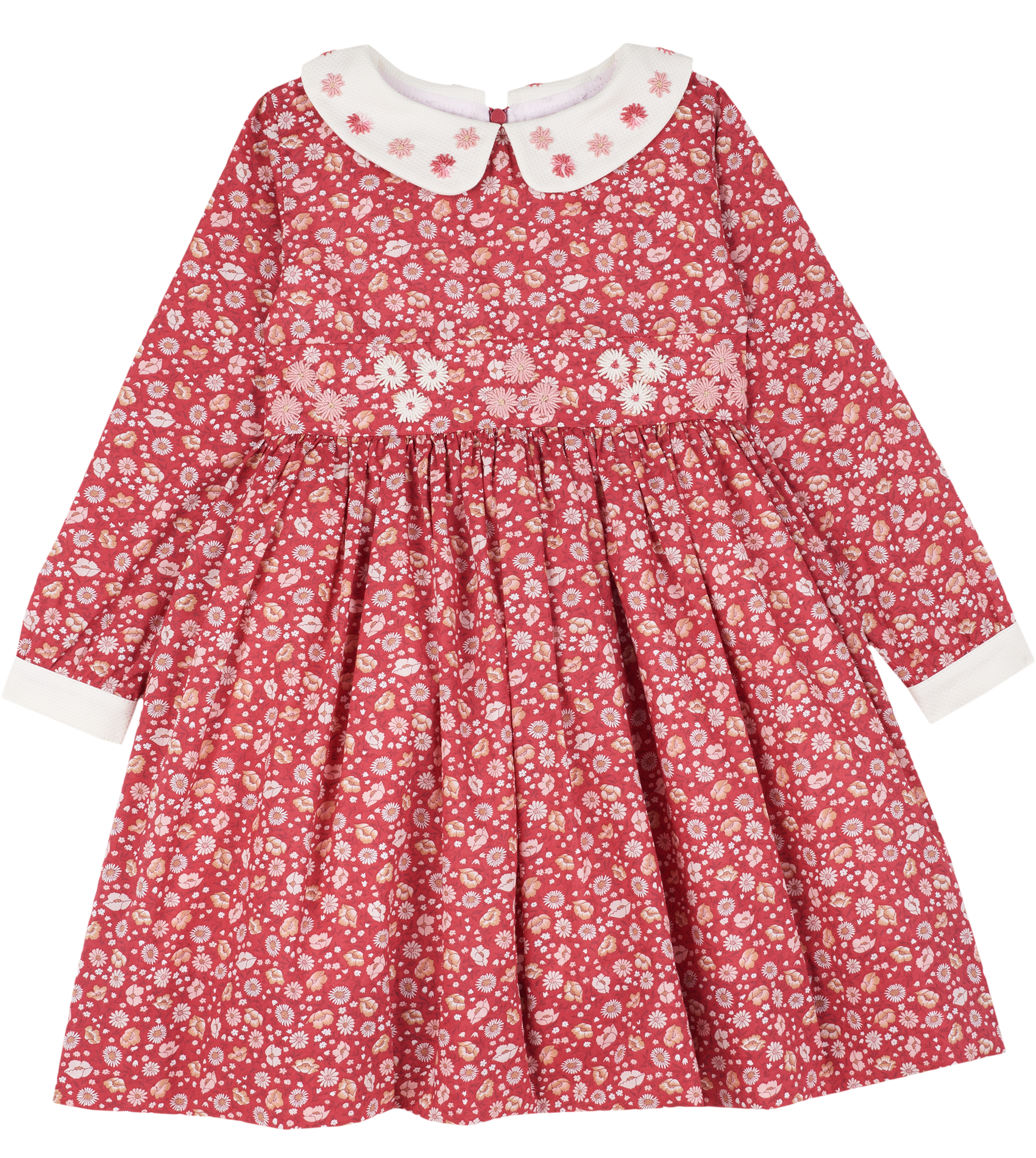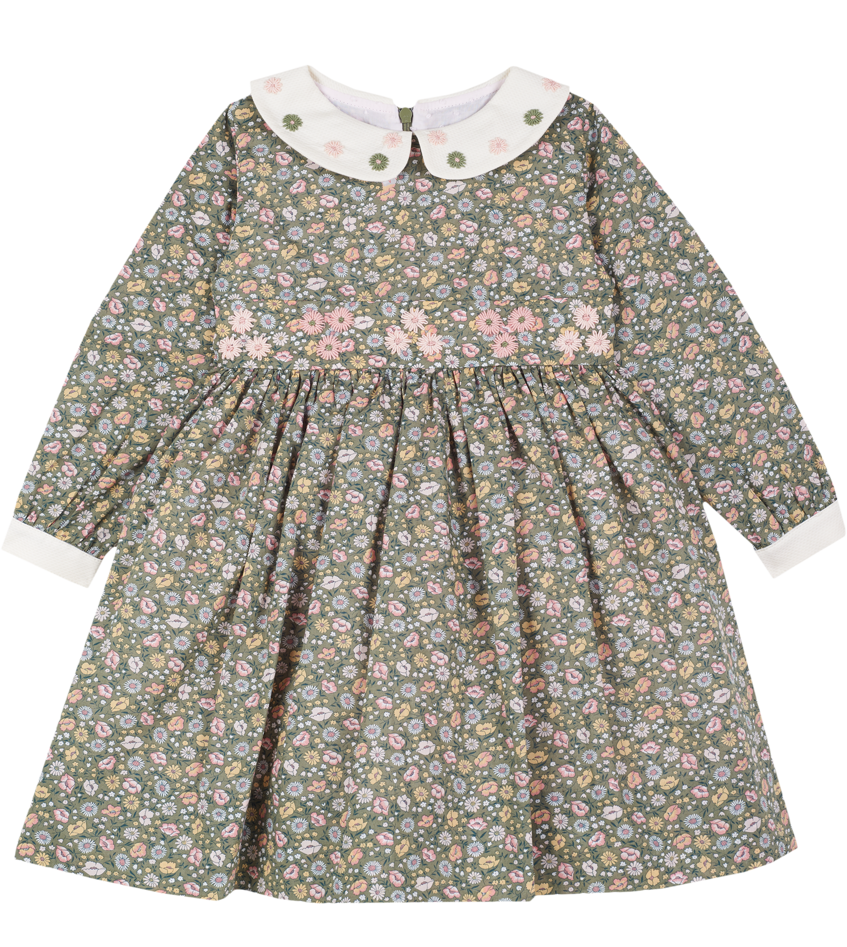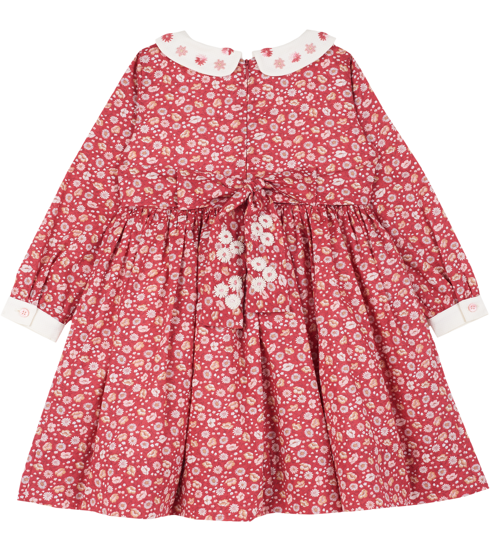A cotton piqué Peter Pan collar and matching cuffs create a lovely contrast to the Liberty print, both delicately embroidered for added refinement. Intricate embroidery also embellishes the front waist, back belt, and collar, adding artisanal detail. The softly tailored back belt ensures a perfect fit, and a lace-trimmed cotton lining reveals a hidden touch of craftsmanship and charm.