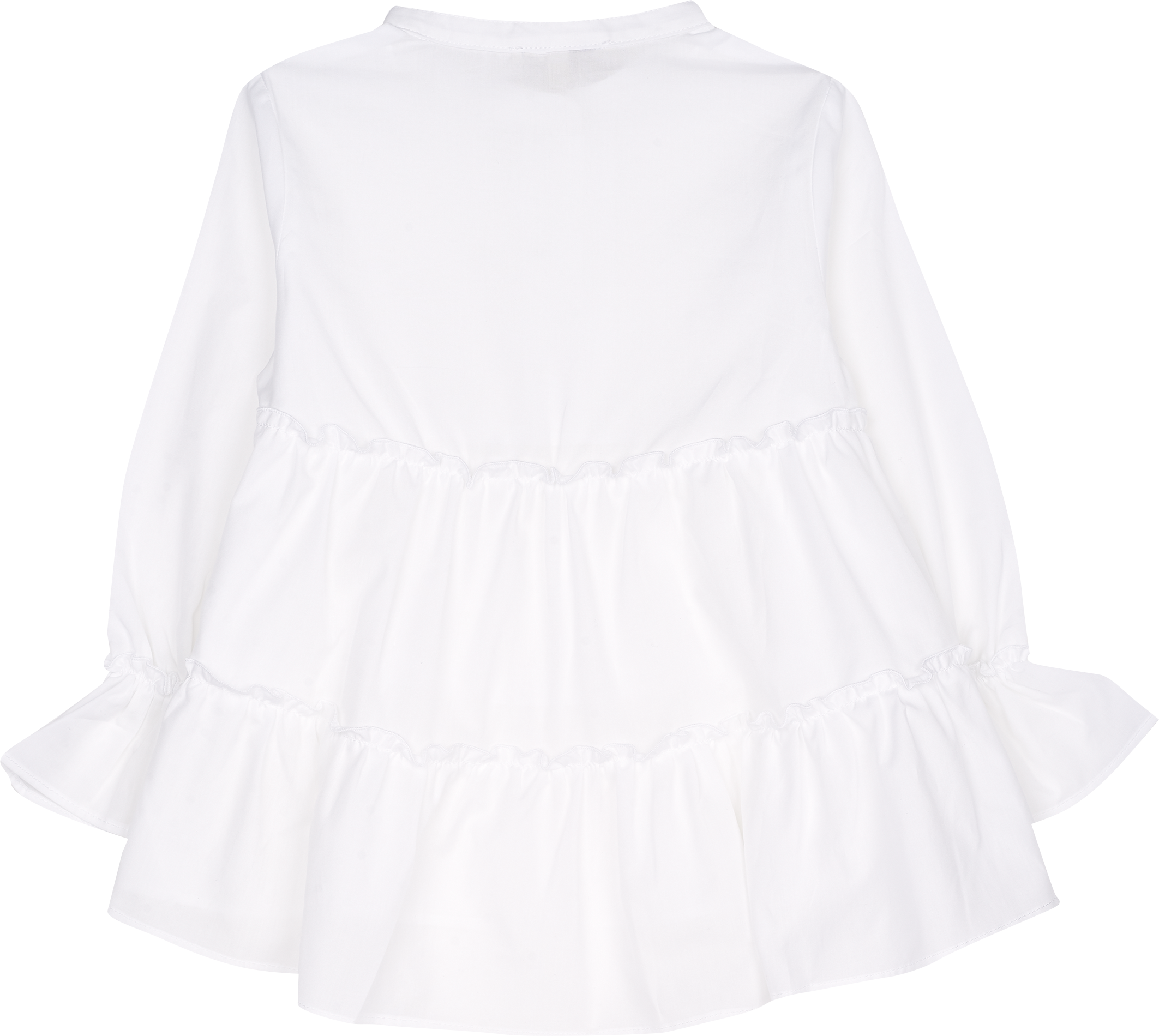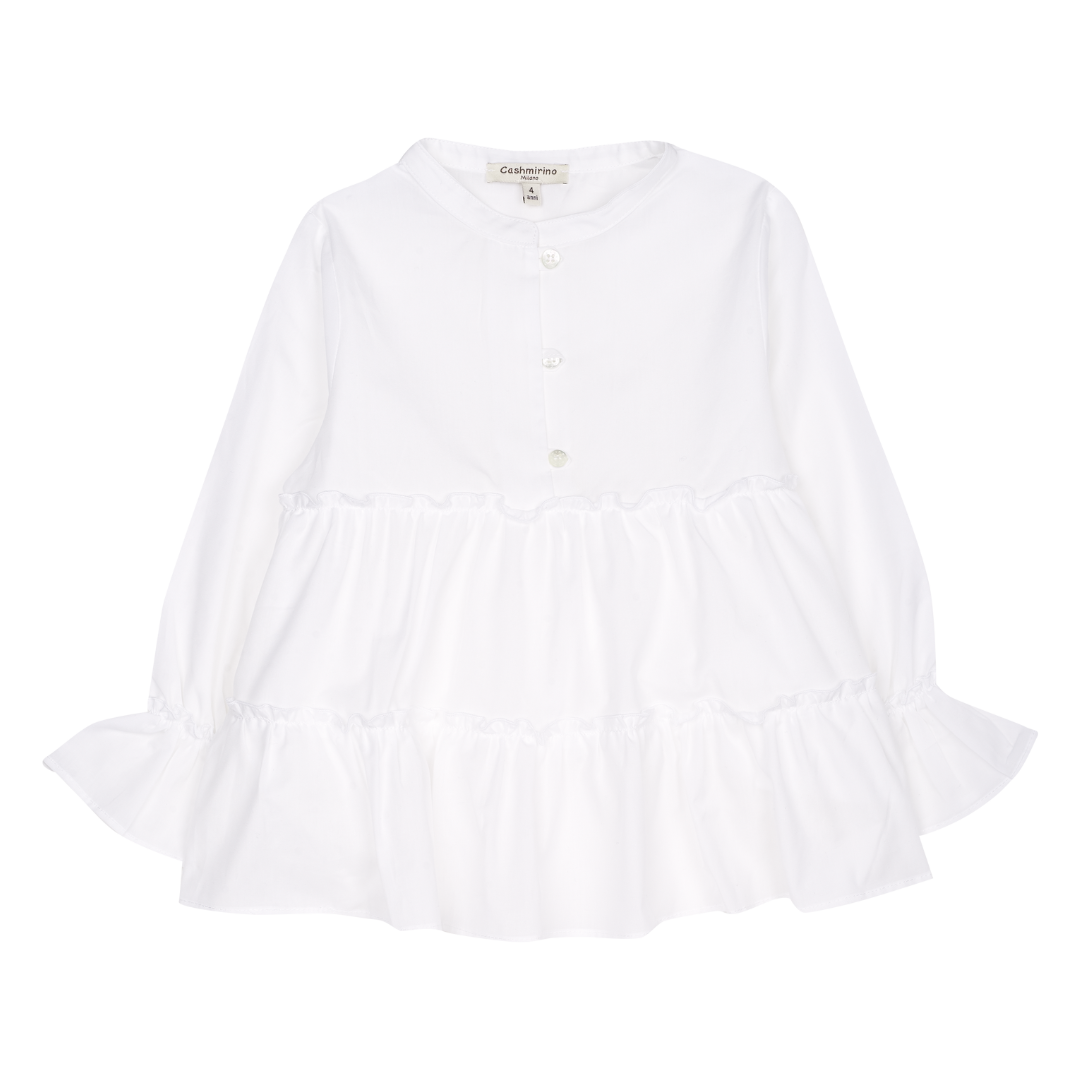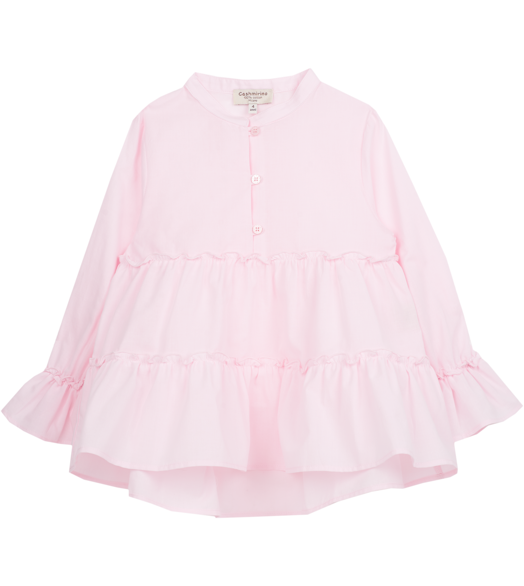 Delicate gathered flounces and ruffled cuffs lend a gentle, feminine charm, while the low grandad collar and signature Cashmirino buttons provide a refined finishing touch.