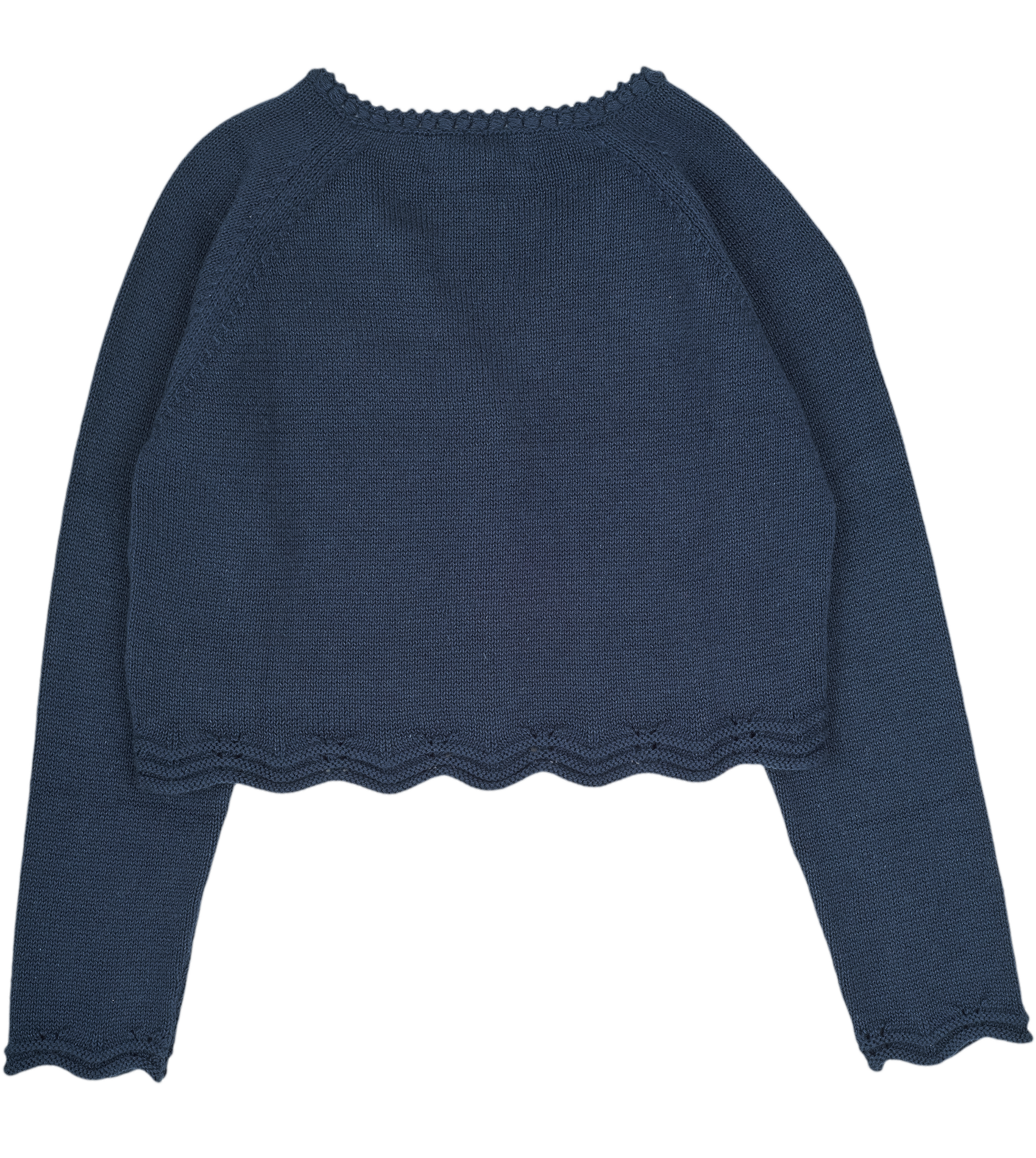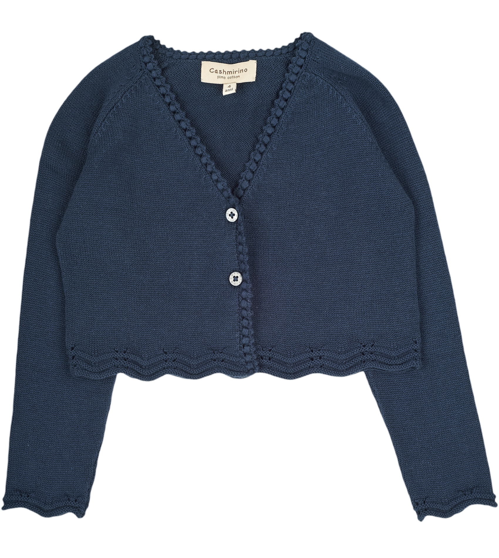 Bursting with details, our pima cotton v-neck shrug is complete with scalloped details on hem and cuffs and crochet detailing along the V-neck and button opening. Ideal for wearing over a party dress or blouse to provide warmth, comfort and style. This cardigan can be worn in autumn, spring or as a layer in winter.