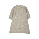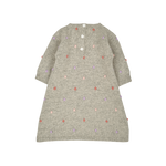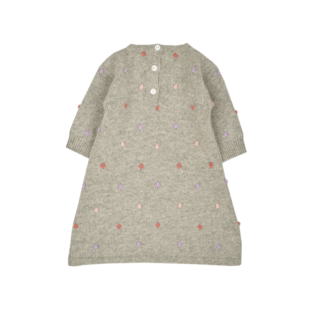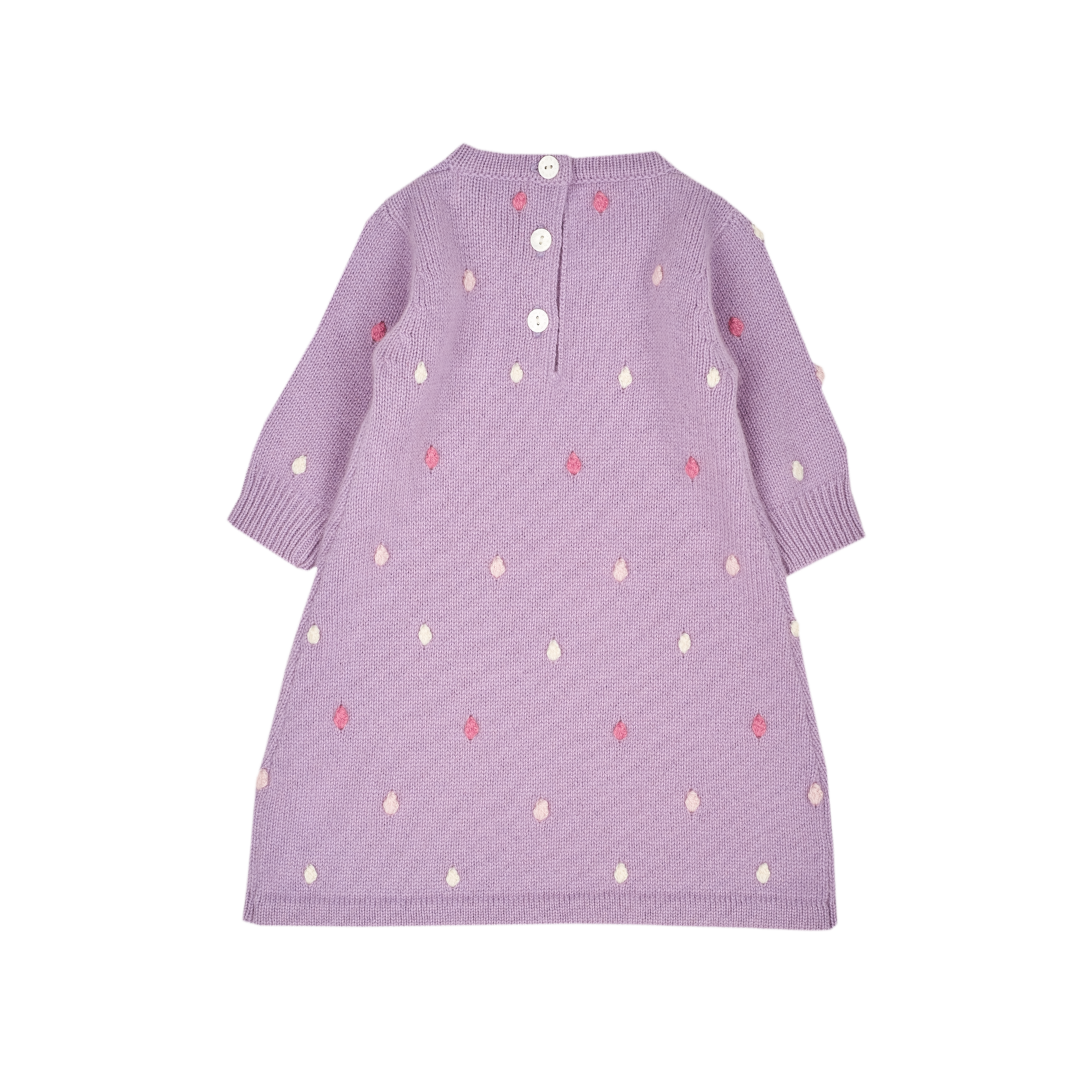 This stylish girl dress is made from 100% cashmere. Featuring a round neck, elbow length sleeves and cute bobbles cover this dress. With back button fastening. Available in Lilac or Grey.