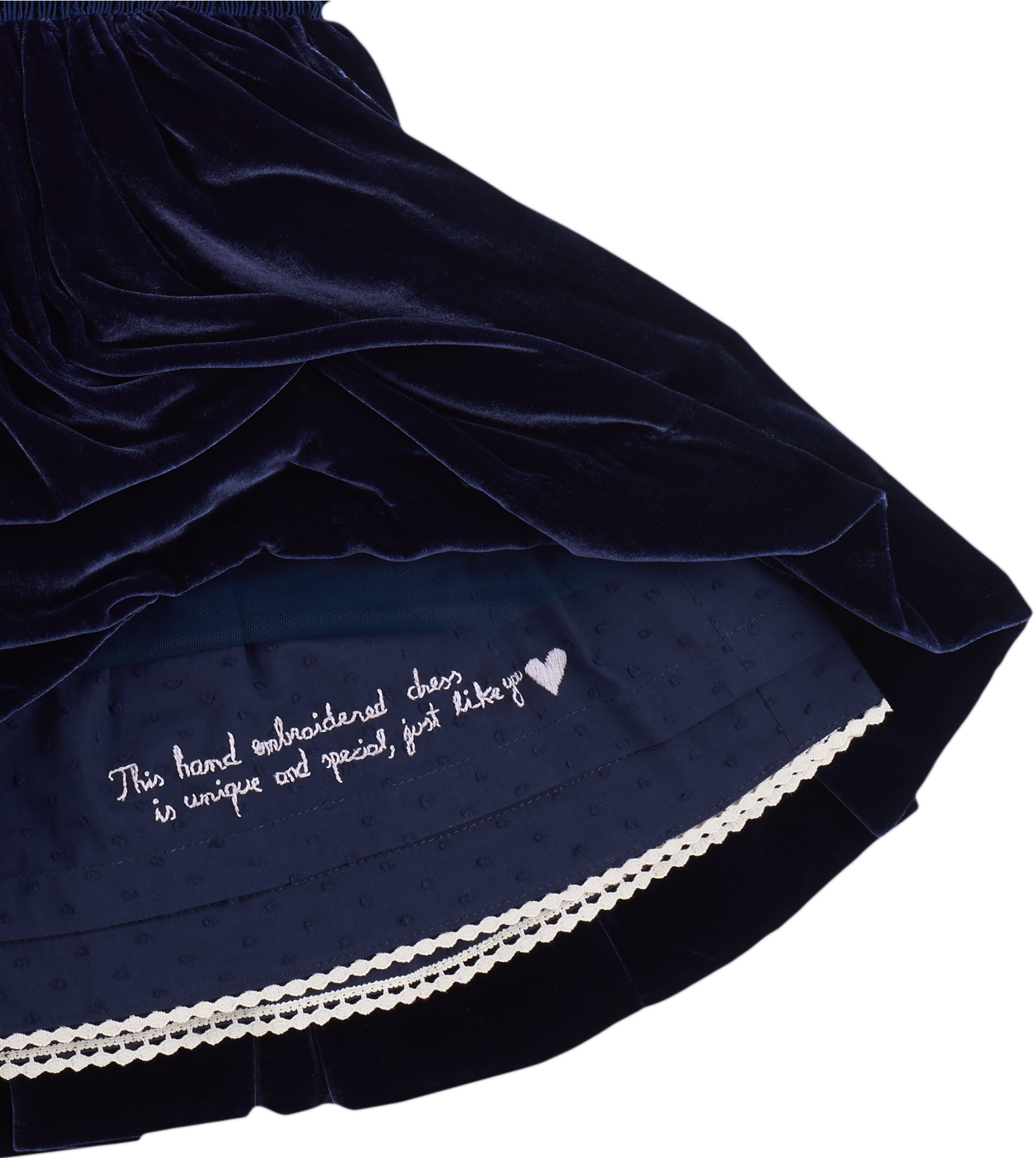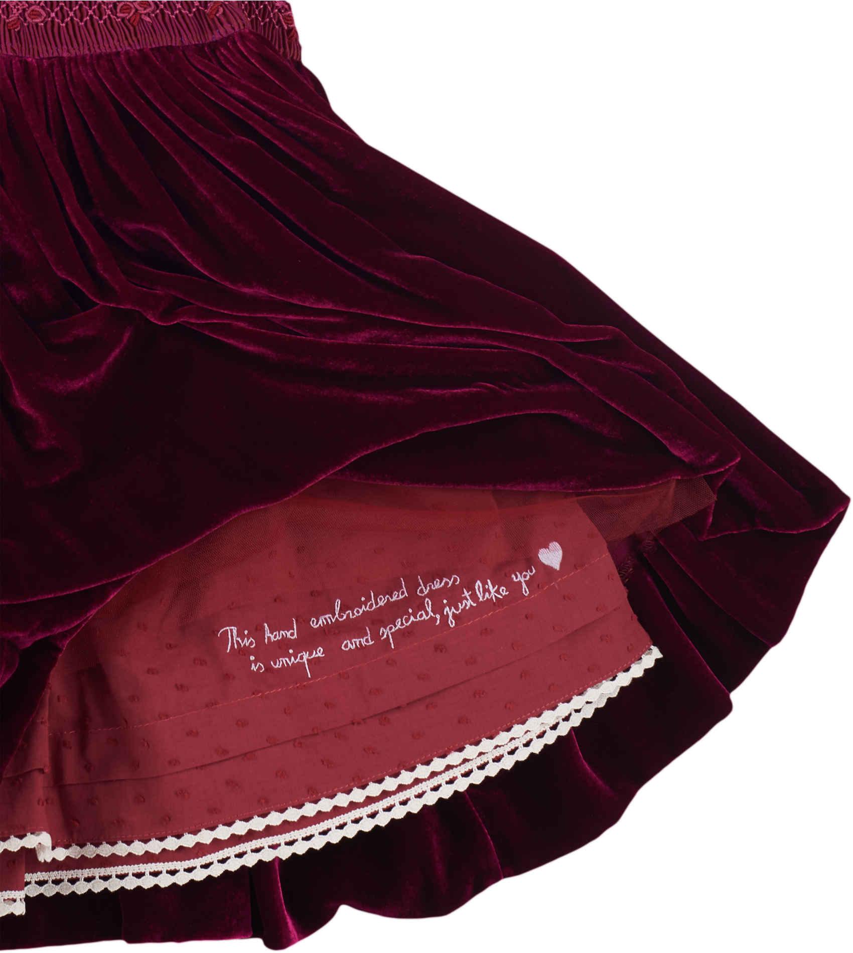 • Hand embroidered text on lining hem: " This hand embroidered dress is unique and special, just like you"