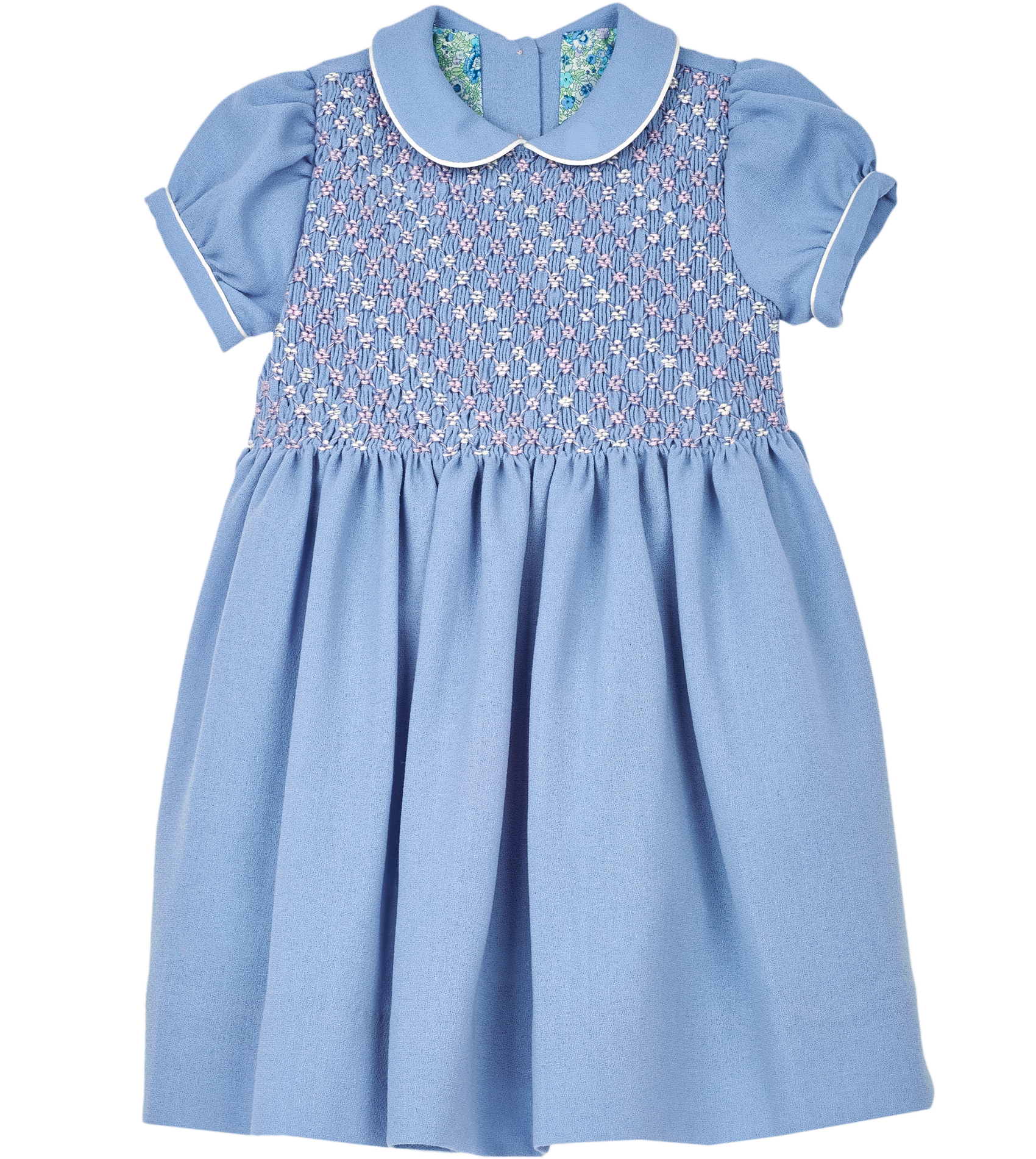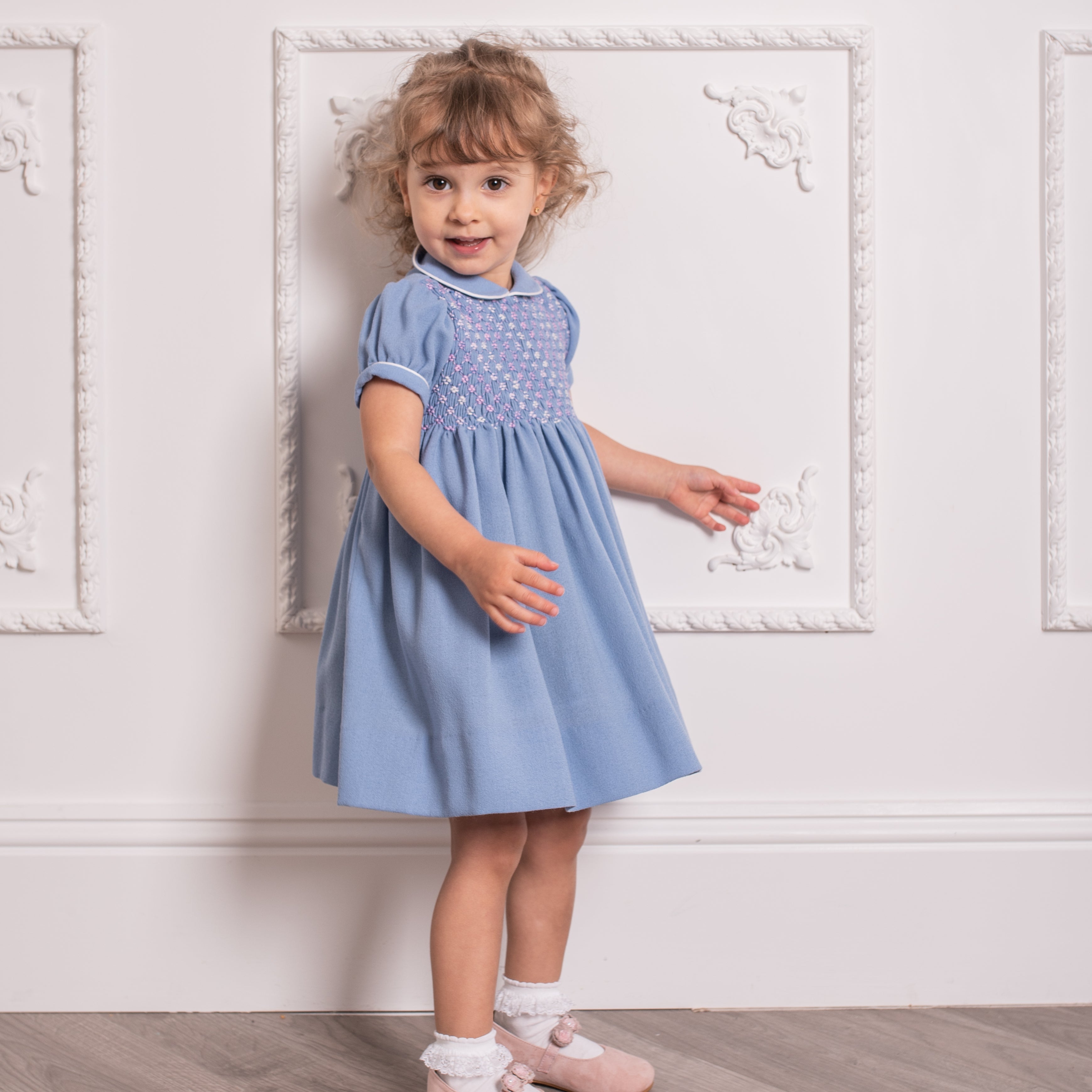 Our smocked girl dress oozes elegance. The hand-embroidered detail on the smocked panel combined with the Peter Pan collar and long sleeves makes this dress ideal for occasions. Made from 100% wool and lined with cotton for maximum comfort.