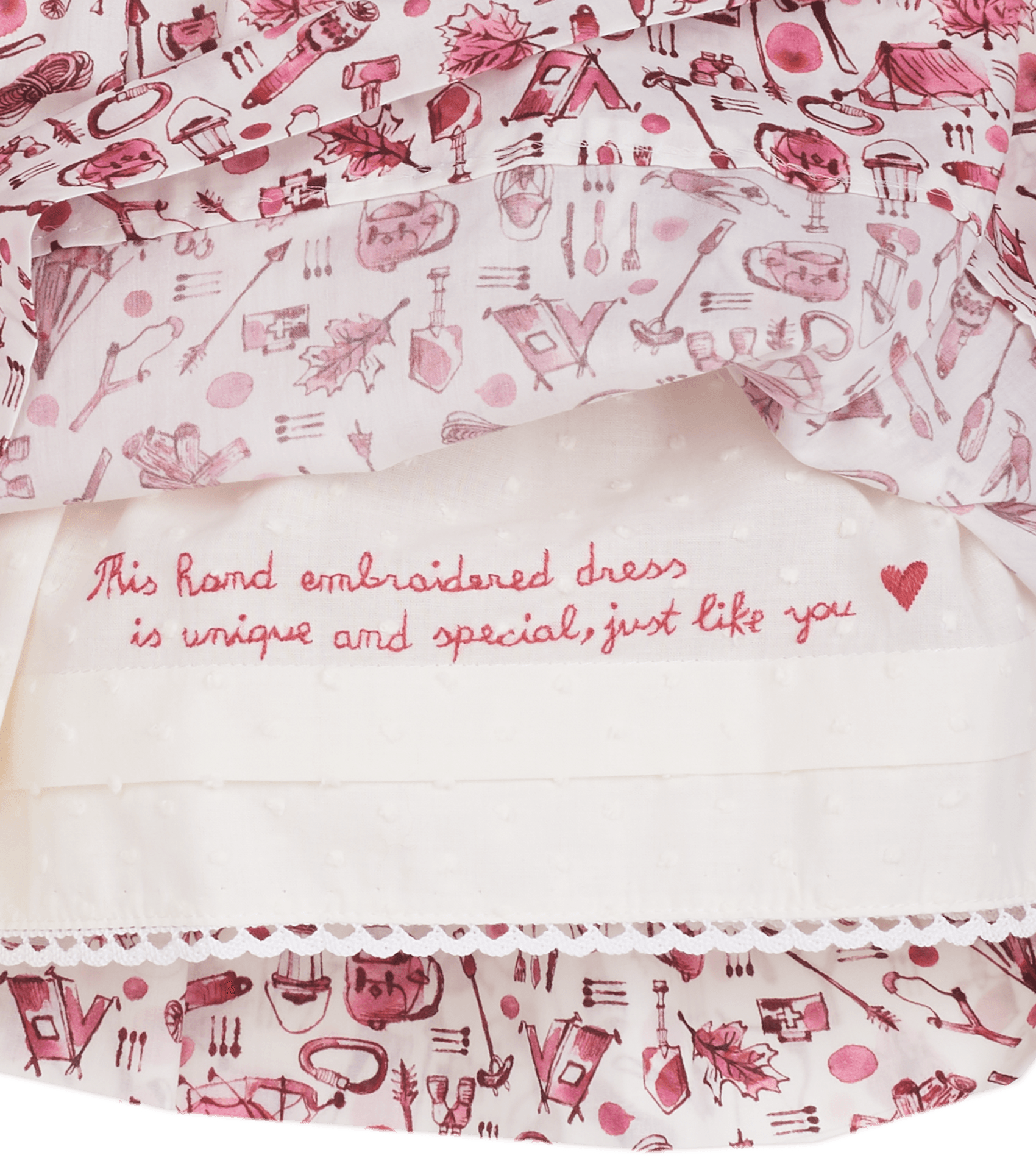 Made with Liberty fabrics, also includes a smocked front panel with embroidery for an added touch; it's breathable and includes our hand embroidered message ‘This hand embroidered dress is unique and special just like you’.