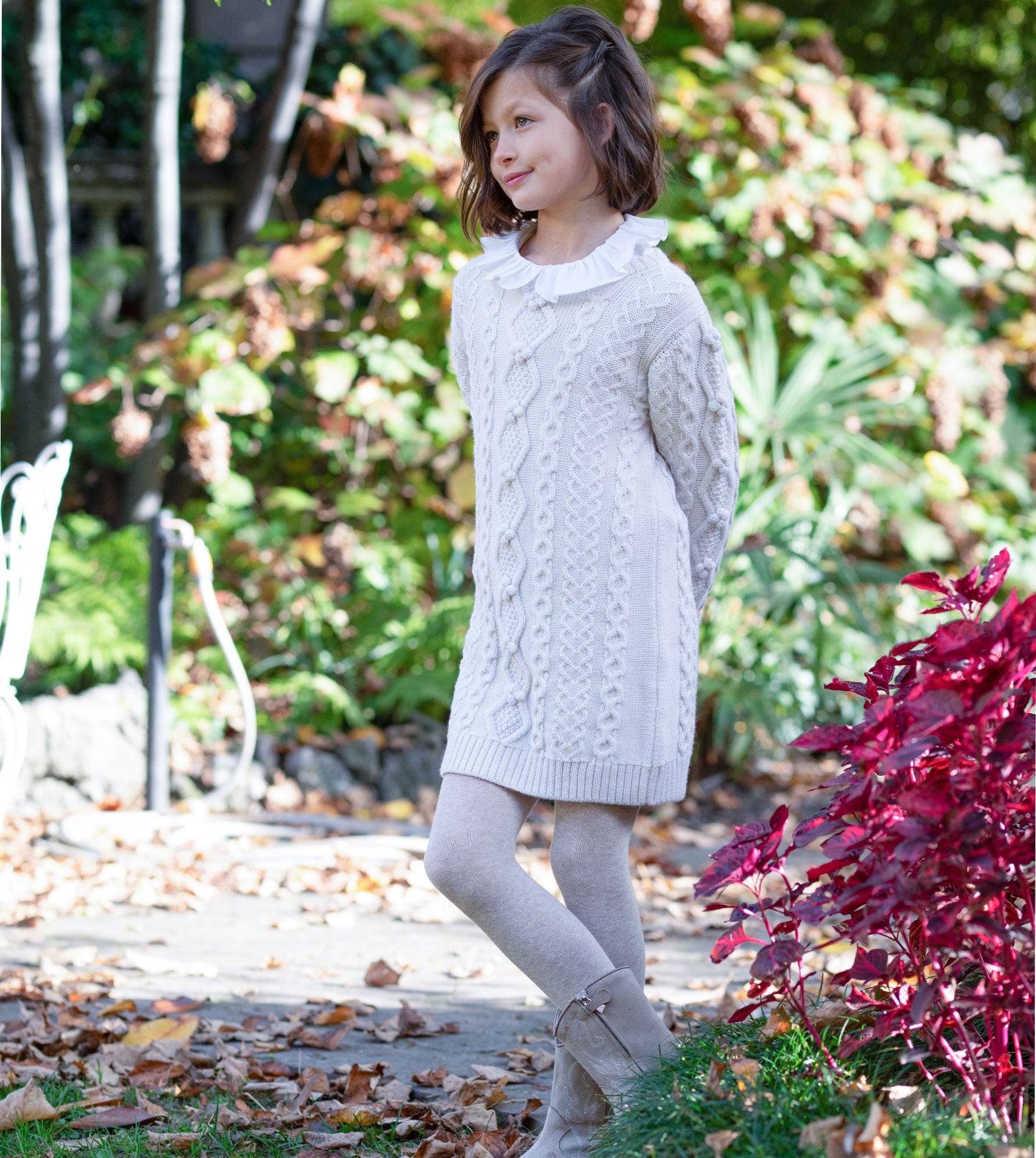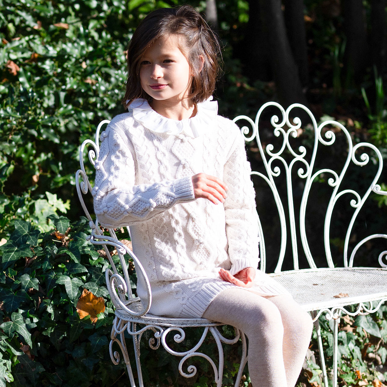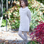 Our Noelle dress is a perfect winter warmer. Made from 100% Royal Alpaca, it will brighten up their winter. Elegant and refined, our long-sleeved Aran dress features an assortment of diamond, honeycomb, and heart cable knits with super soft bobbles on the front, back and sleeves. Our baby sizes come with our signature Cashmirino button fastening on the shoulder, making it super easy to put on and take off. Great for everyday activities, whether jumping in the autumn leaves or sledging in the snow, they will be cosy and comfortable this season.