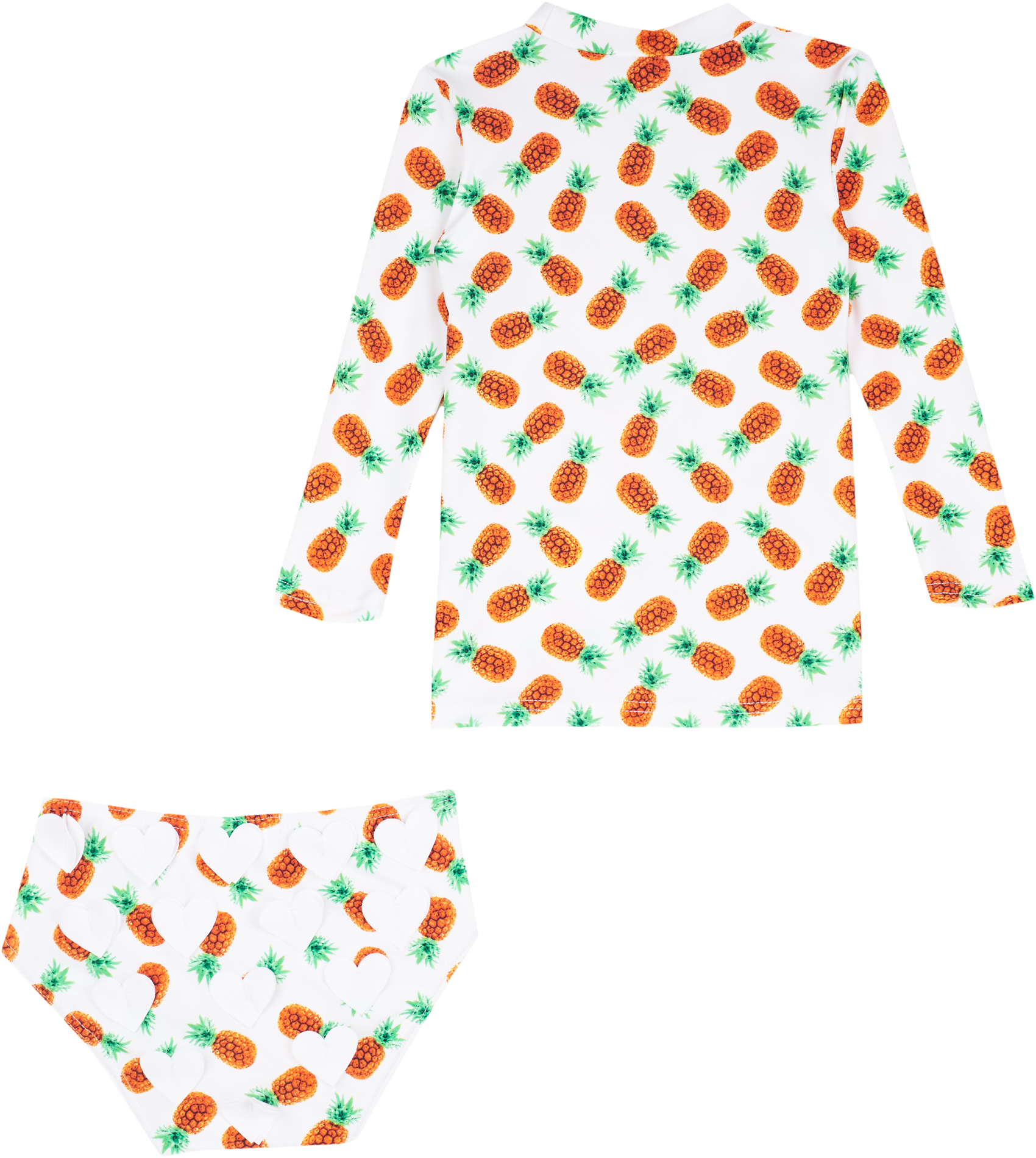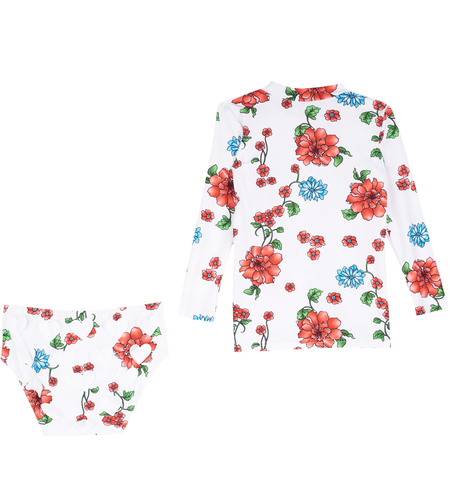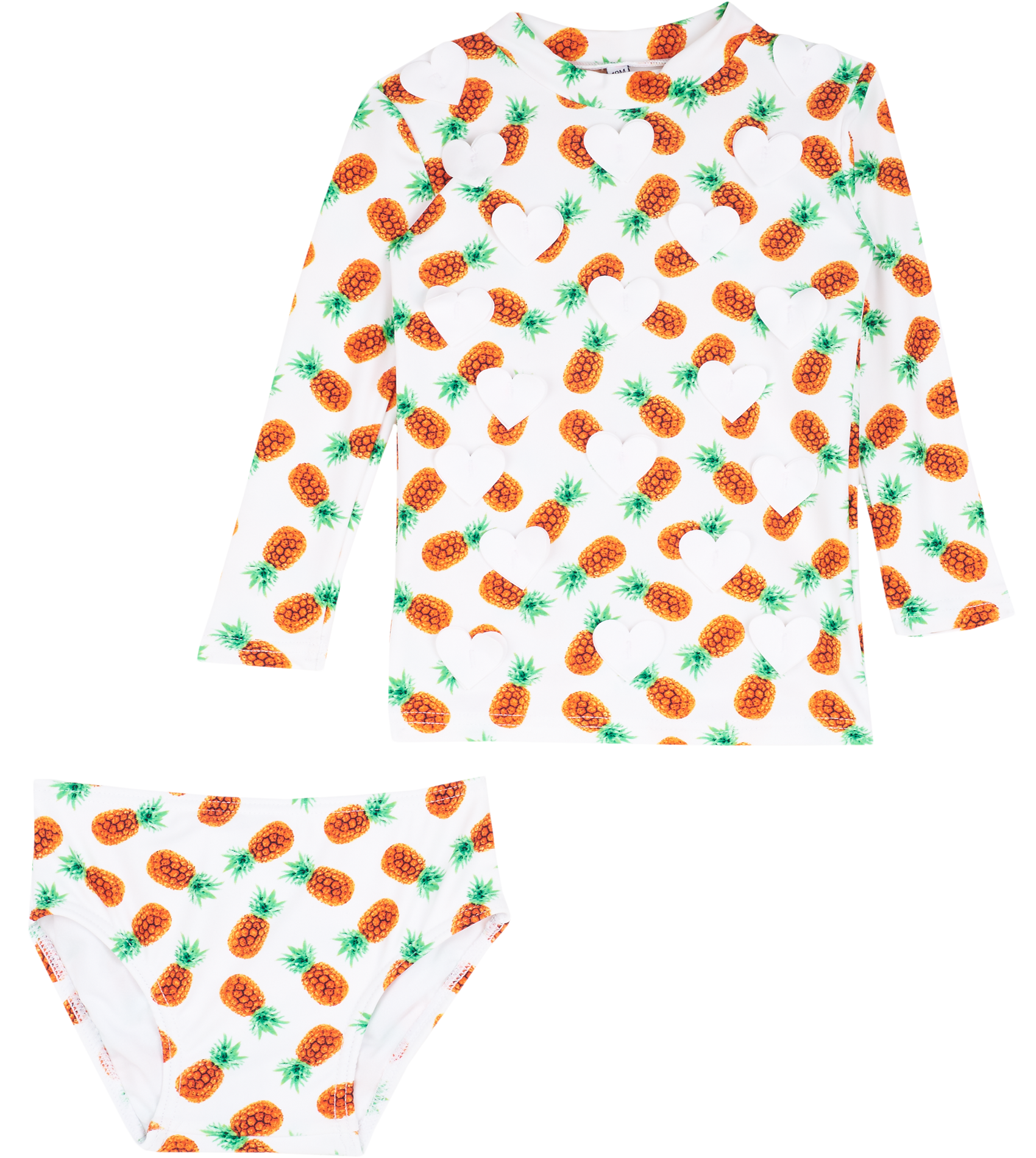 A patterned two piece swimsuit featuring a rash vest with long sleeves and a high neck to protect your little girl whilst in the sun. This cute style is completed with flutter heart applique and matching bikini bottoms.