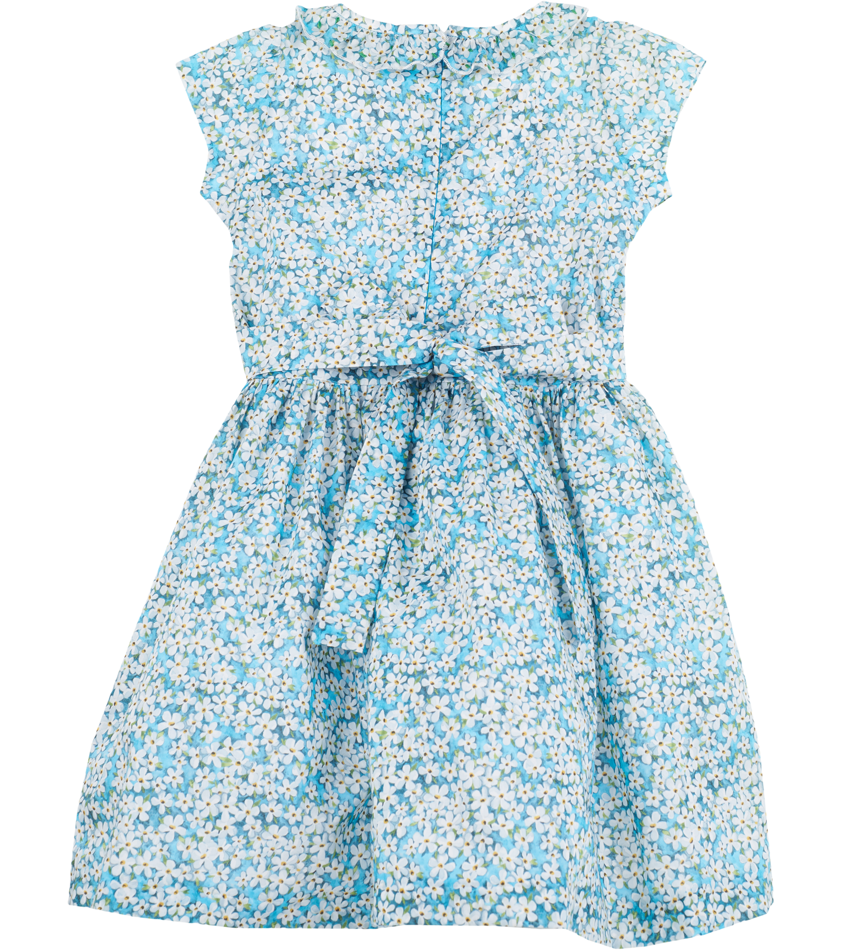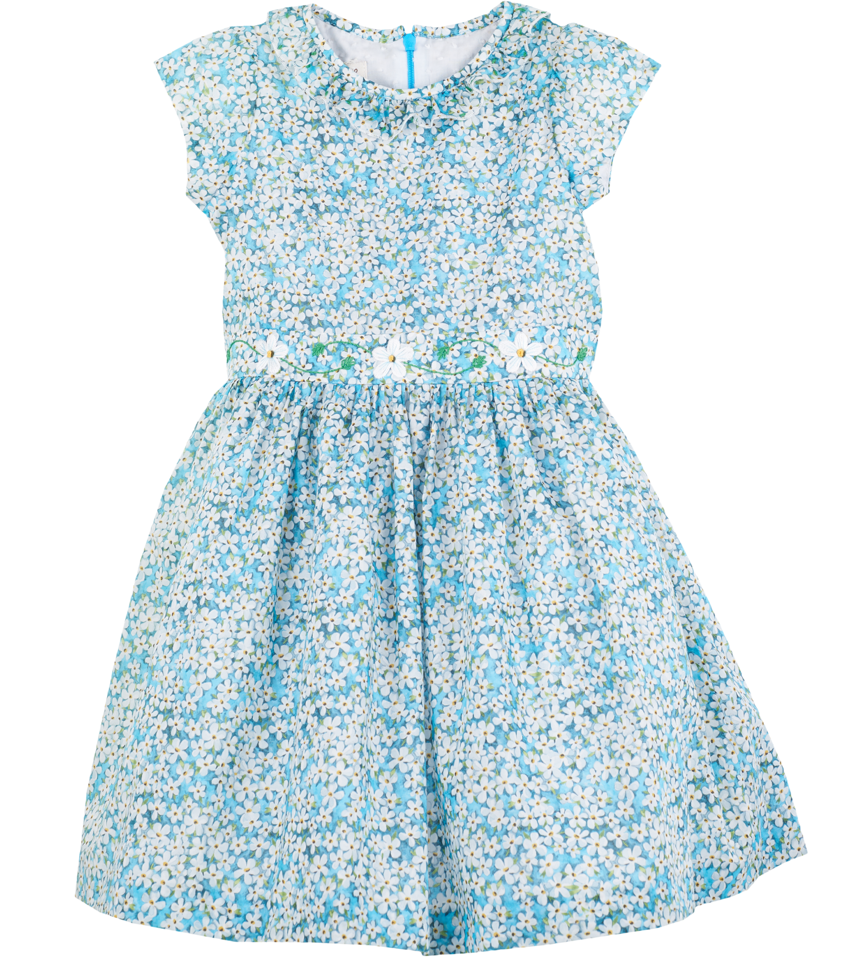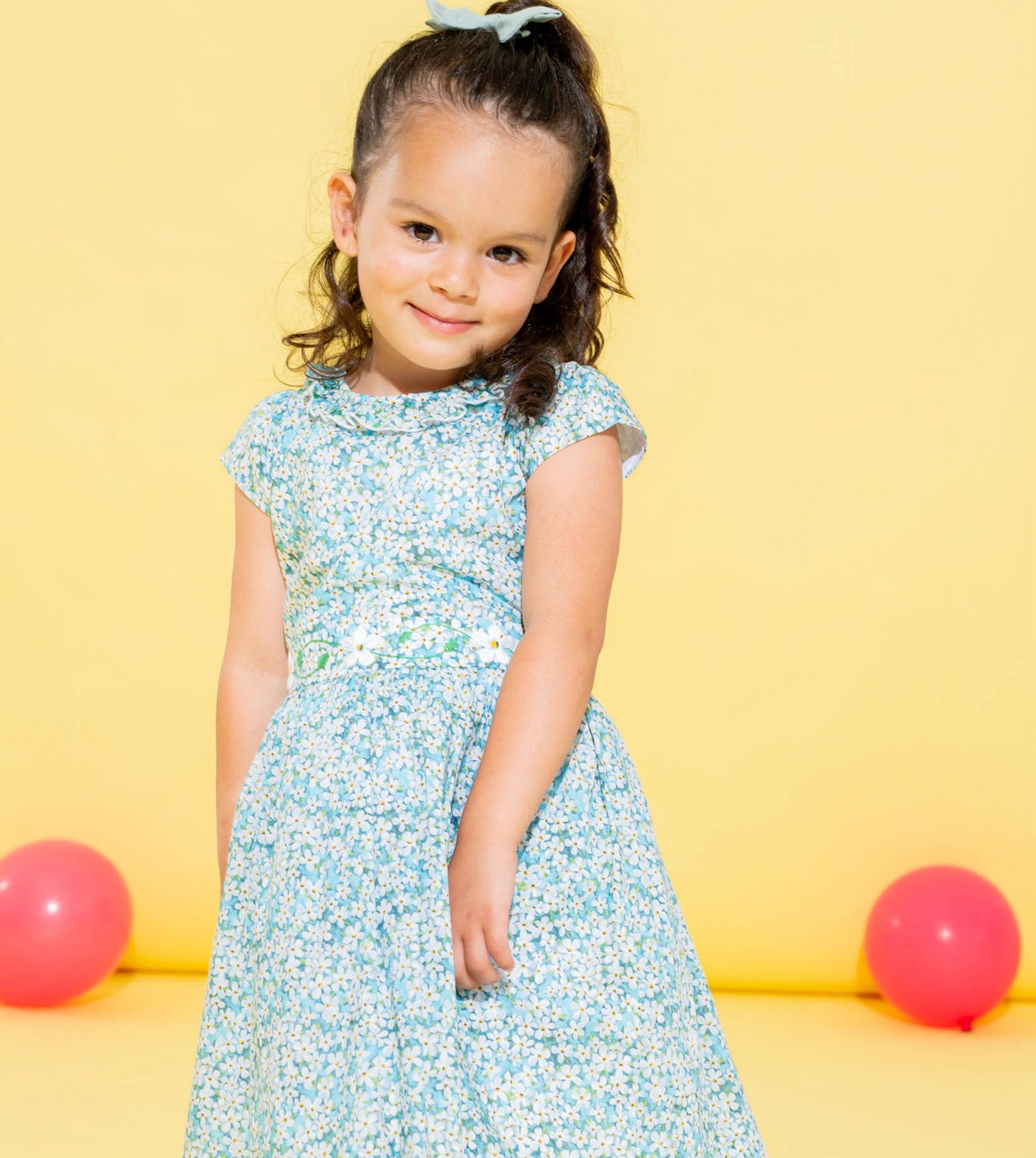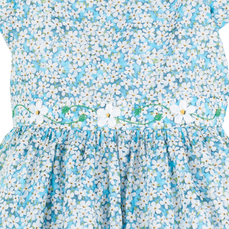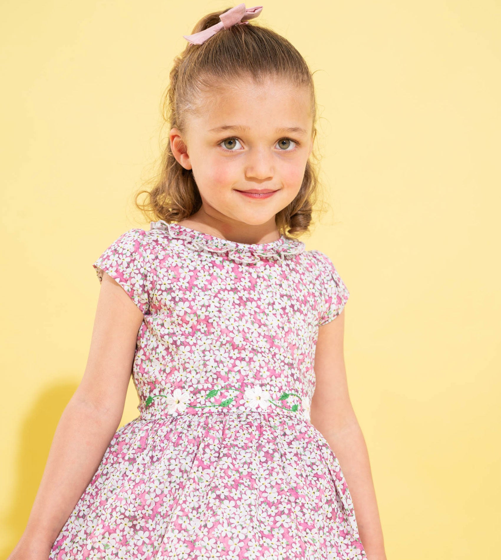 Inspired by spring fields, this hand-embroidered smock dress can join your little one on their adventures. This dress is perfect for summer days. Made from Liberty fabrics, this dress is unique and one of a kind. We absolutely adore the bright and bold colours with the added touch of an embellished ruffle collar and an elegant floral waistband. The crochet trimmed lining also includes a hand embroidered message ‘This hand embroidered dress is unique and special just like you’. With a zipper opening and tie back, this will make it super easy to put on. This piece is perfect to wear when playing with friends at the park or at an event with family making this a truly unique dress for your little one.