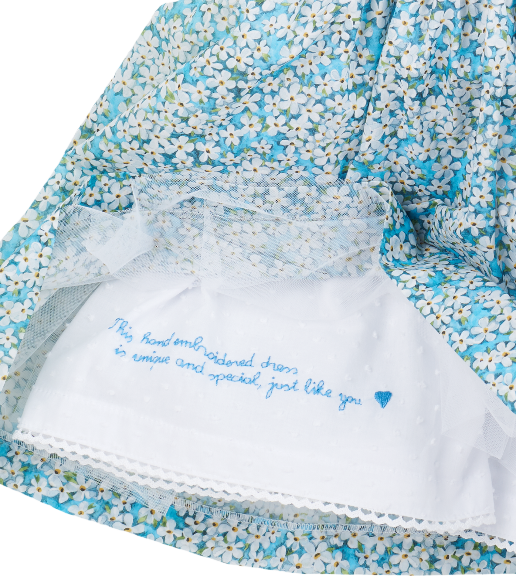 - Hand embroidered text on lining hem: "This hand embroidered dress is unique and special, just like you"