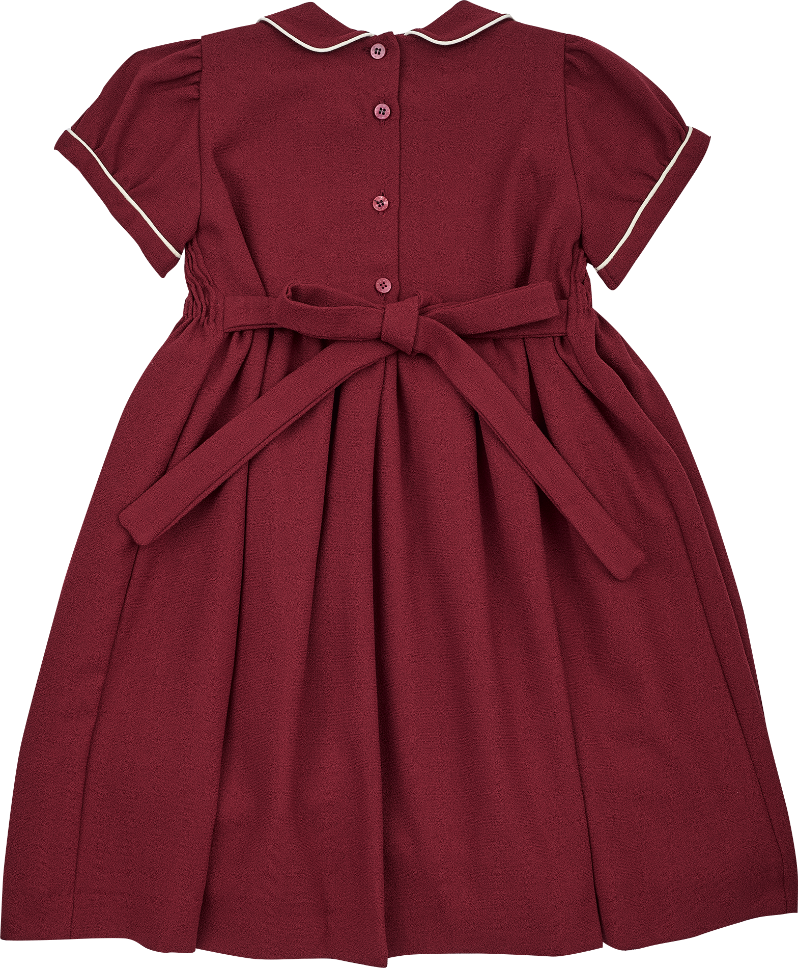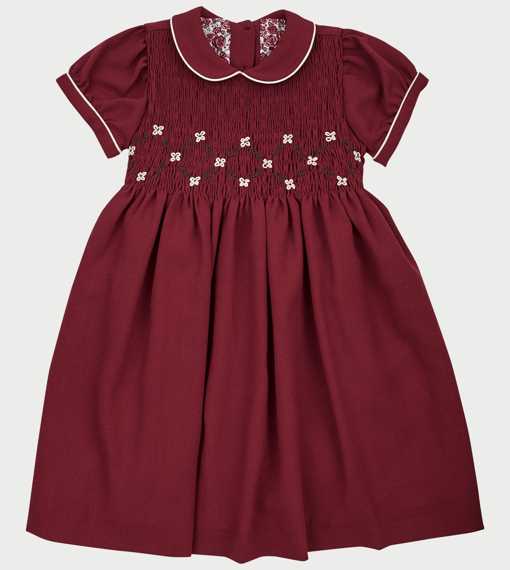 Every detail is thoughtfully considered in this exquisite 100% wool dress, from the hand-smocked panel and delicate floral embroidery to the gently puffed sleeves and classic Peter Pan collar—all beautifully brought to life in a rich Bordeaux hue.