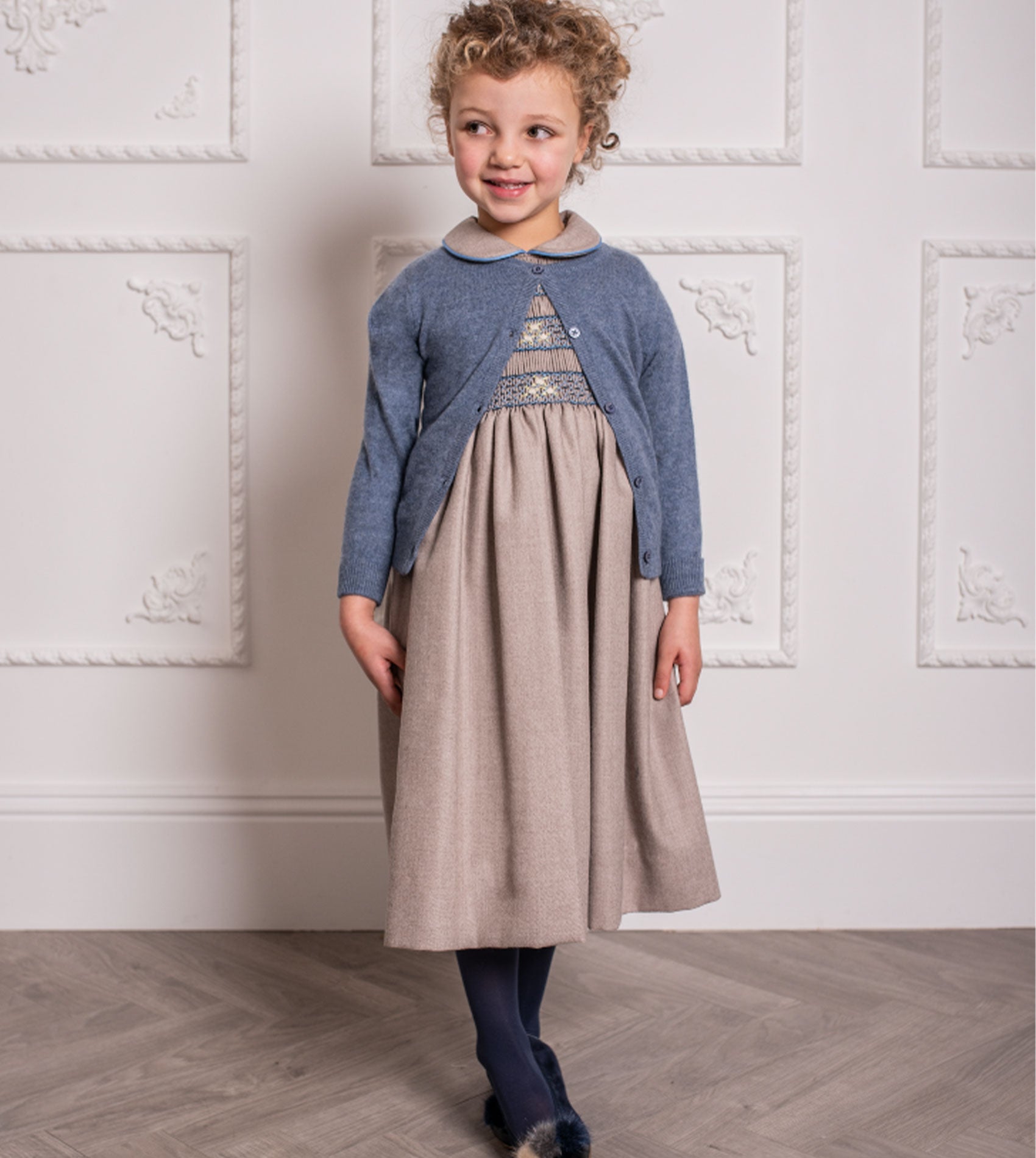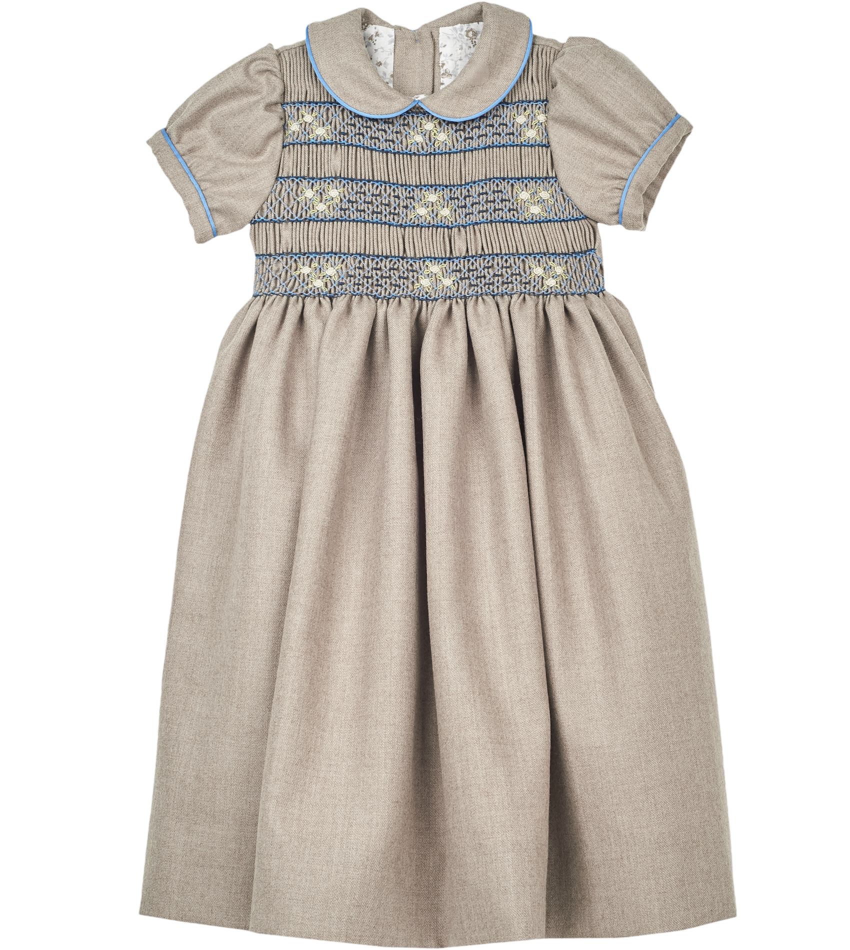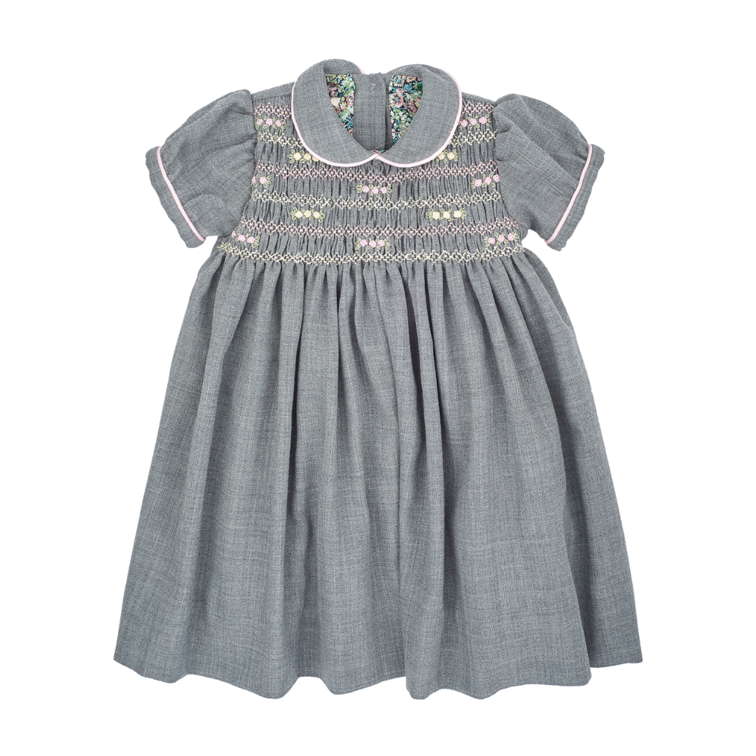 This smocked girl dress oozes elegance. The hand-embroidered detail on the smocked front panel combined with the Peter Pan collar and puff sleeves make this dress ideal for occasions. Made from 100% wool and lined with cotton for maximum comfort.