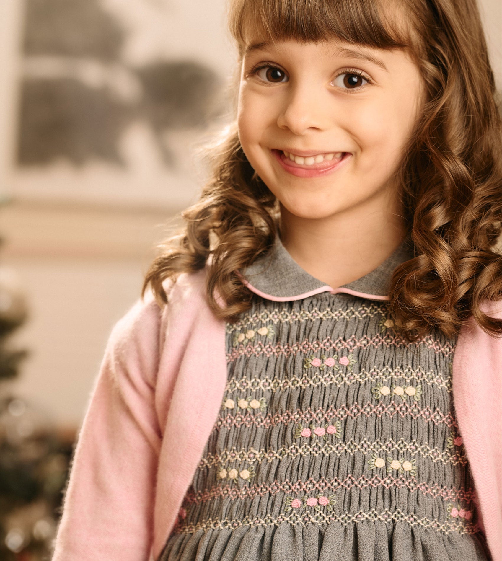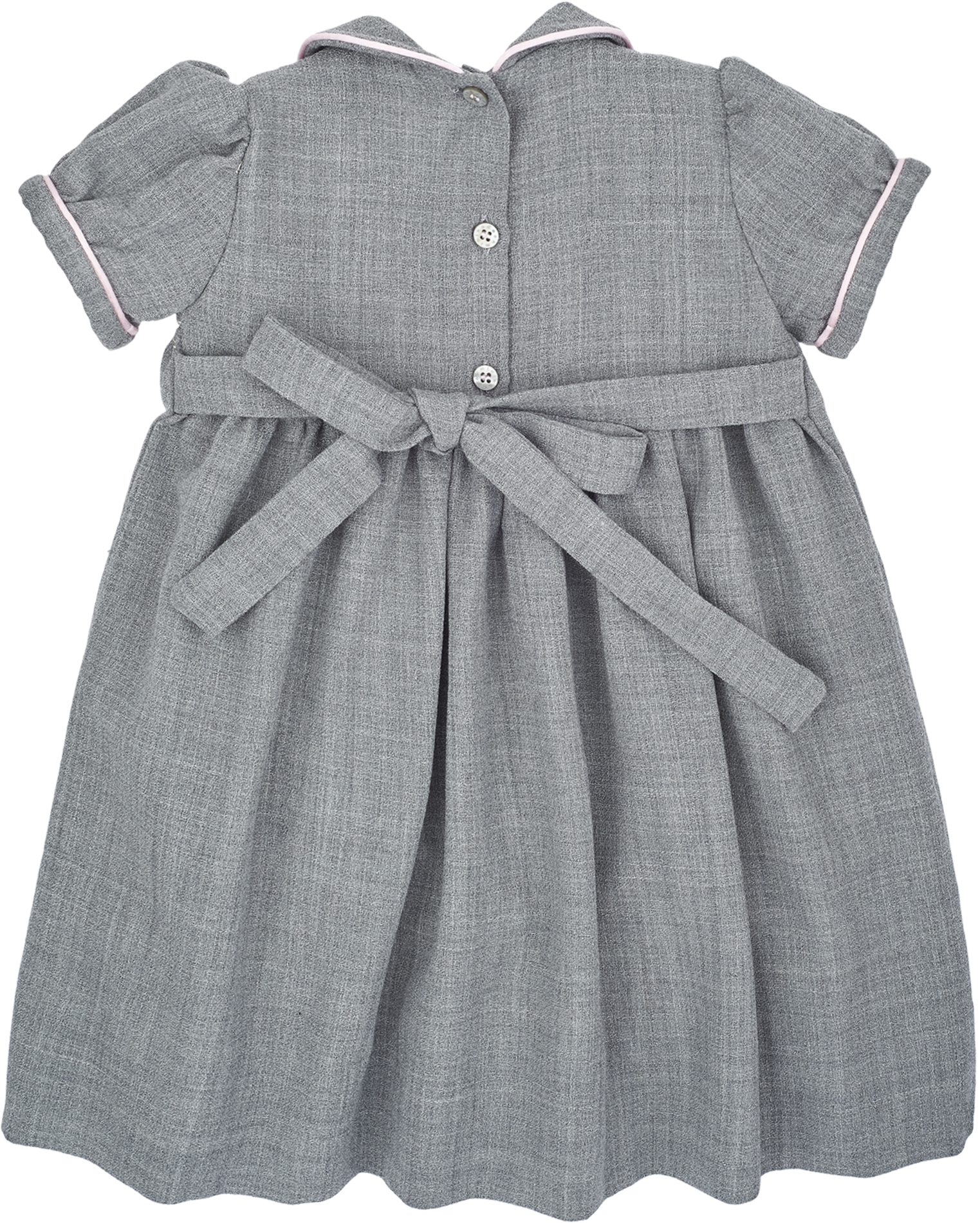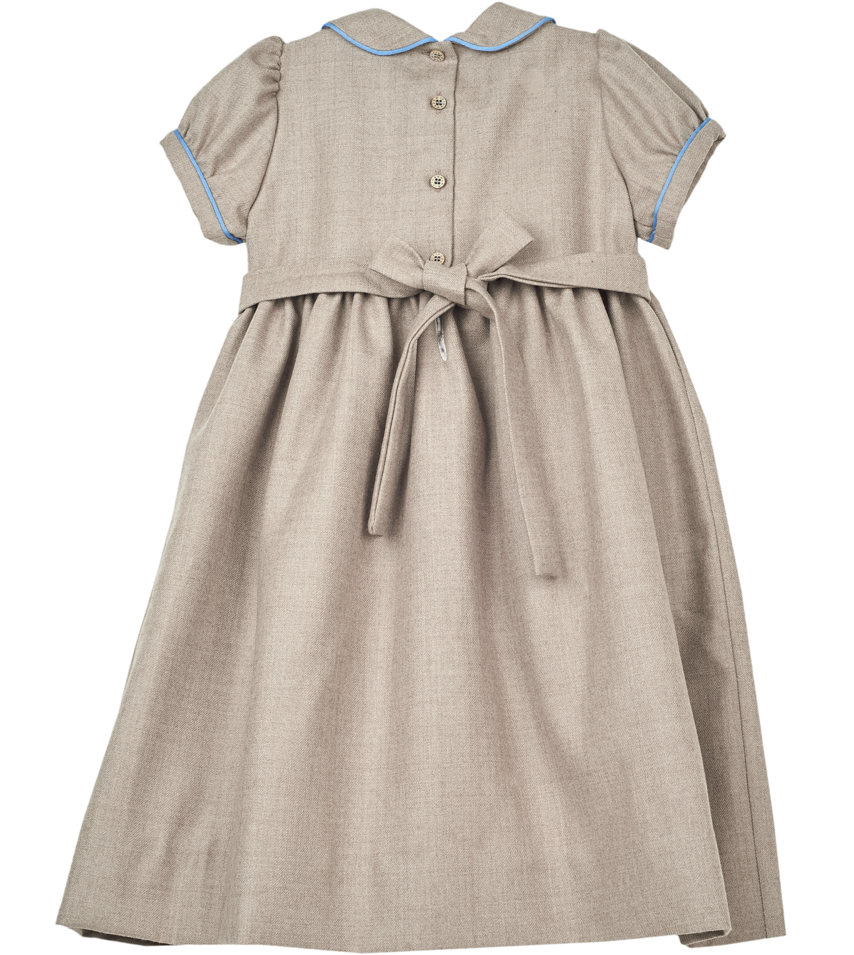 This smocked girl dress oozes elegance. The hand-embroidered detail on the smocked front panel combined with the Peter Pan collar and puff sleeves make this dress ideal for occasions. Made from 100% wool and lined with cotton for maximum comfort.