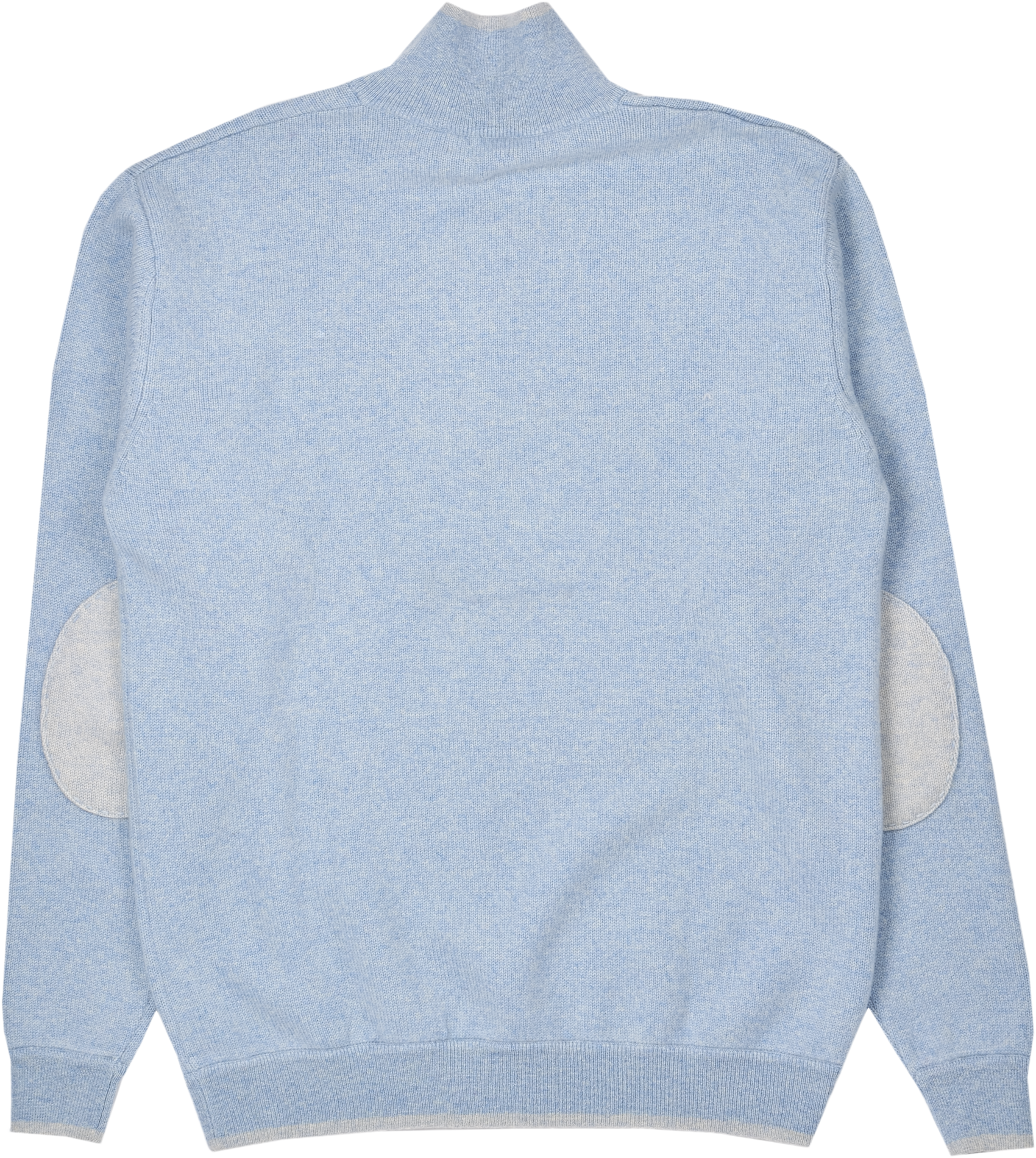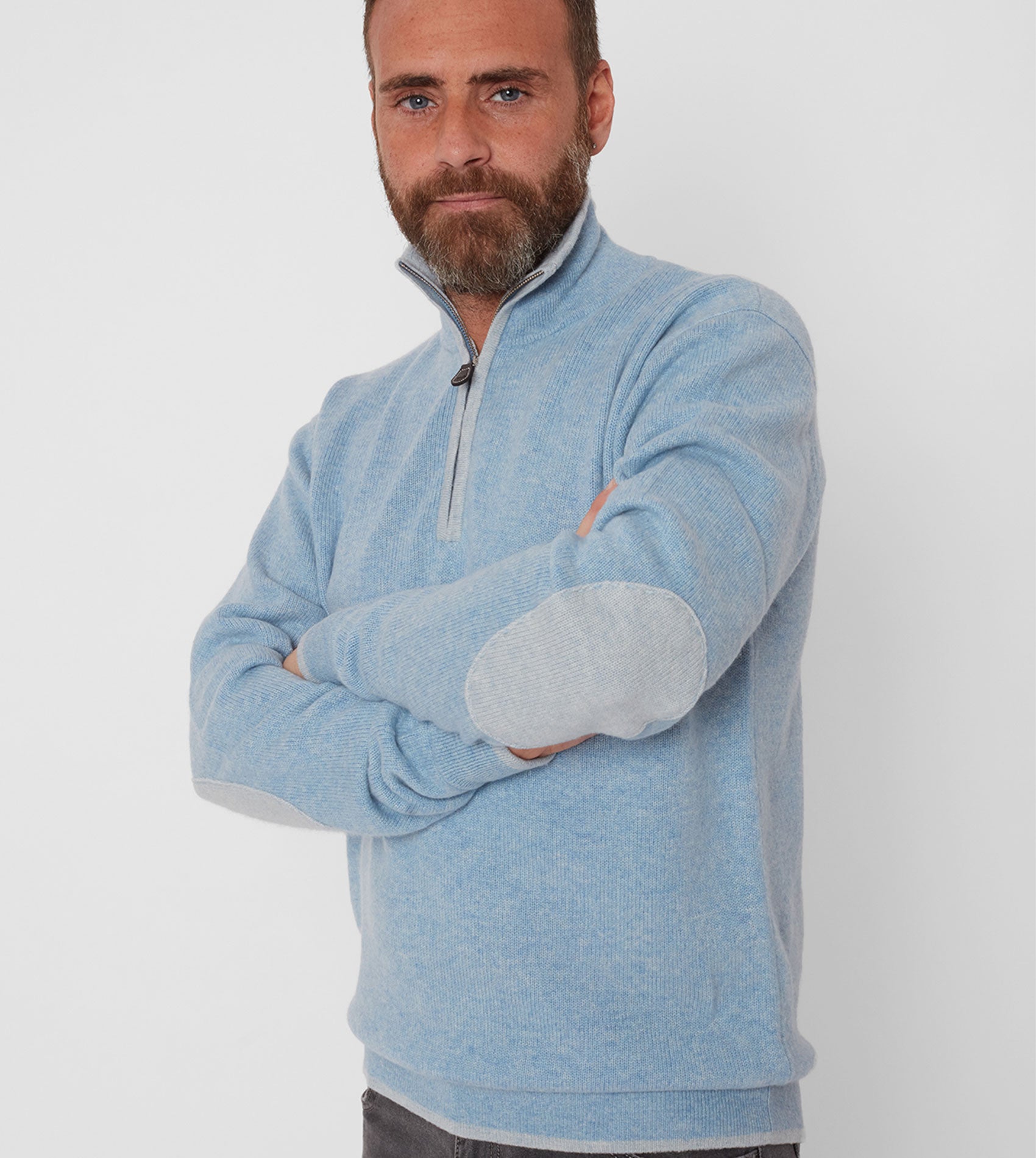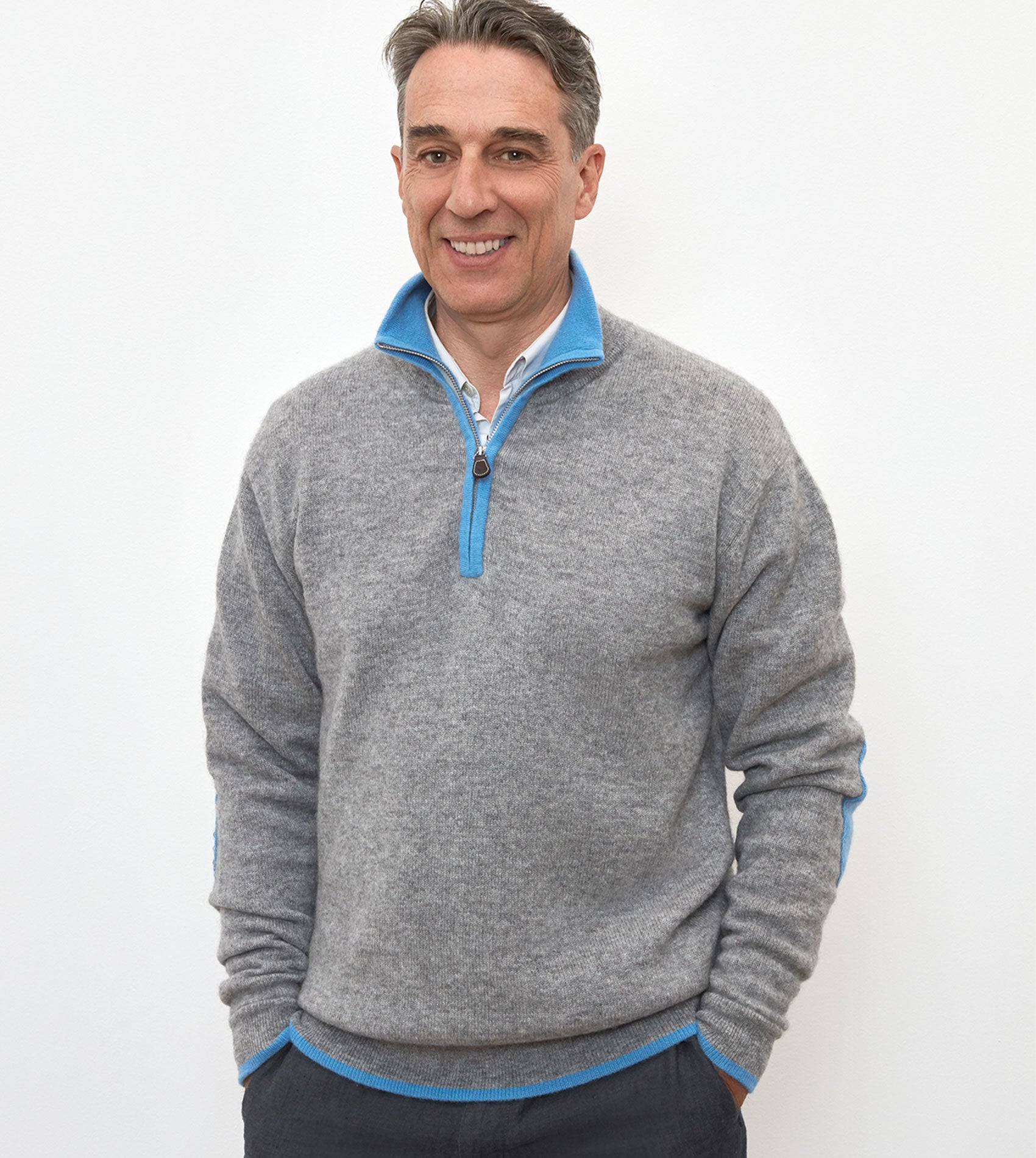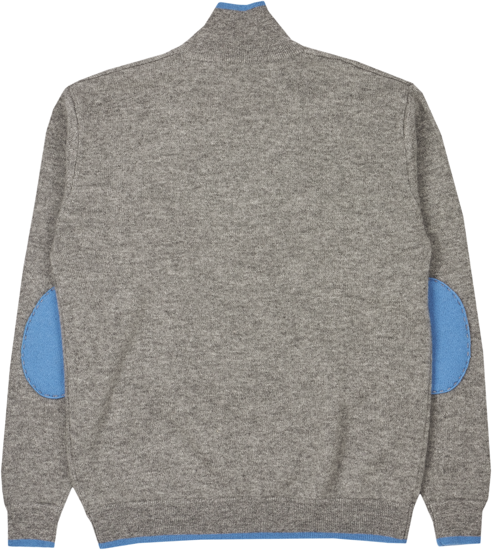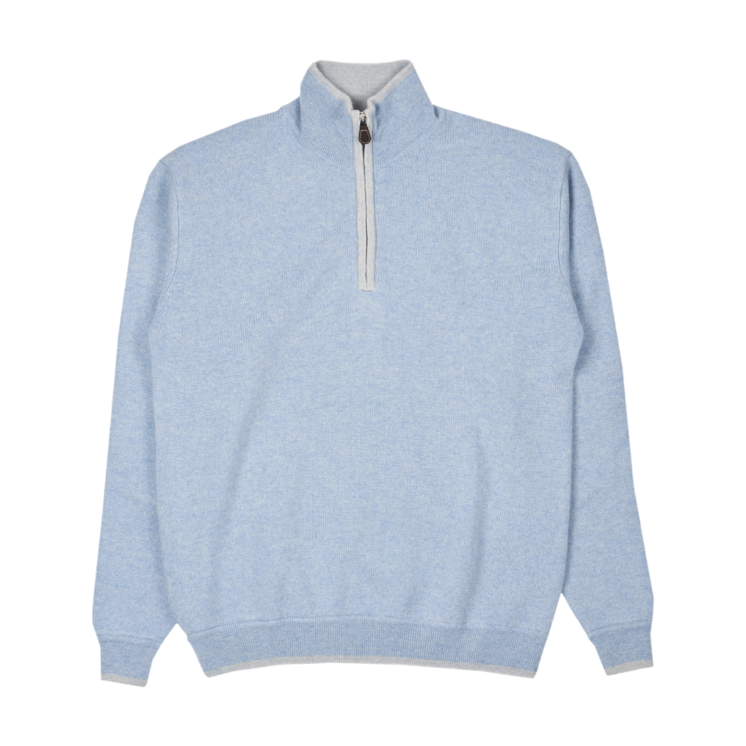 Our super-practical zip-neck jumper crafted from luxuriously soft Mongolian cashmere is always a favourite. Contrasting elbow patches and coloured tipping trim to the collar, zip, cuffs, and waist complete this perfect little package.