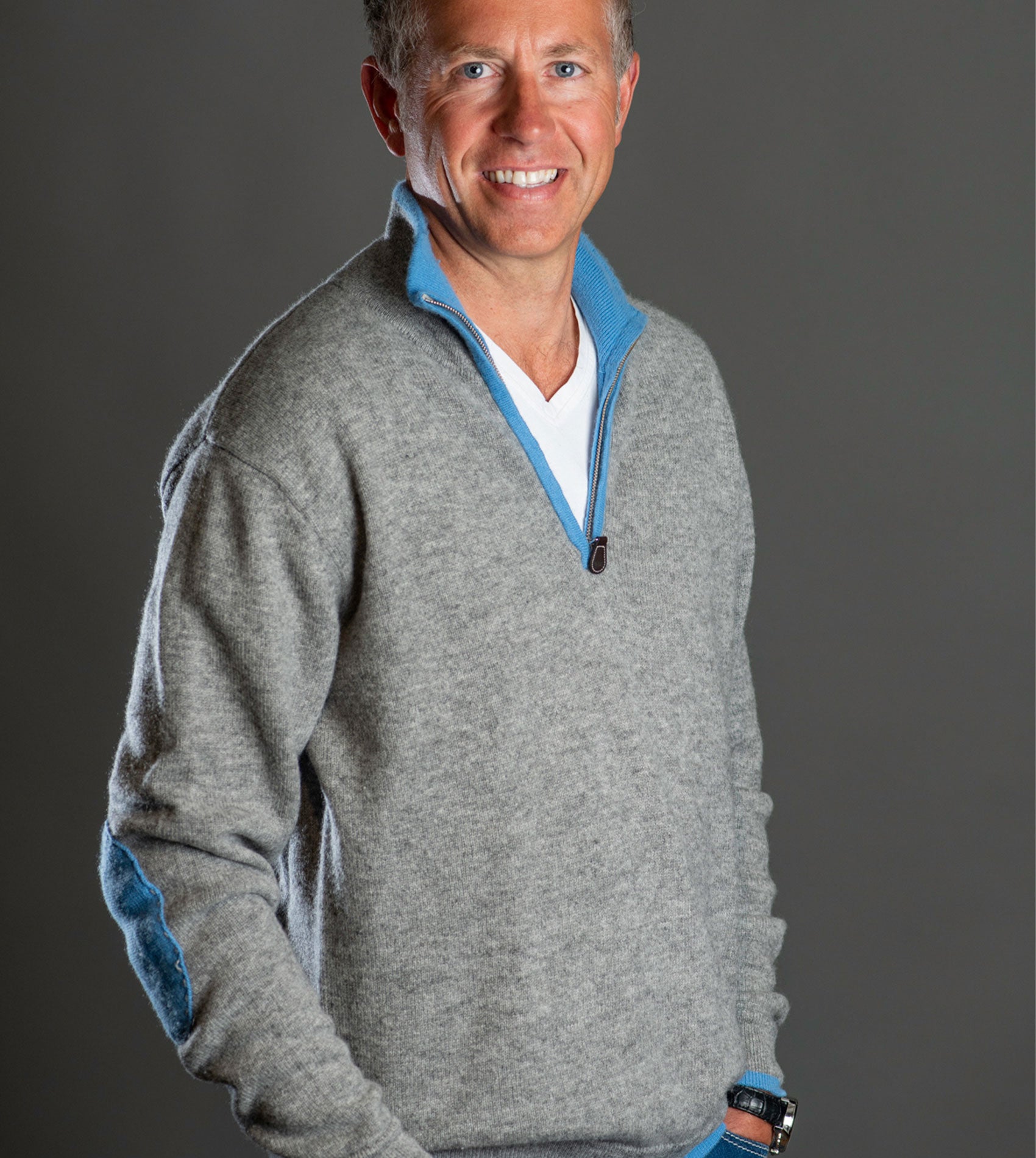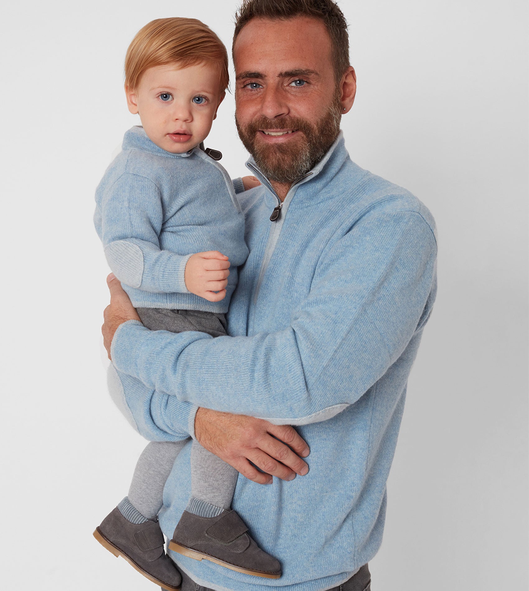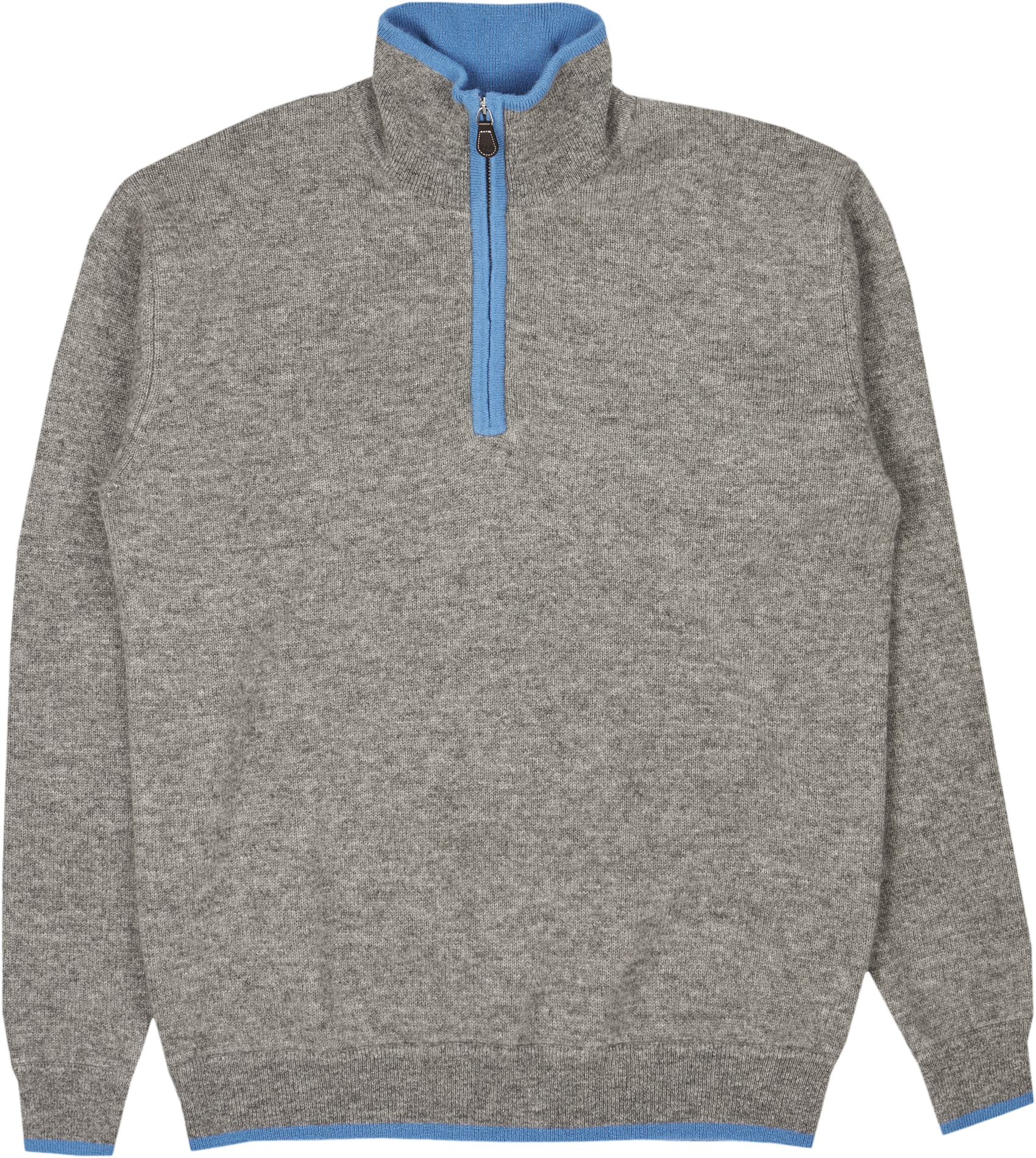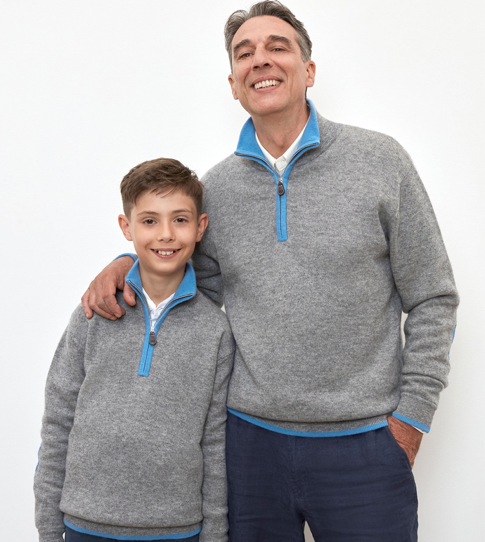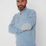 Our super-practical zip-neck jumper crafted from luxuriously soft Mongolian cashmere is always a favourite. Contrasting elbow patches and coloured tipping trim to the collar, zip, cuffs, and waist complete this perfect little package.