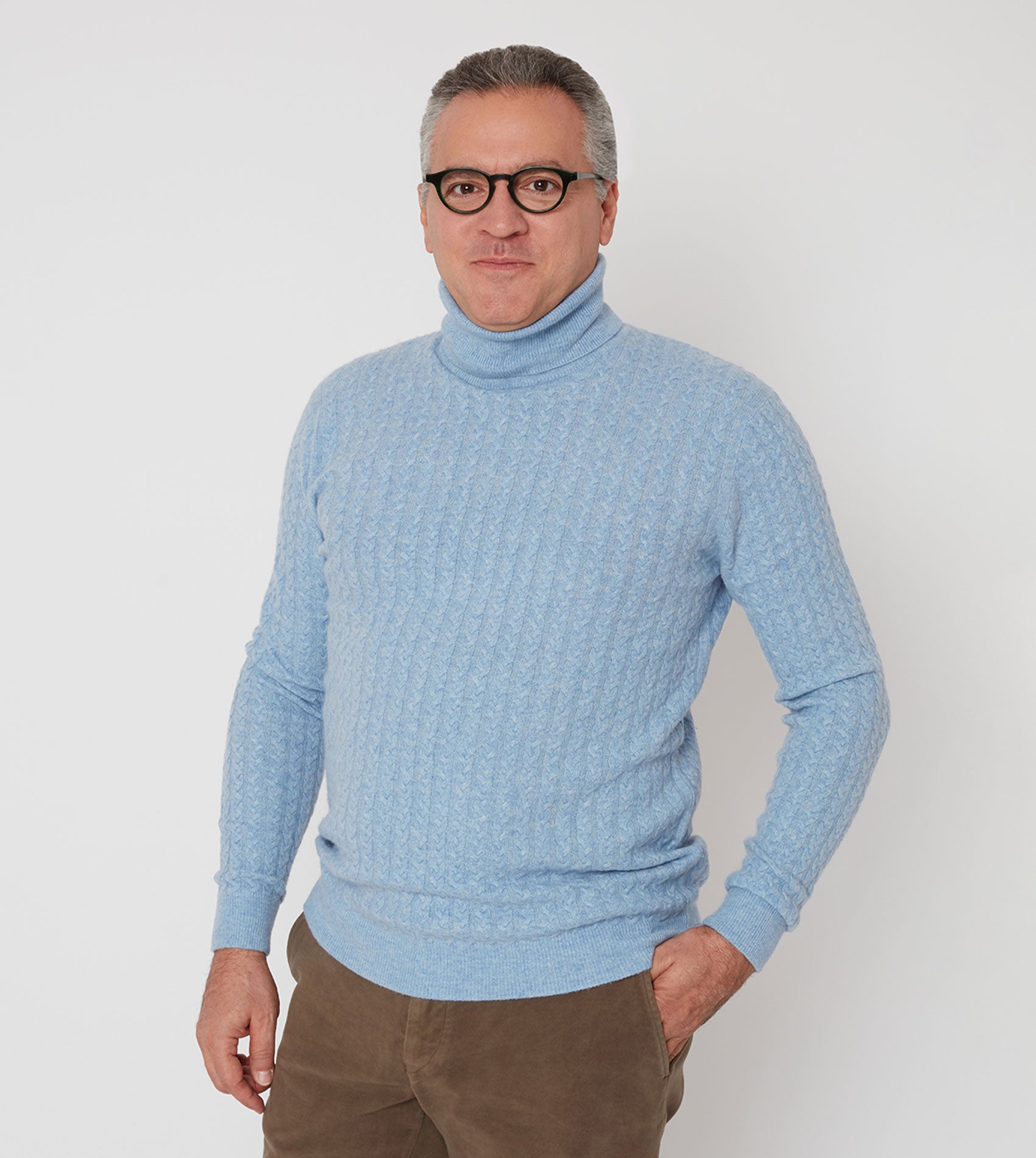 A men’s roll neck jumper in a classic cable knit design, crafted from 100% pure cashmere. Soft, warm, and naturally breathable, this versatile jumper combines timeless style with luxurious comfort for everyday wear.
