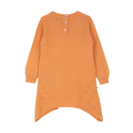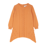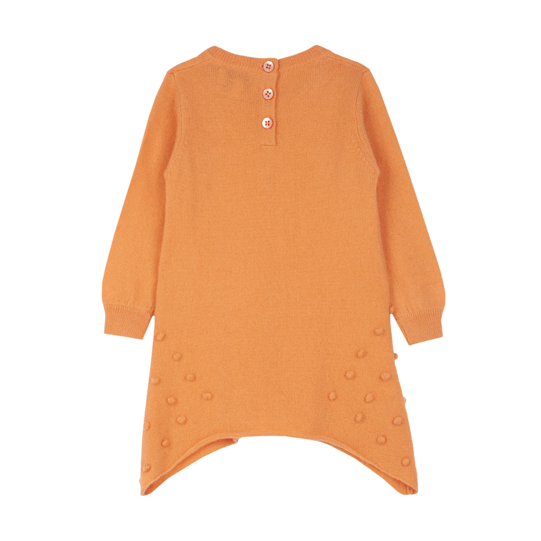 100% cashmere girl knitted dress with crew neck. Featuring long sleeves, a handkerchief hem and with a bobble effect down the center of the front, and also on the lower part of the sides. This knitted tunic should be worn with cashmere leggings or regular leggings will work well too. Available in baby and girl sizes.