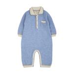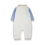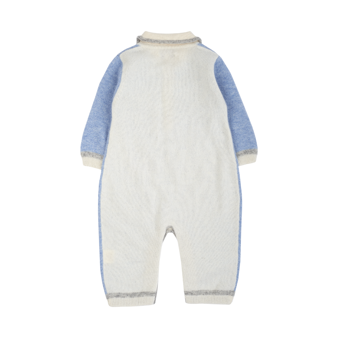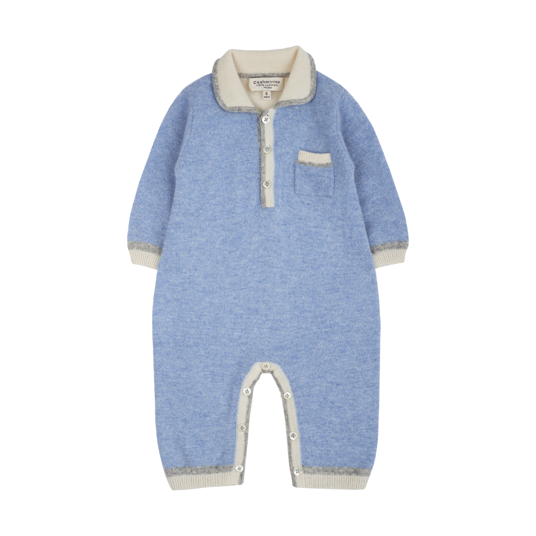 A long sleeve romper made from 100% cashmere which features contrasting colour border detail, a classic collar and a front pocket. The back panel contrasts the front. Ideal for casual or smart occasions.