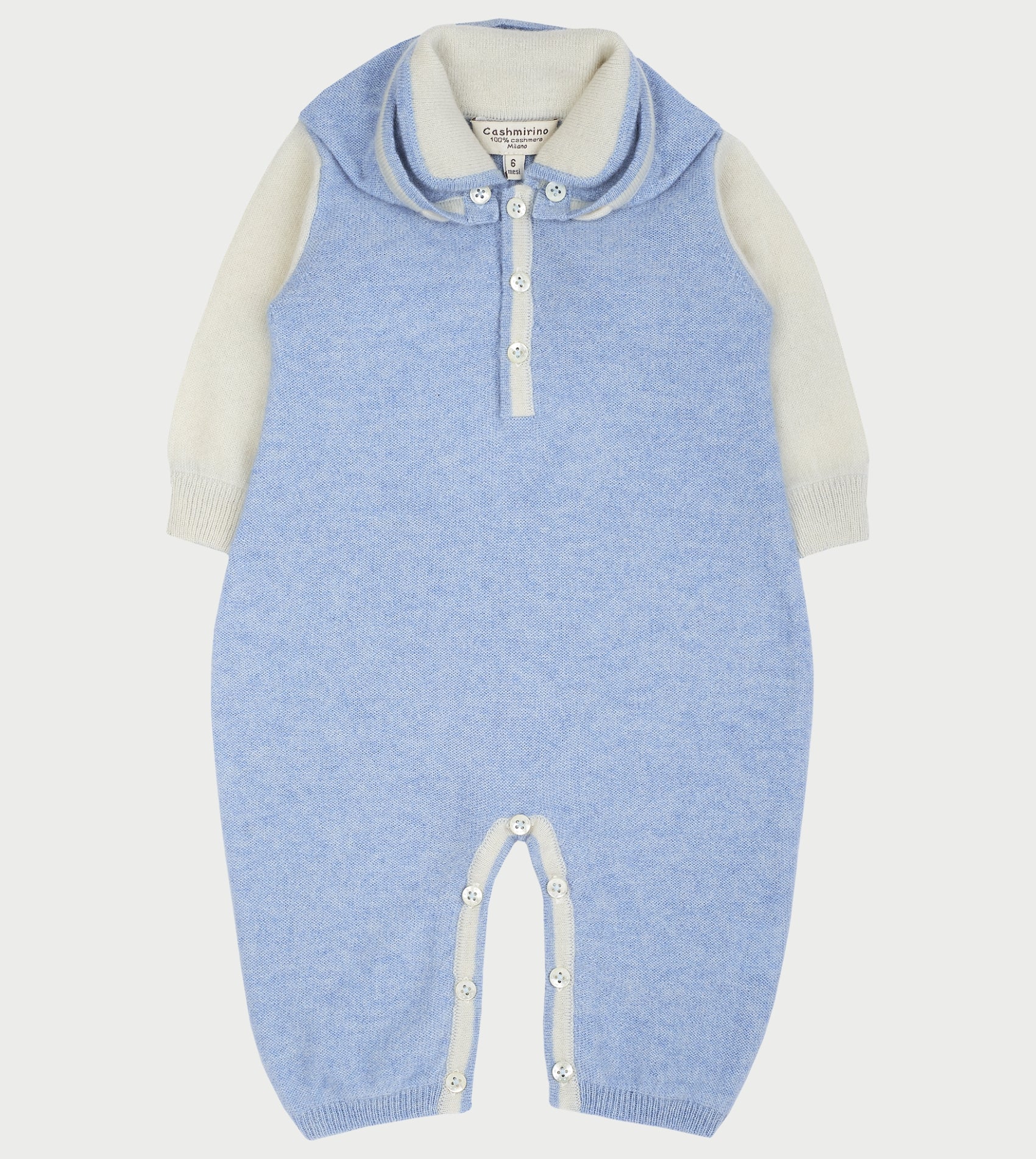 A cute baby boy romper made from 100% cashmere featuring a contrasting coloured classic collar, long sleeves and trim detail. A detachable teddy bear hood completes this look.