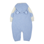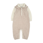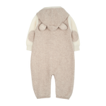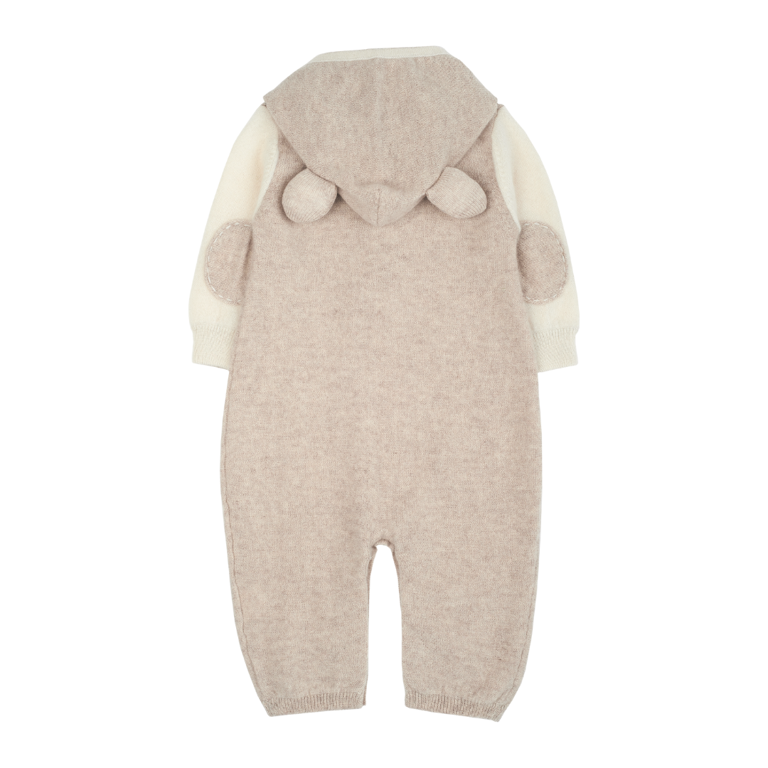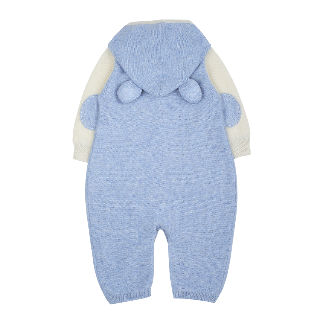 A cute baby boy romper made from 100% cashmere featuring a contrasting coloured classic collar, long sleeves and trim detail. A detachable teddy bear hood completes this look.