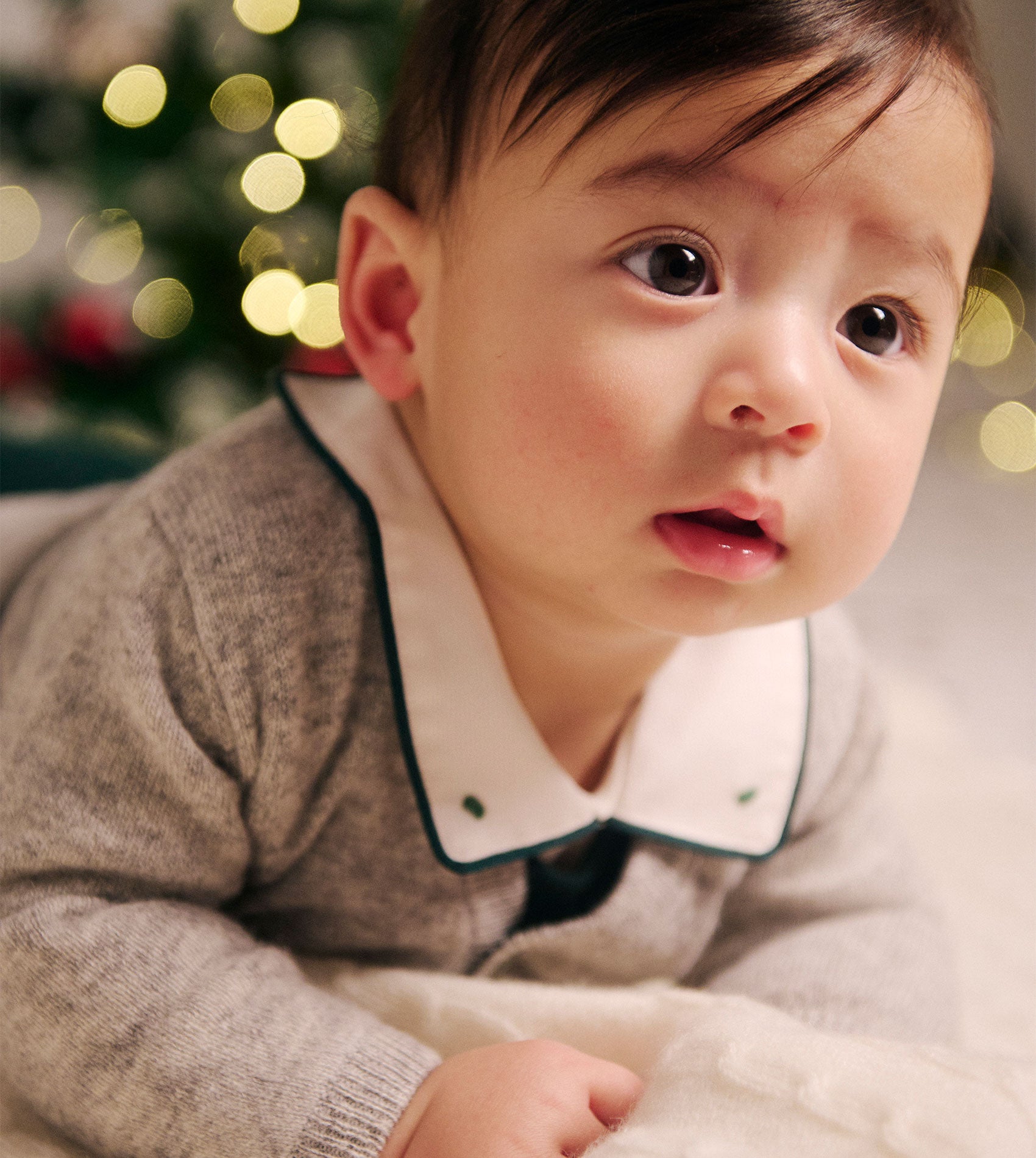 A baby boy long sleeve bodysuit made from luxuriously 100% soft Pima cotton featuring a contrasting classic collar with trim details. Popper and button fastening.