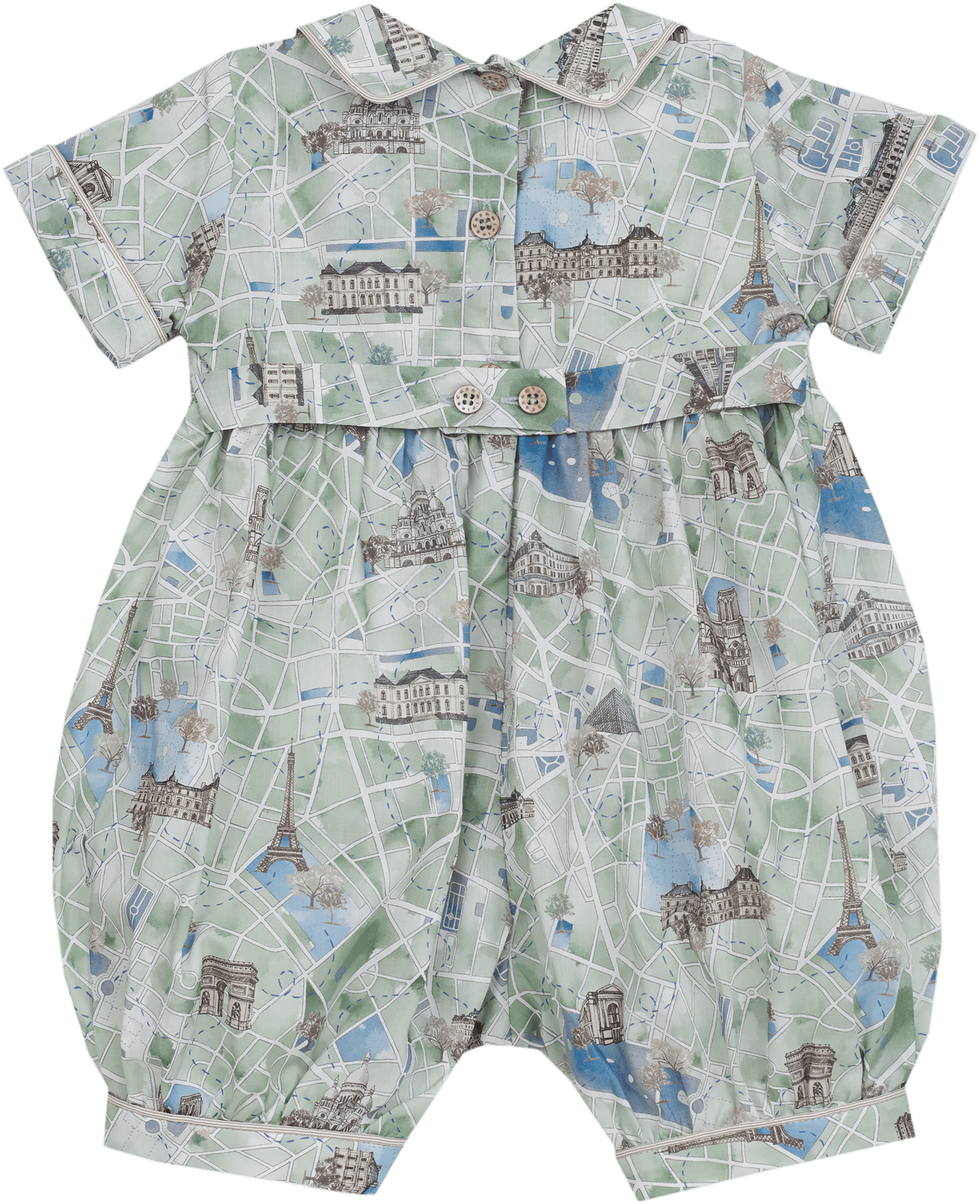 Whilst roaming the streets on a summer's day, your baby boy will feel relaxed and content with our Parisian inspired short sleeved. Made with Liberty fabrics. Featuring balloon shorts, a Peter pan collar, and a button opening making it super easy to put on. The Gustave romper also includes a back belt so this adorable romper can grow with your baby. We adore the intricate hand embroidered tree details on our classic smocked panel, crafted by our artisans. Lightweight and breathable, a must have holiday staple. This piece is perfect for all occasions and is available in various sizes and colours.