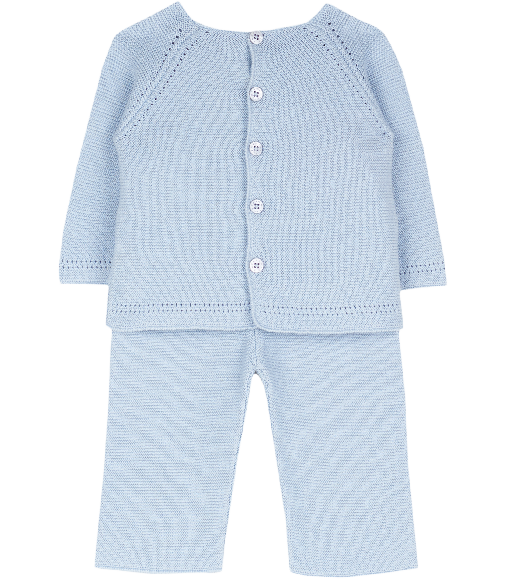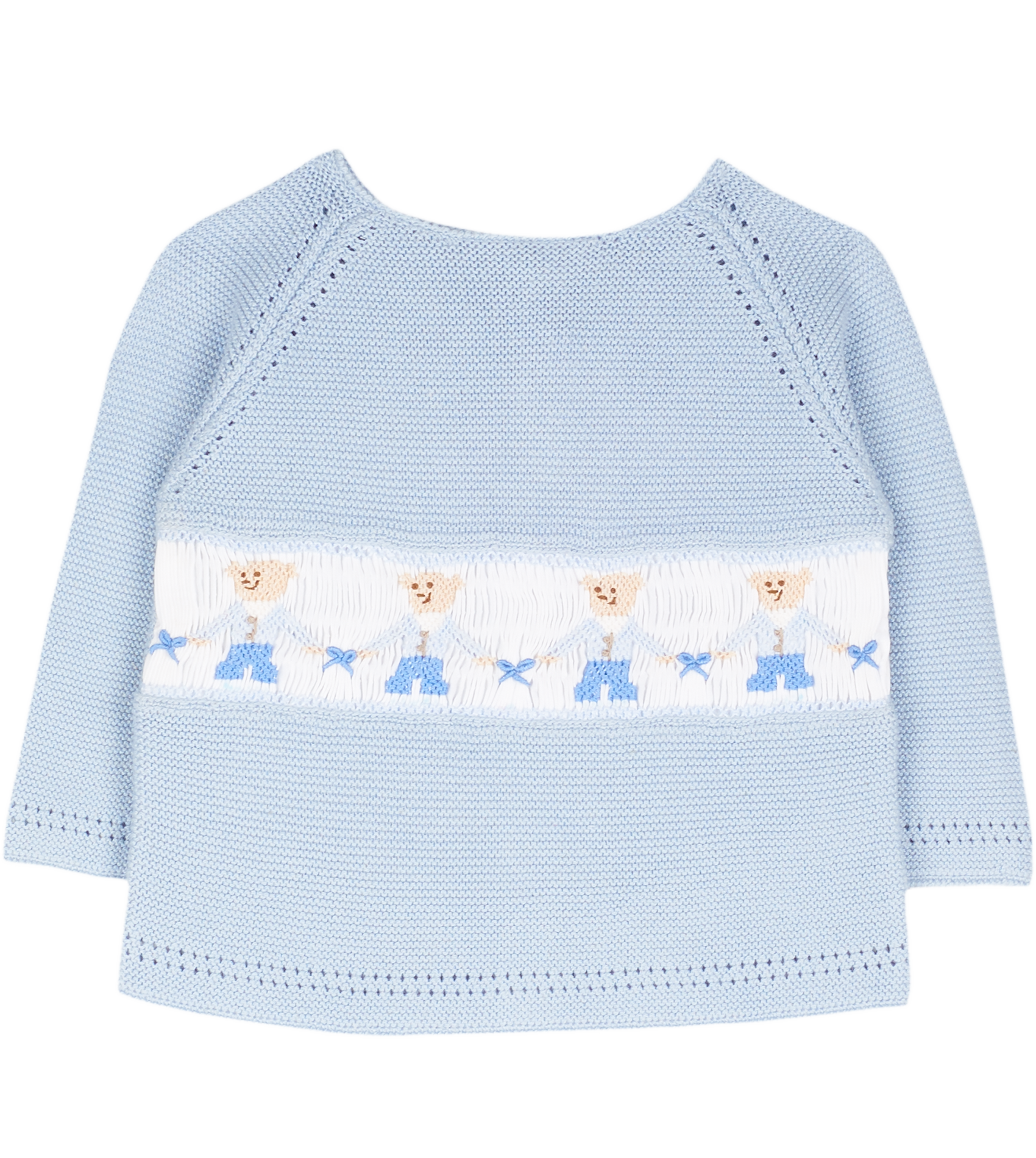 This cotton 2 part baby boy jumper and trouser set is beautifully crafted with a smocked and hand embroidered bear designed panel. The trouser waist is elasticated for ease and the jumper features button fastening at the back for added practicality. 70% Pima Cotton, 30% Modal. Naturally Hypoallergenic.
