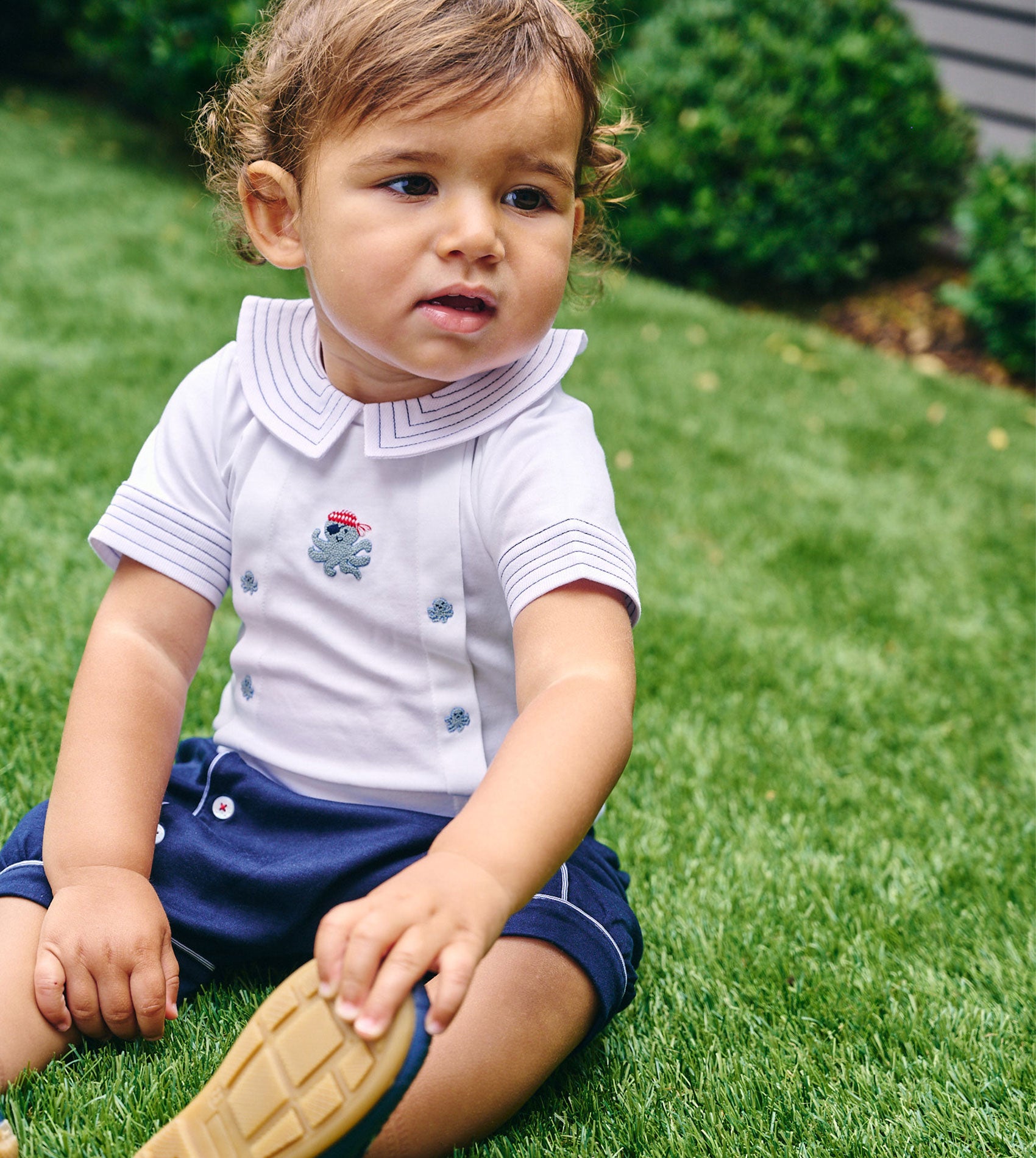 Aye Aye Captain! The Orlando Set is set to sail with intricately hand embroidered octopuses in light Pima Cotton. It features sailor shorts with contrast stitching, buttons and a delightfully designed collar. This set can be paired with a matching embroidered bib, sold separately, to give a finished wholesome look on a warm day.