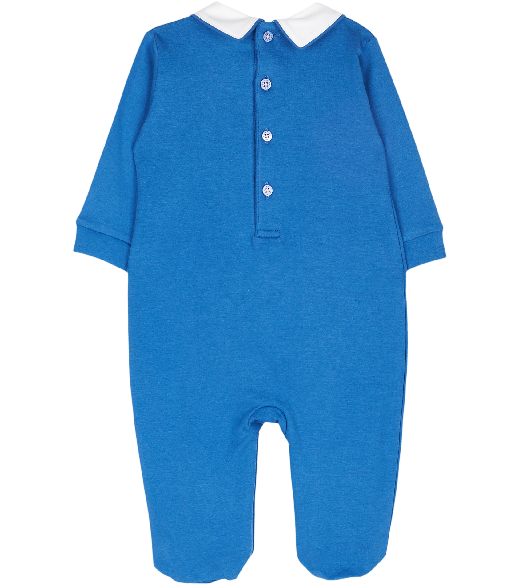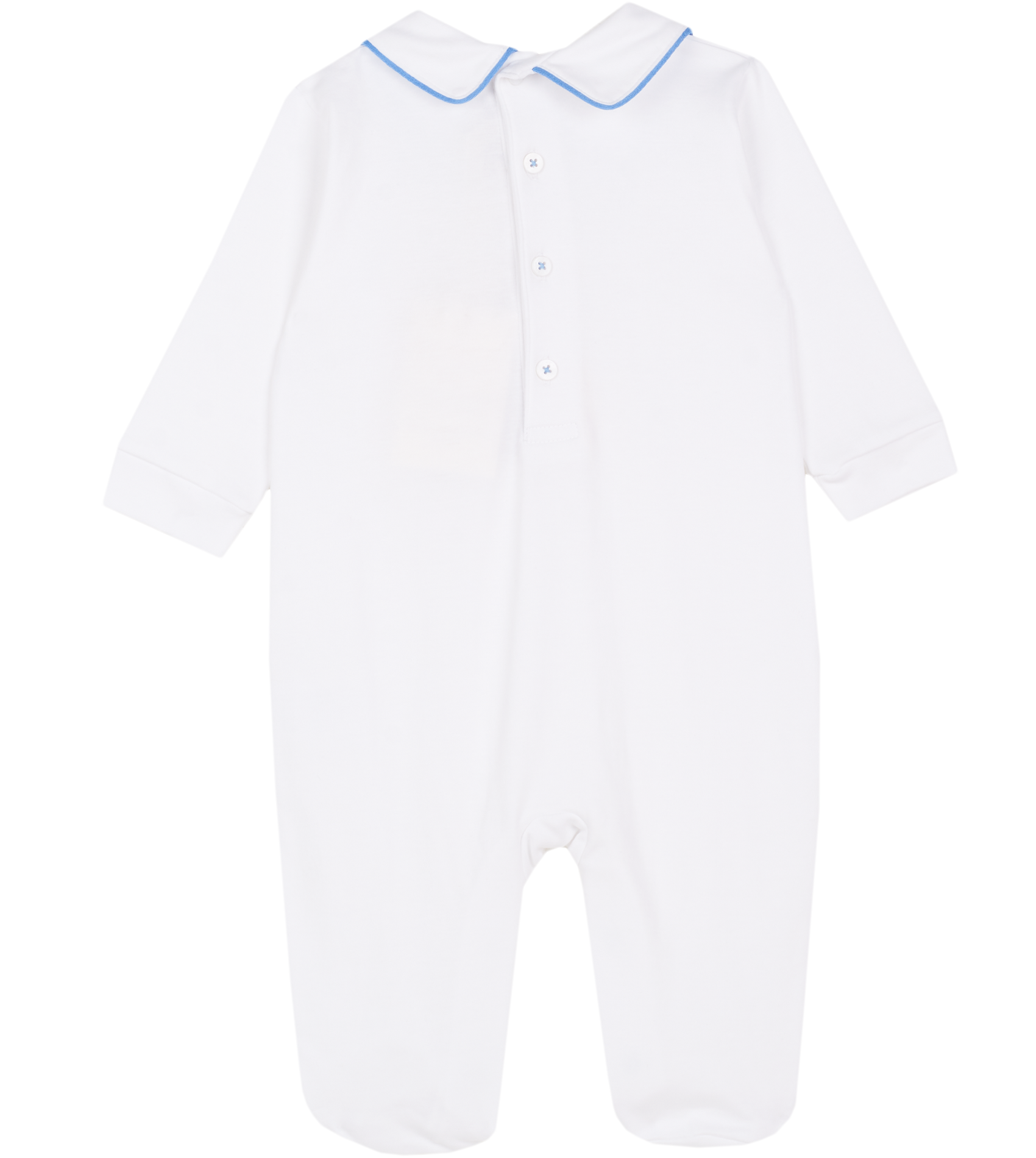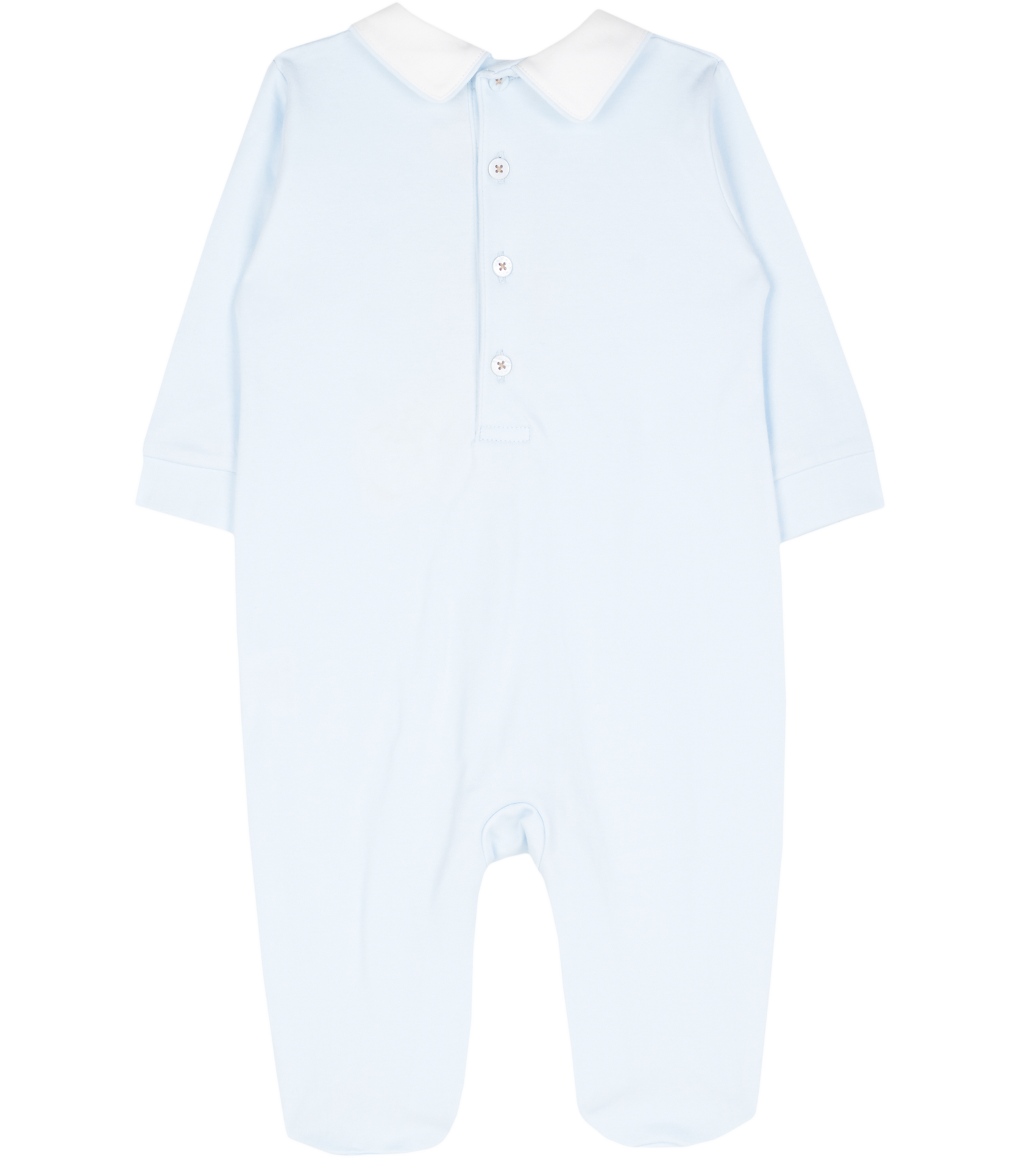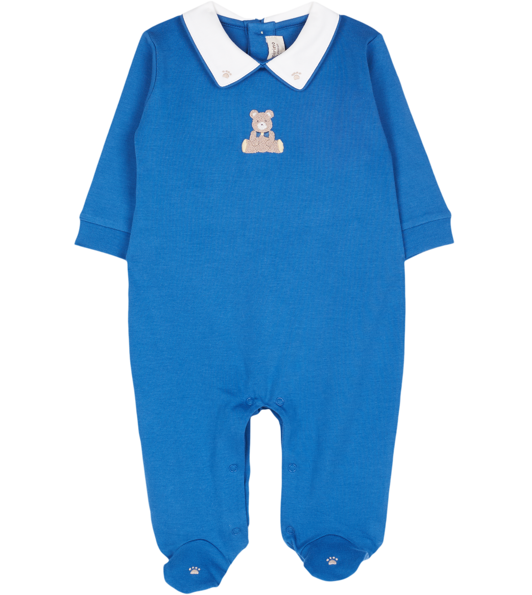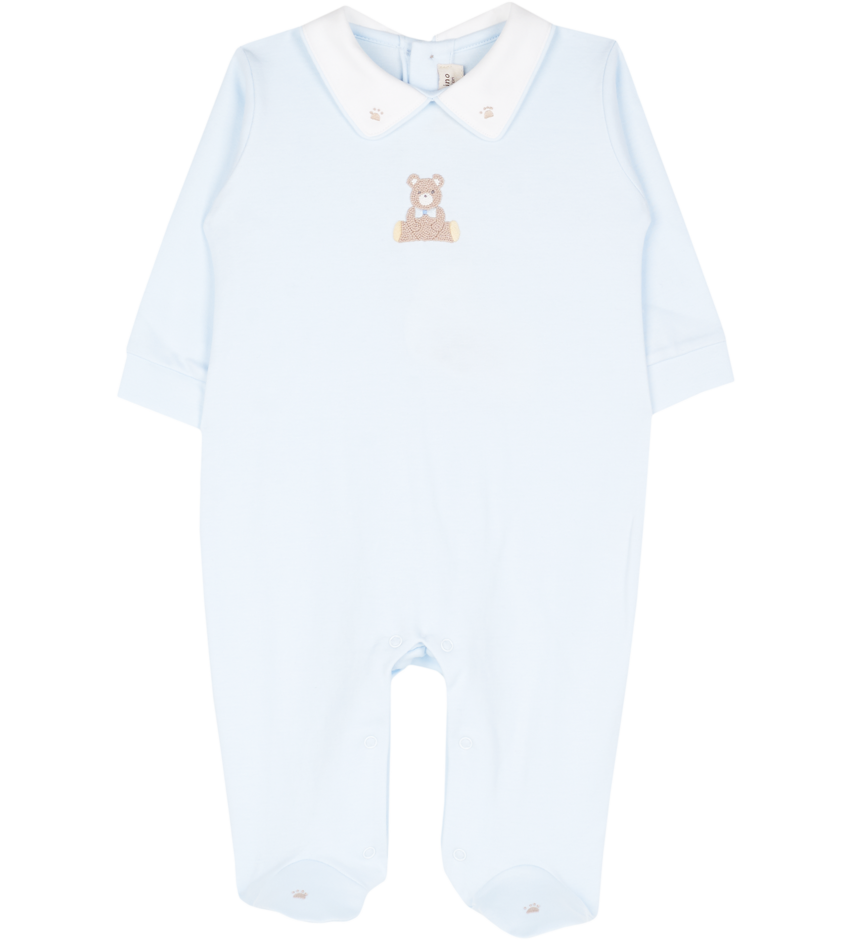 This adorable babygro features a sweet bear, lovingly embroidered by hand, showing our dedication to craftsmanship and care. With little teddy bear paws on their feet and collar, it's perfect for their crawling adventures and peaceful dreams at bedtime.