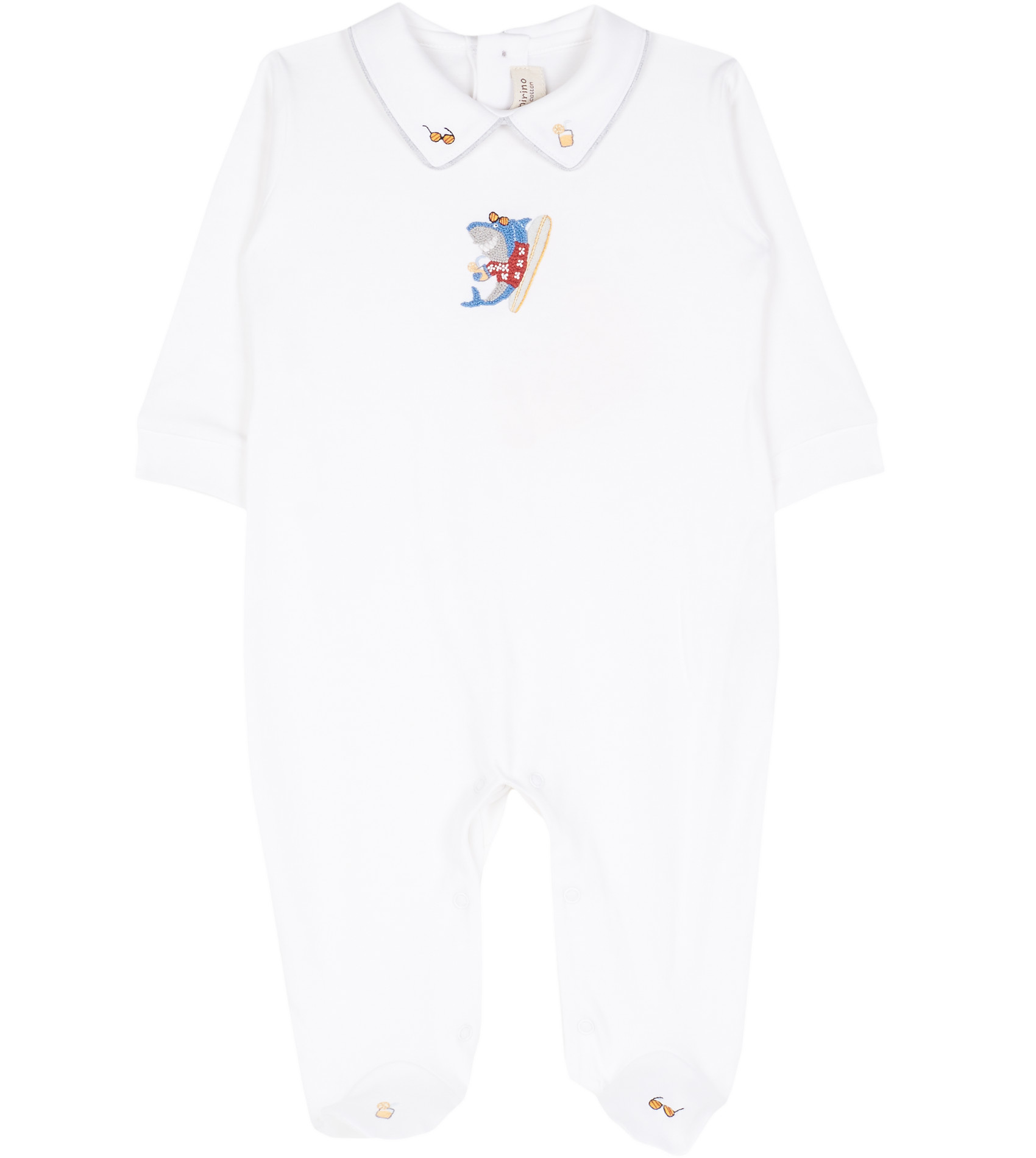This darling Babygro features a shark savouring lemonade, intricately embroidered by hand, reflecting our dedication to craftsmanship and affection. Adorned with tiny hand-embroidered lemonade and sunglasses motifs on their feet and collar, it's perfect for their playful crawls and peaceful slumbers, ensuring comfort and style for every adventure.