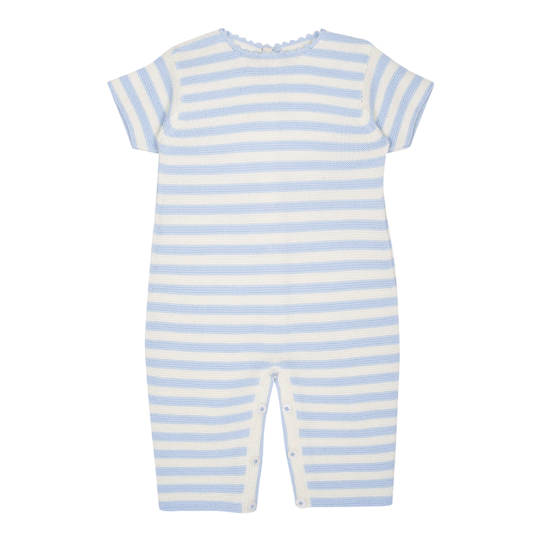 Knitted from a breathable blend of 80% Pima cotton and 20% modal, this romper offers natural softness with a lightweight feel, perfect for delicate skin. Featuring cheerful candy stripes, short sleeves, and button fastenings for easy dressing, it’s a charming choice for summer outings, whether at the playground or seaside.