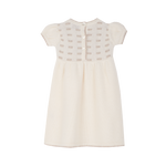 This elegant dress is made from 100% cashmere, offering softness and luxury. The short puff sleeves and textured check pattern on the upper bodice add a touch of charm to the simple, classic design. The flowy silhouette and delicate detailing make it perfect for both casual and formal occasions, providing comfort without compromising on style.