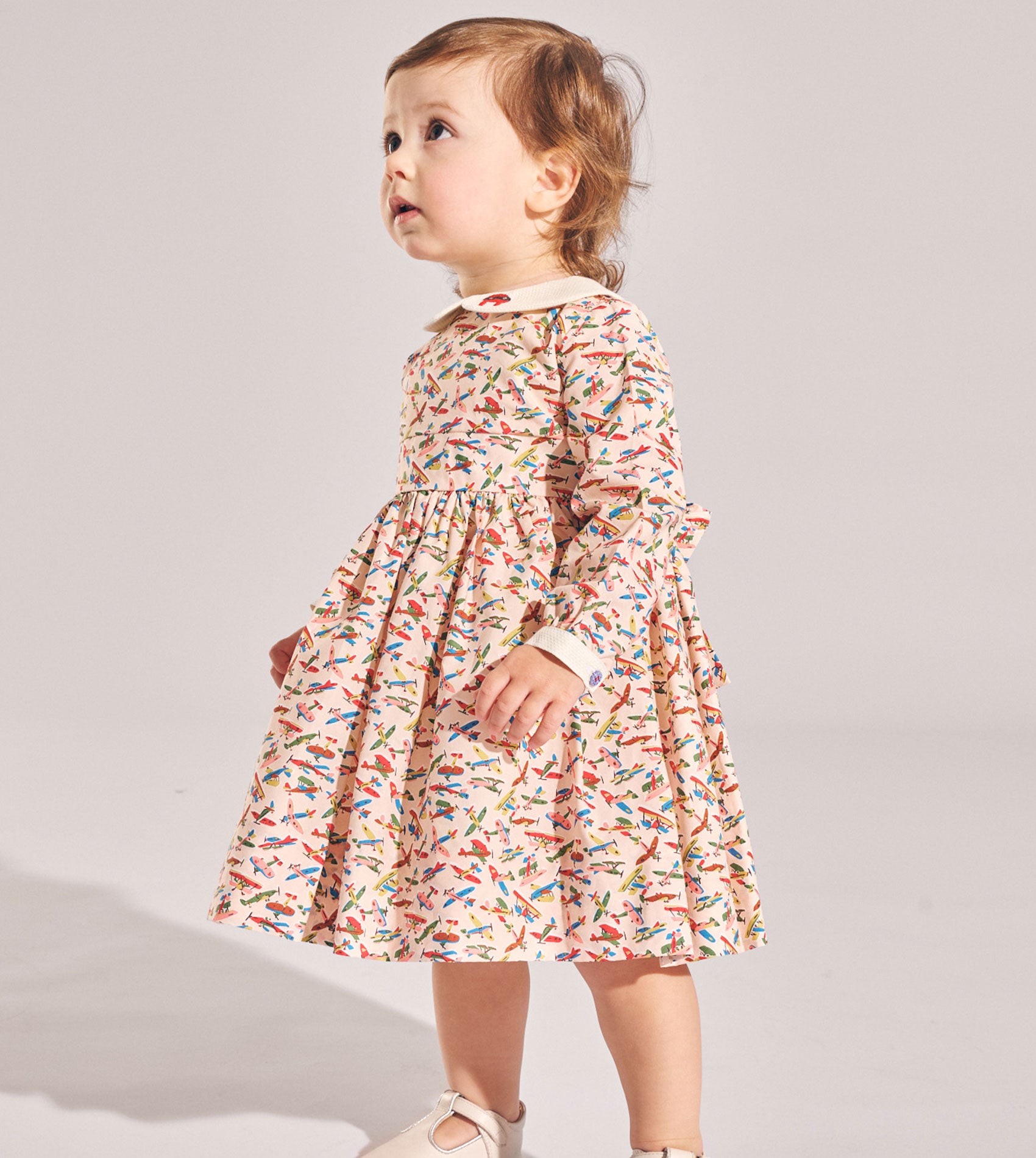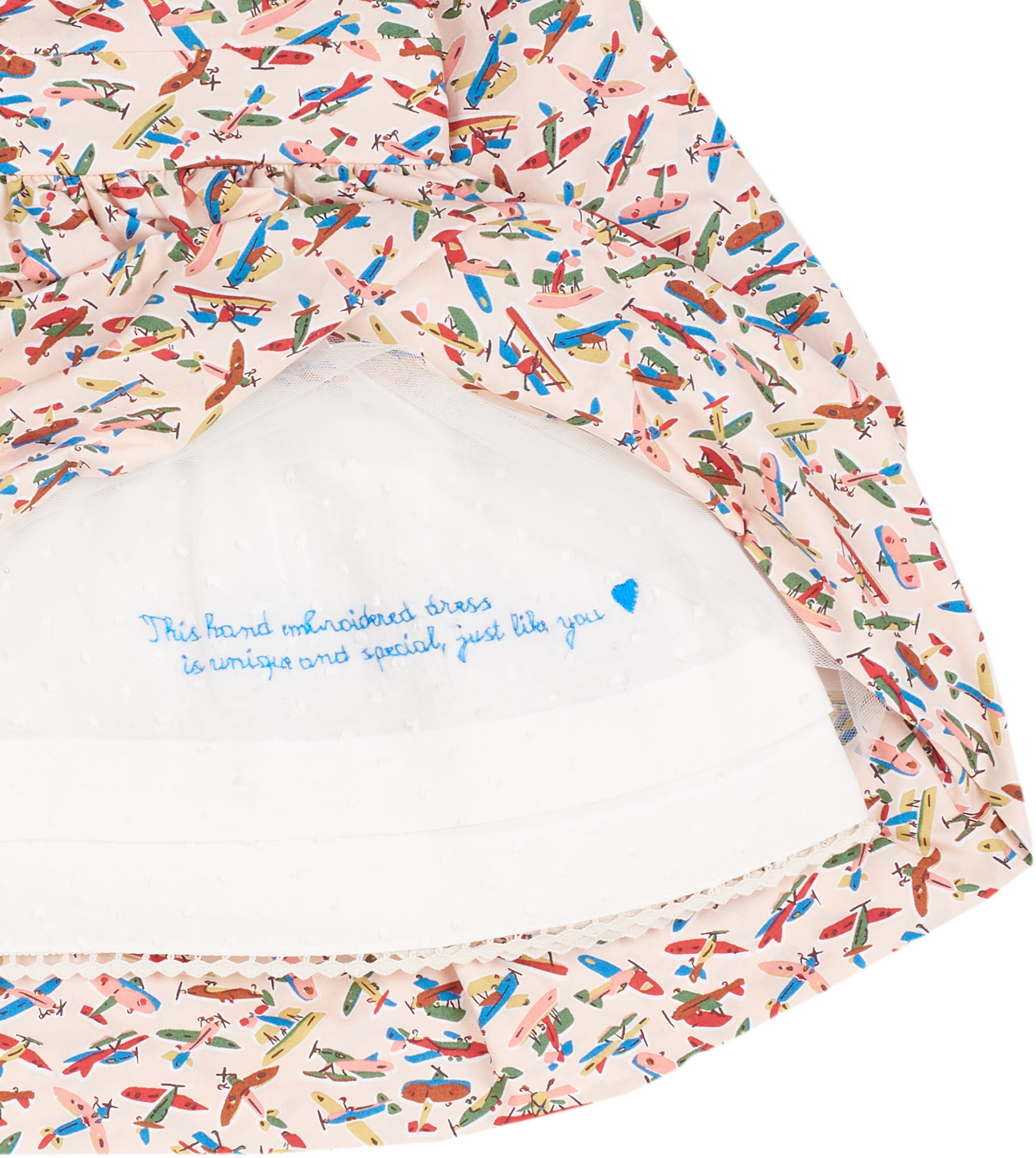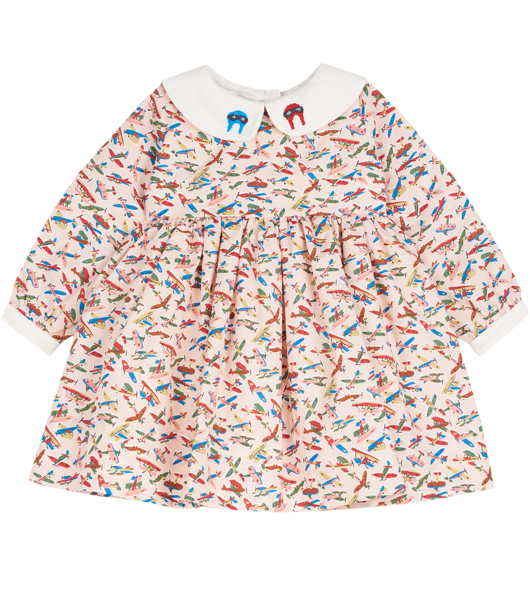 A standout feature of this dress is its hand-embroidered Peter Pan collar, adorned with two meticulously stitched pilot helmets, adding a unique and playful touch. The contrasting cotton pique collar and cuffs provide an elegant frame to the detailed print, while the long sleeves offer a polished look suited for cooler seasons.