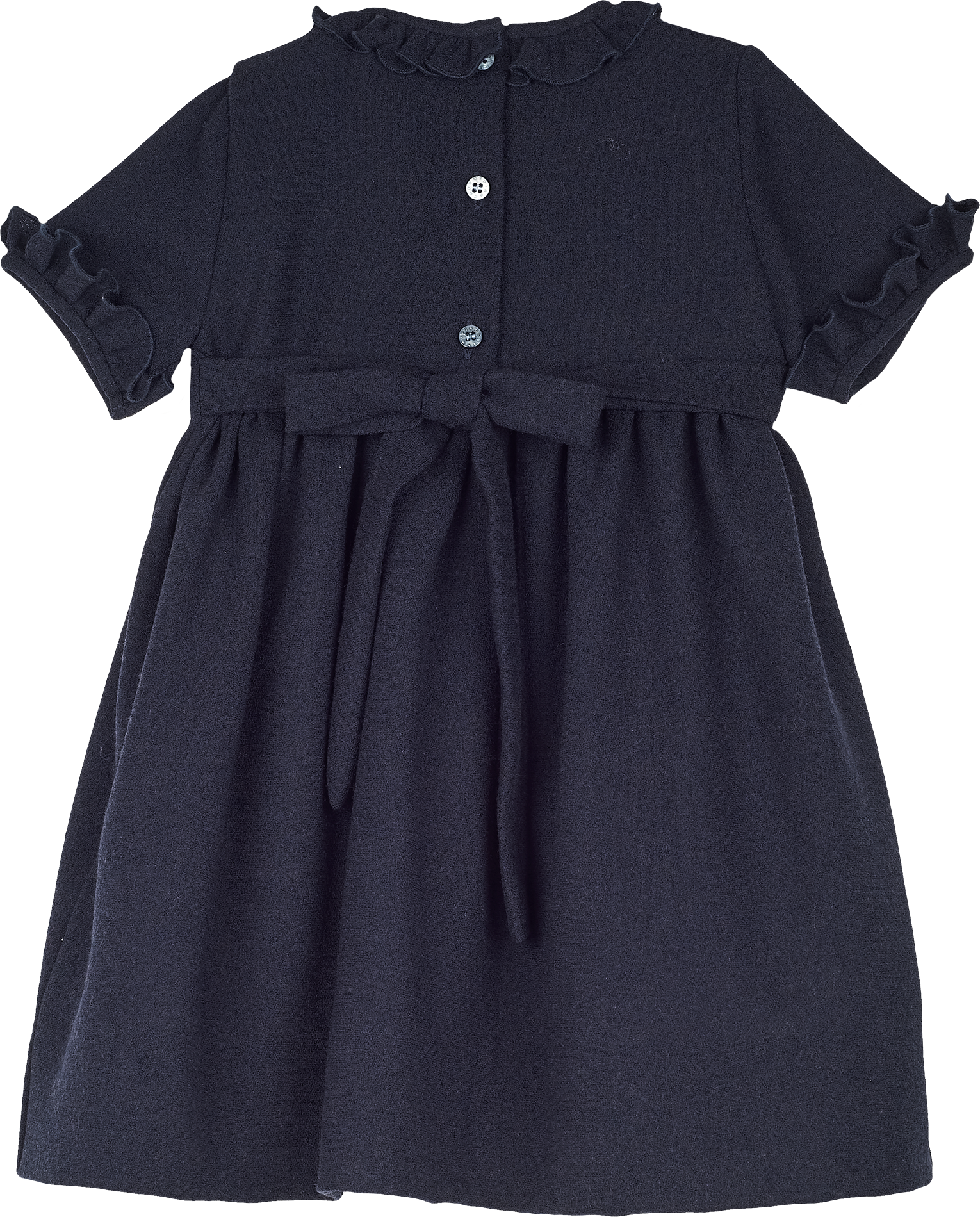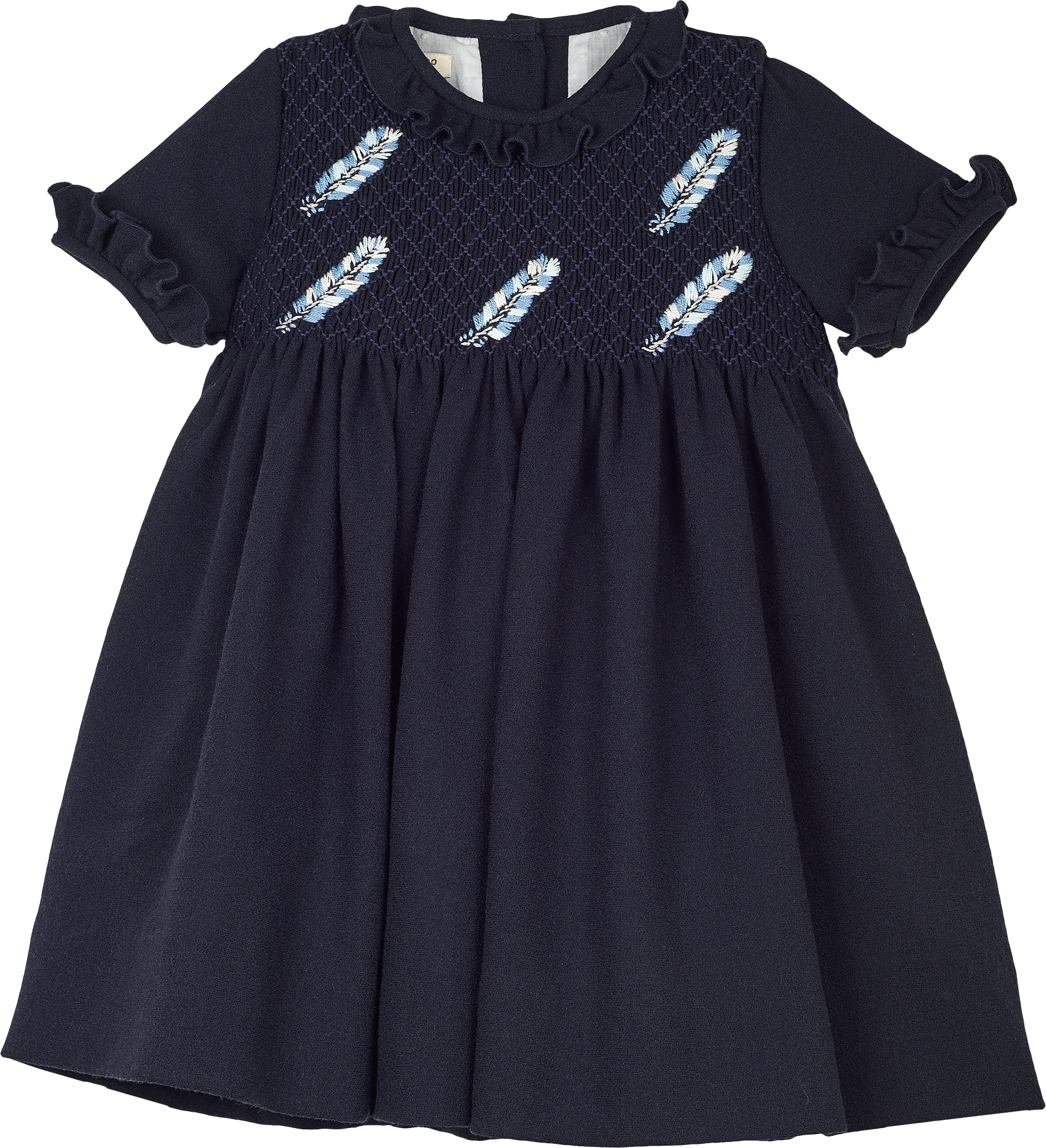 Discover an incredibly sweet baby girl dress crafted from 100% pure wool, featuring a beautiful front smocked panel and delicate hand-embroidered feathers. This midi-length dress is detailed with a frill collar and sleeves, a buttoned back with a stylish back tie, and a soft 100% cotton lining for comfort.