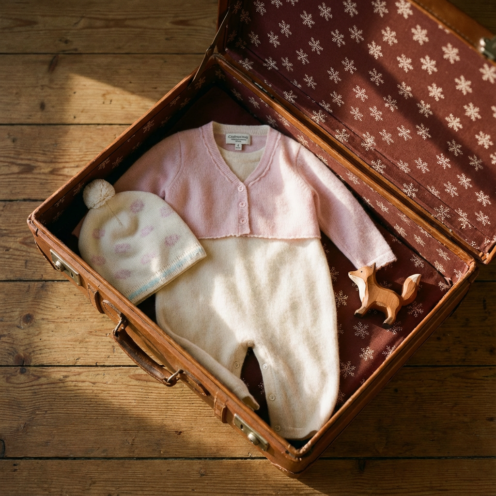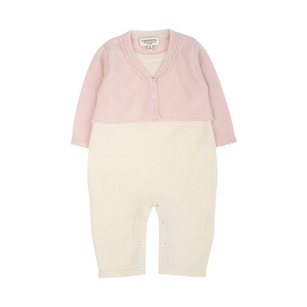 A baby girl romper made from 100% cashmere featuring an attached cardigan with a crochet collar and long sleeves.