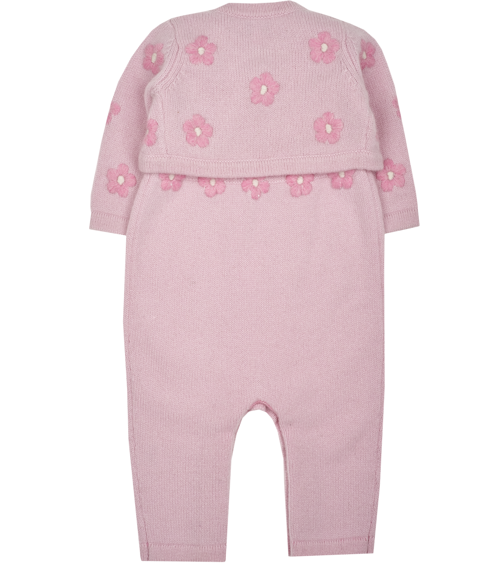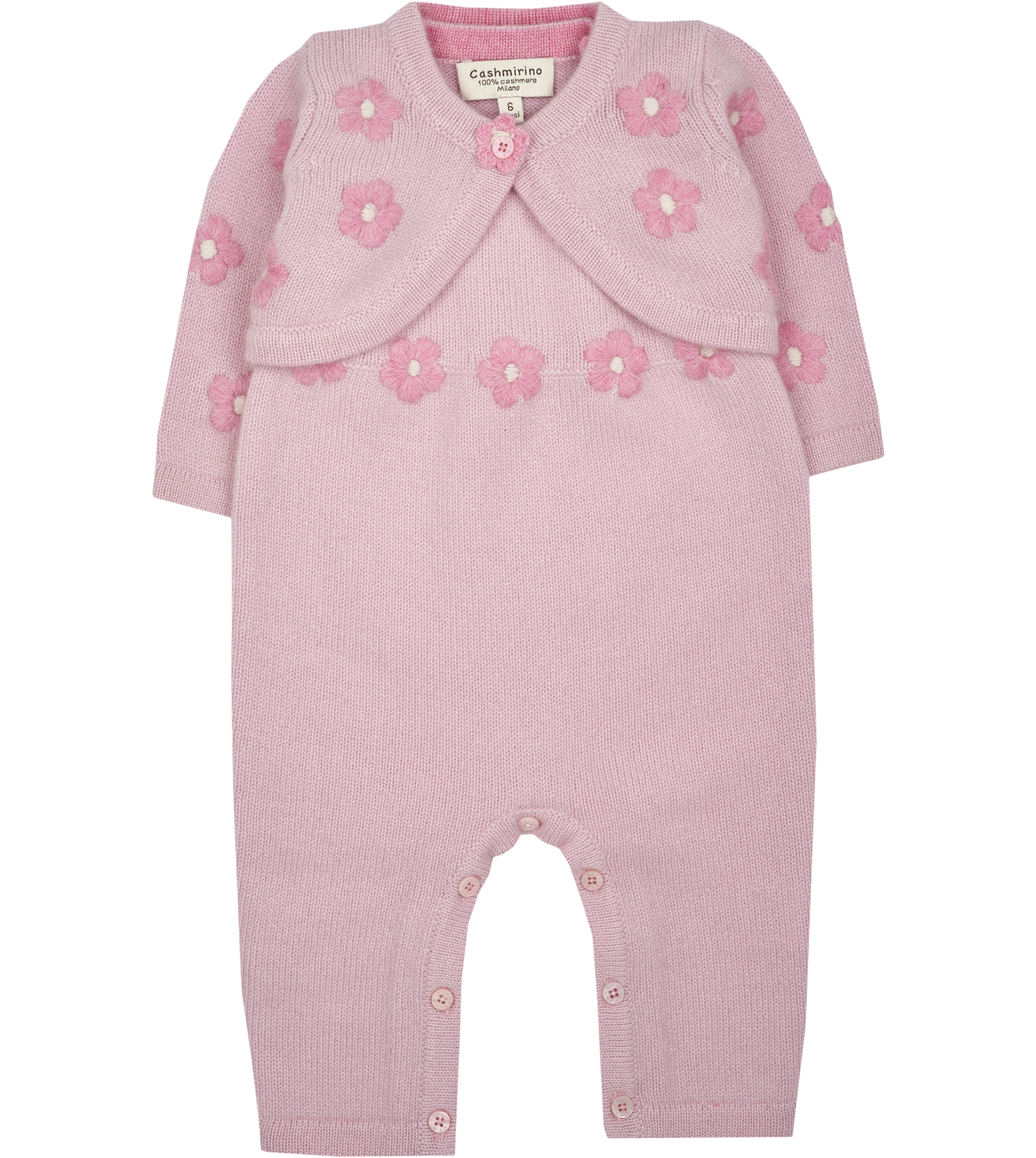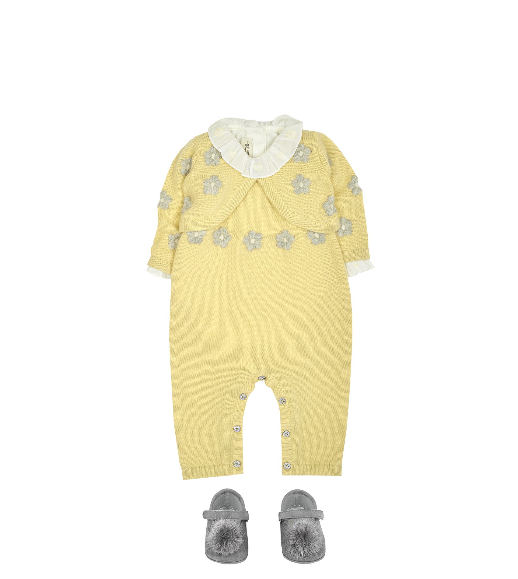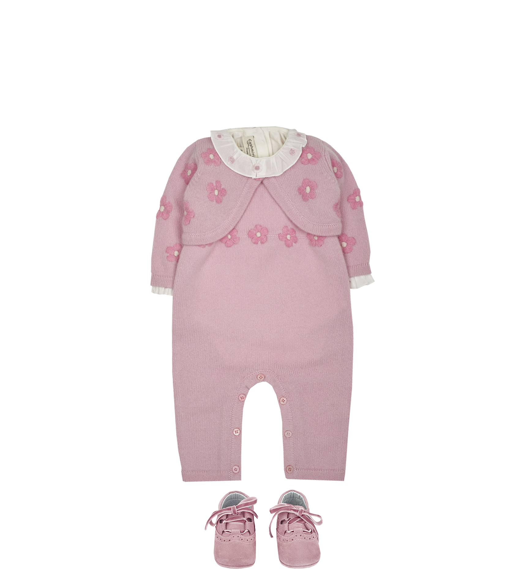A 100% cashmere baby girl romper set with floral detailing on each shoulder. Featuring button fastening, a round neck, and knitted flowers on the shrug.