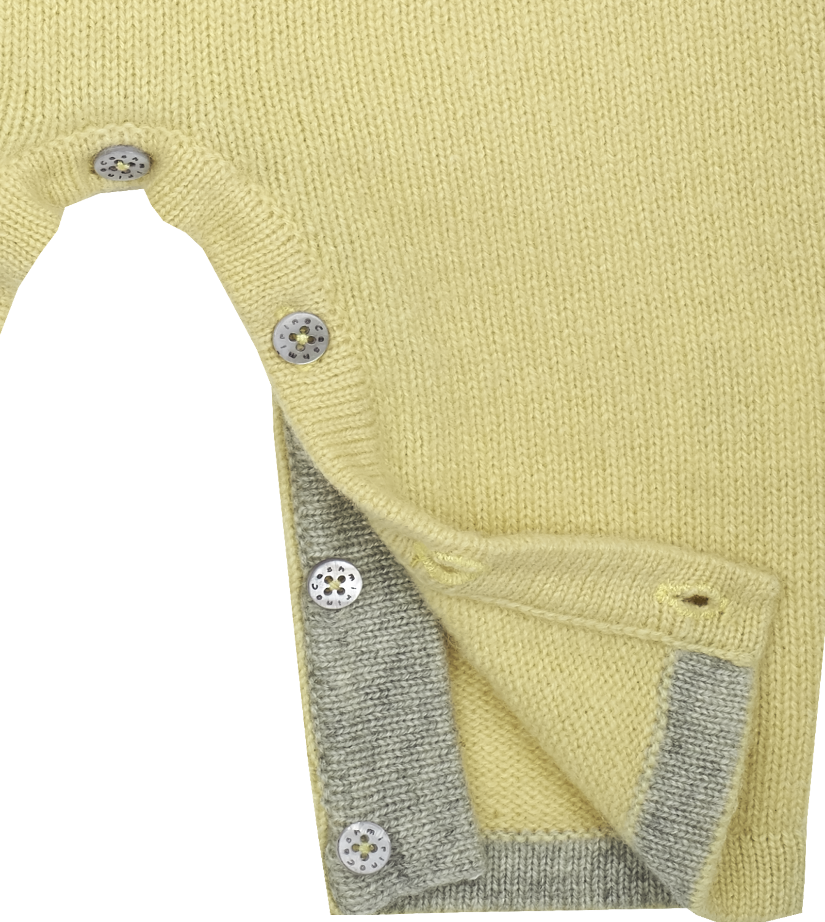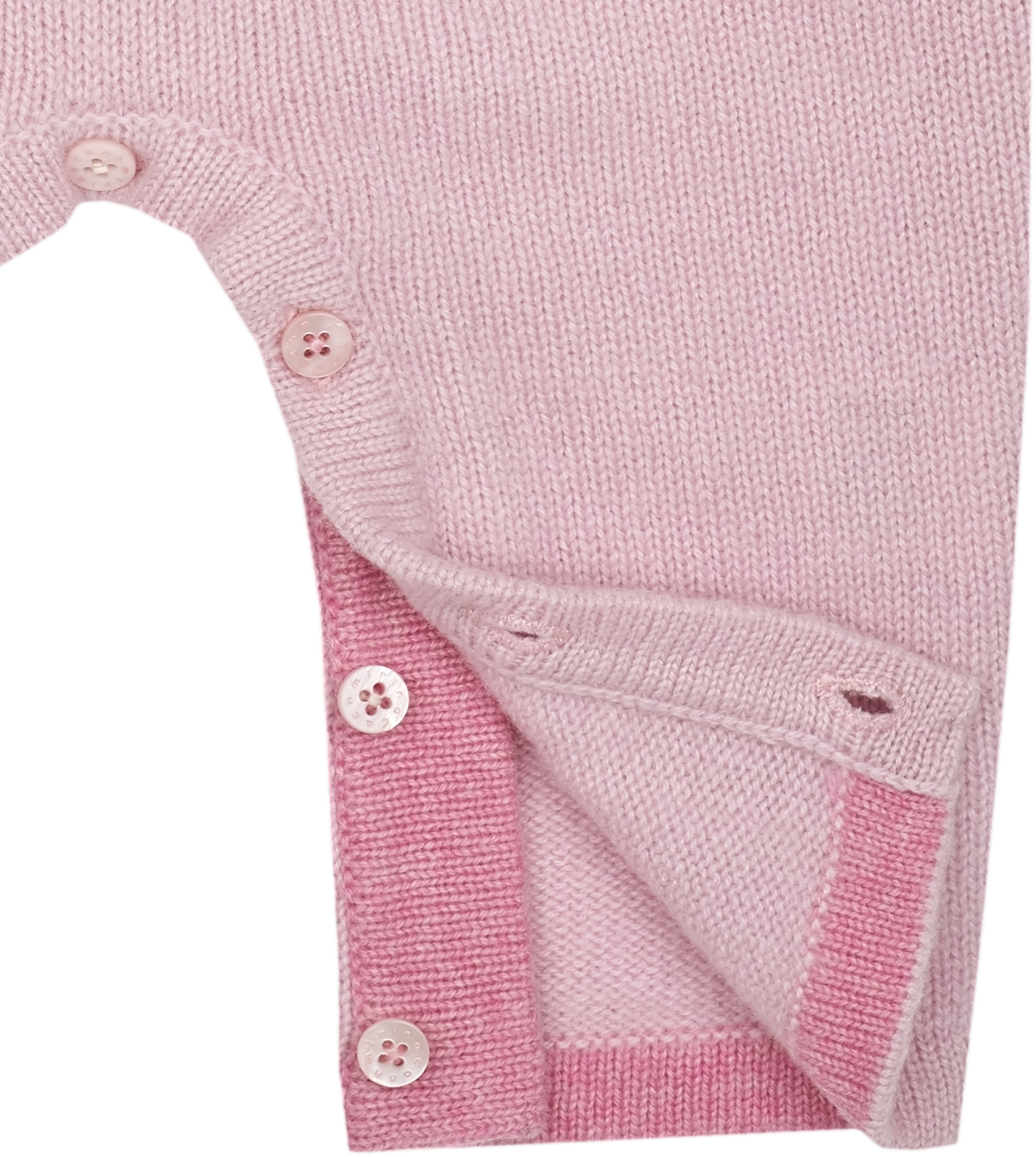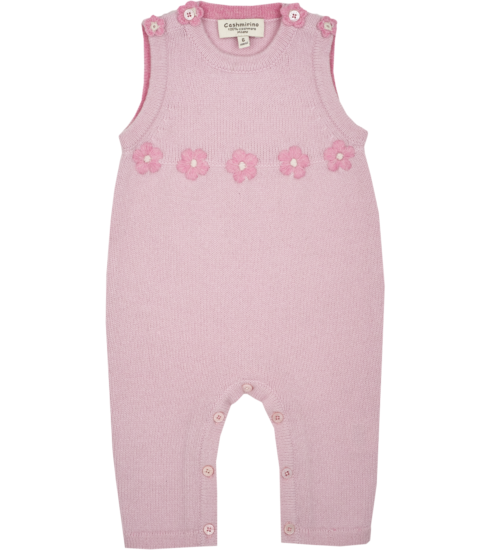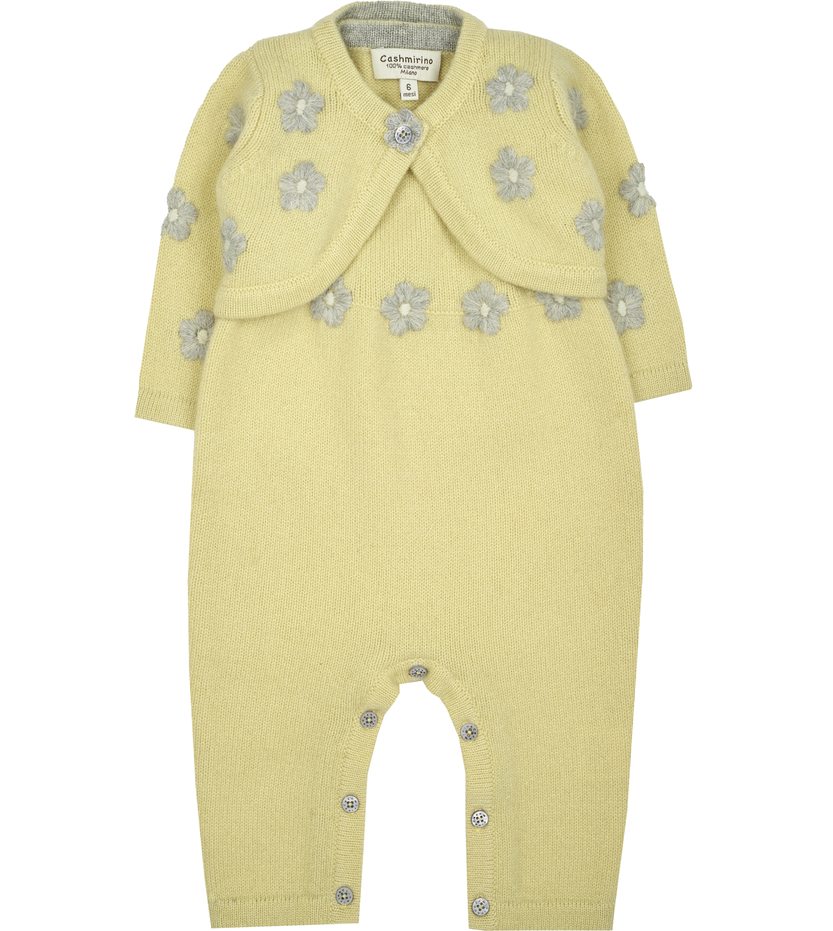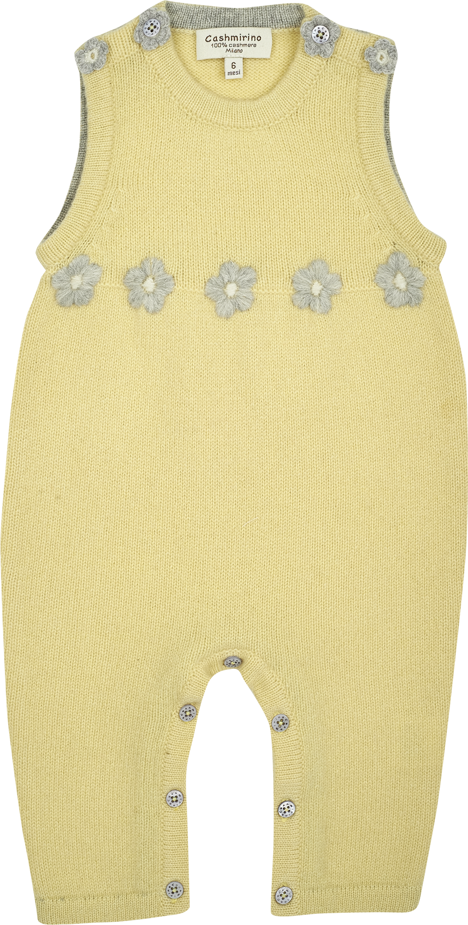 A 100% cashmere baby girl romper set with floral detailing on each shoulder. Featuring button fastening, a round neck, and knitted flowers on the shrug.