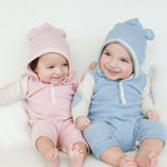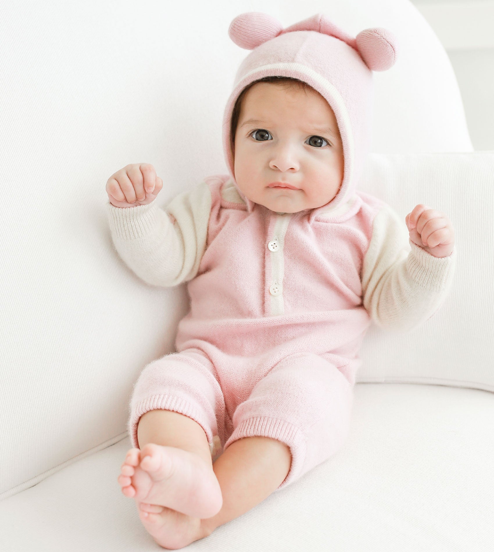 A cute baby girl romper made from 100% cashmere featuring a contrasting coloured classic collar, long sleeves and trim detail. A detachable teddy bear hood completes this look.