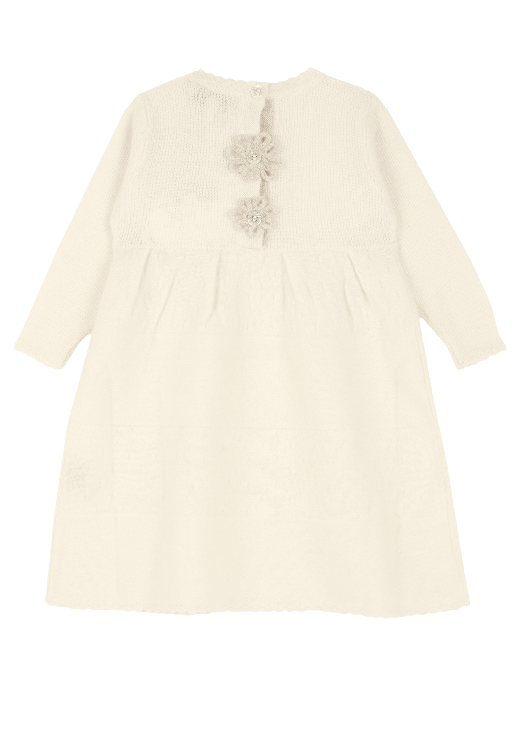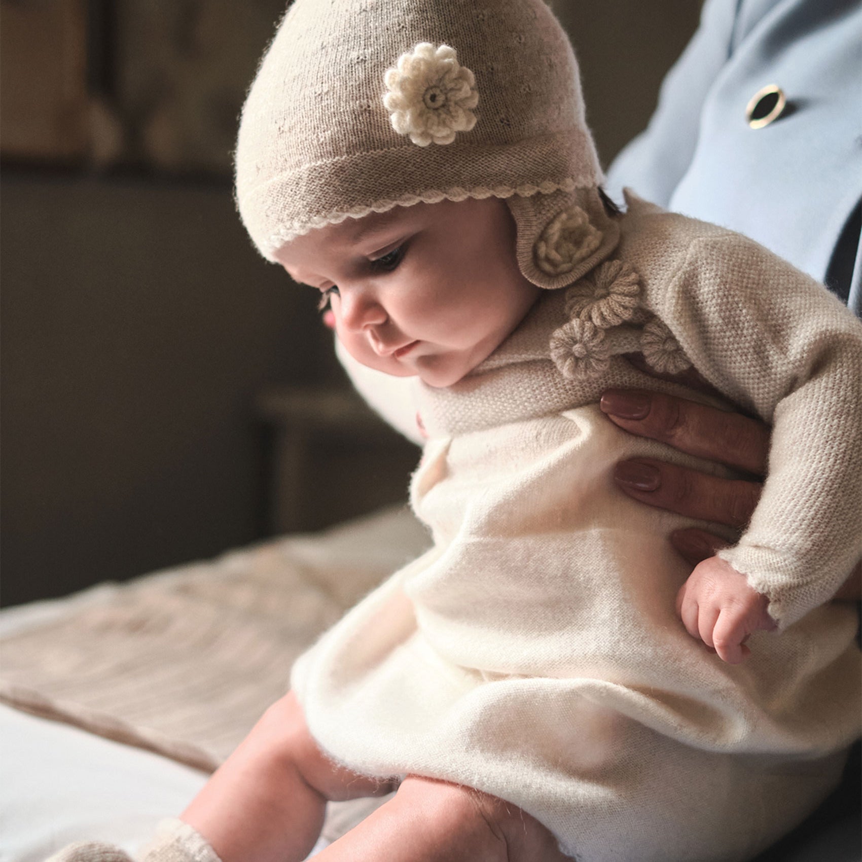 A classy midi baby girl dress made from 100% Mongolian Cashmere. It boasts beautiful crochet detailing around the neckline, sleeves and hemline. The Clara dress is cut with a round neck collar, decorated lovingly with crochet flower appliqué and buttons.