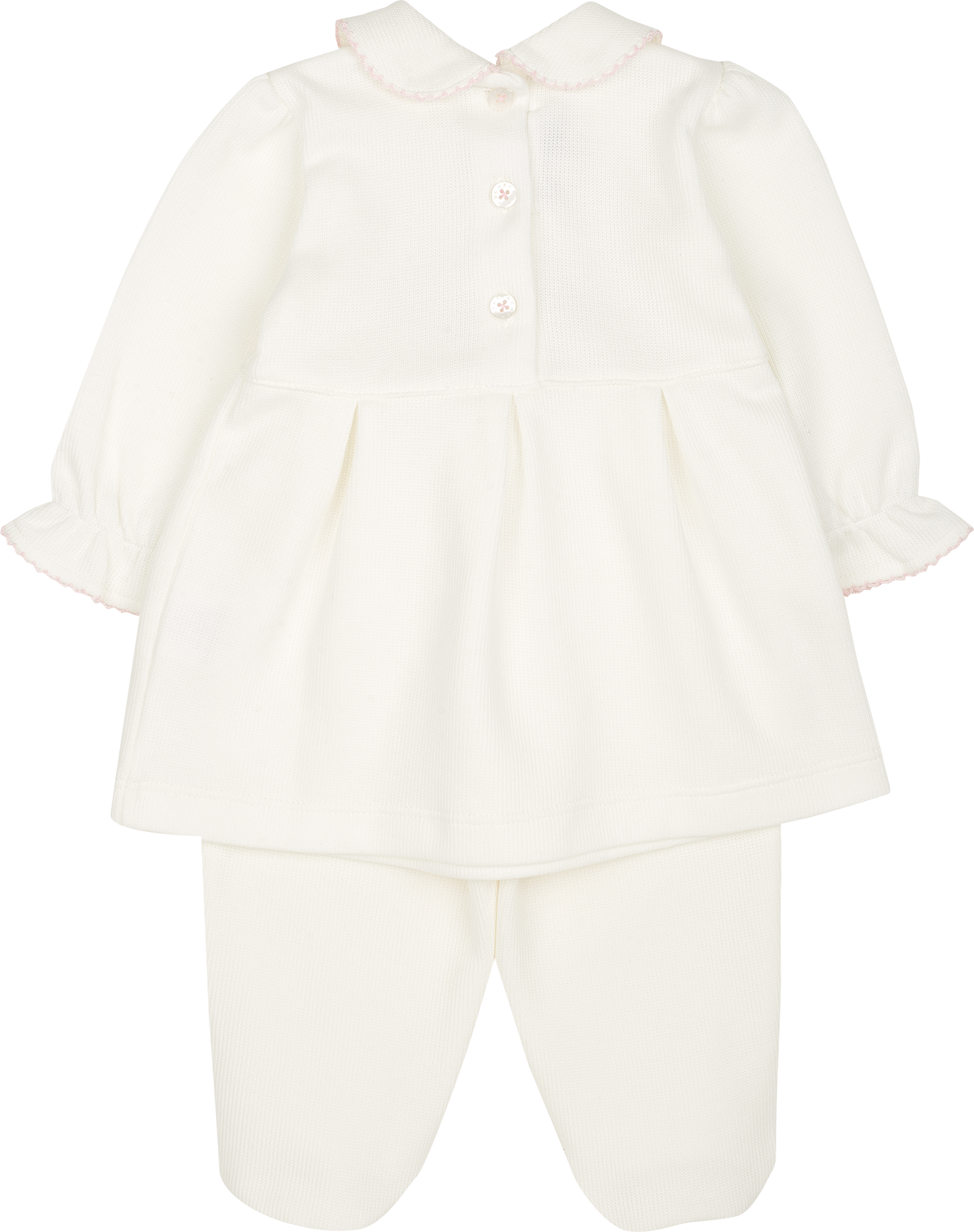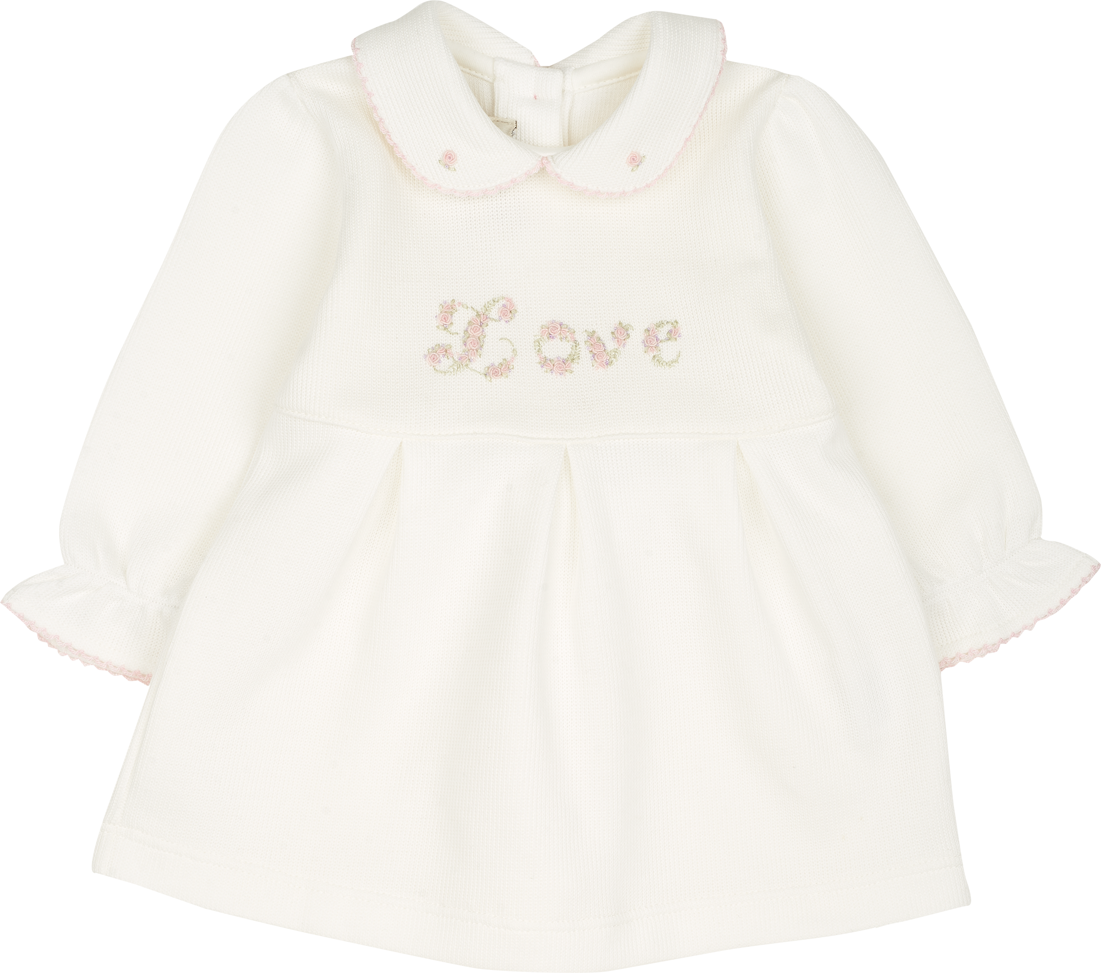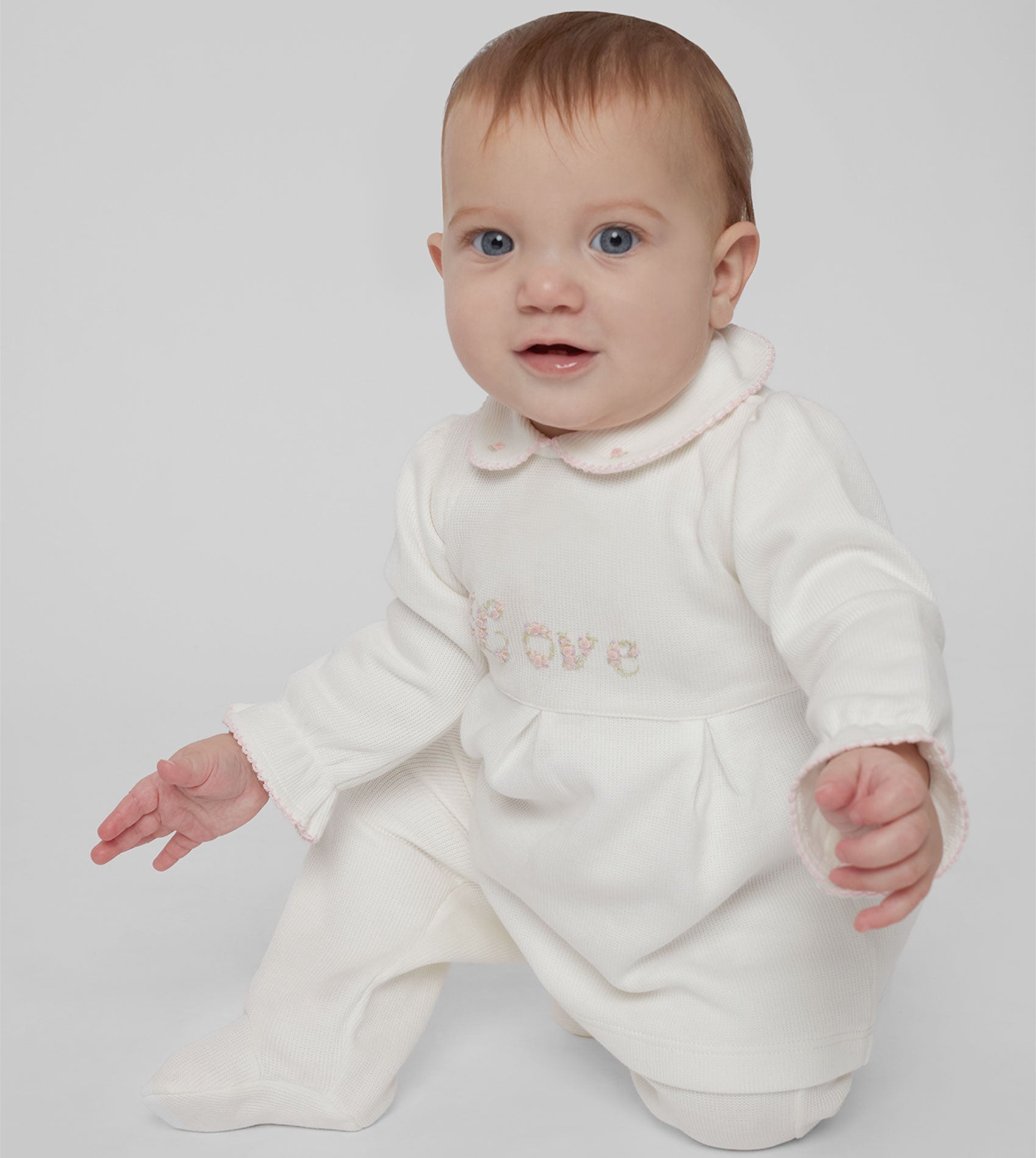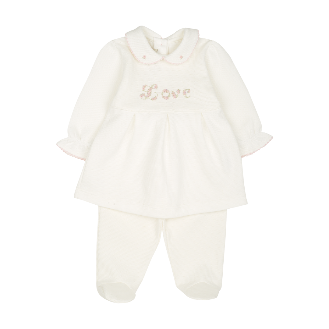 A stylish baby girl doll top with the word 'love' written in rose floral and hand embroidered, a peter pan collar, long sleeves and matching leggings with feet set. Crafted from the finest 100% Pima cotton.