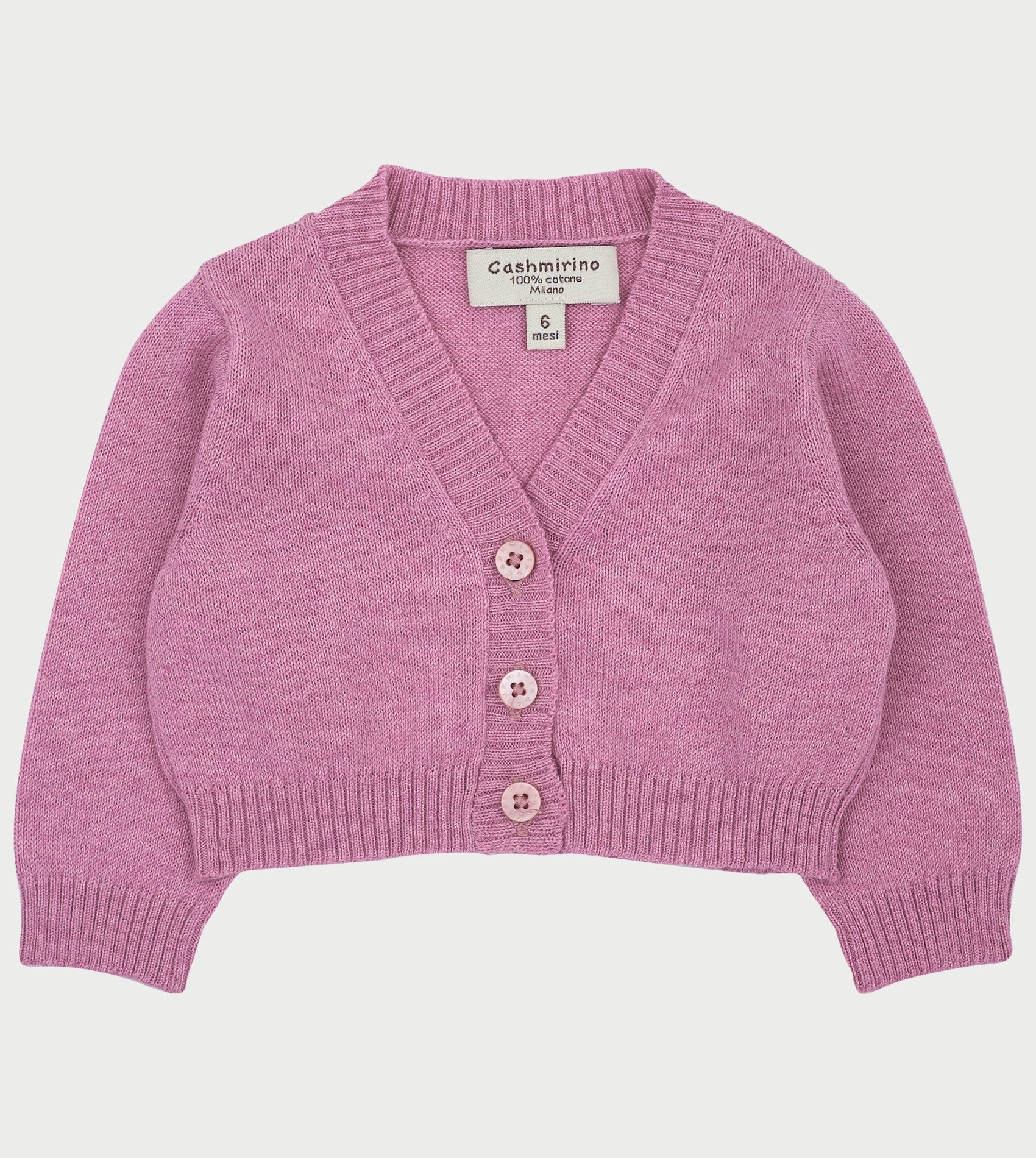Perfect for layering in autumn, spring, or even as an extra layer in winter, this lightweight baby girl shrug is crafted from 100% Pima cotton—celebrated for its exceptional softness and durability. Designed with a V-neckline and ribbed trim, it offers both comfort and refined style. The front features a neat button fastening, finished with Cashmirino’s signature buttons, making it an elegant addition to dresses or blouses.