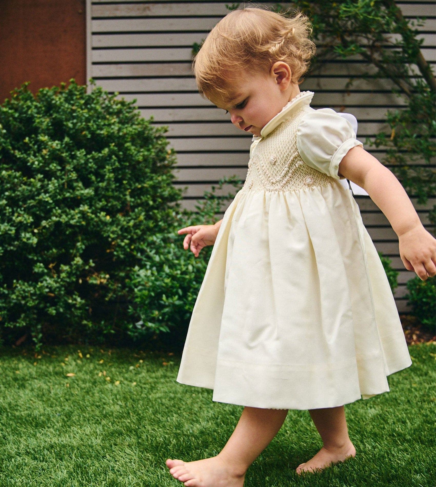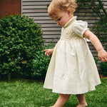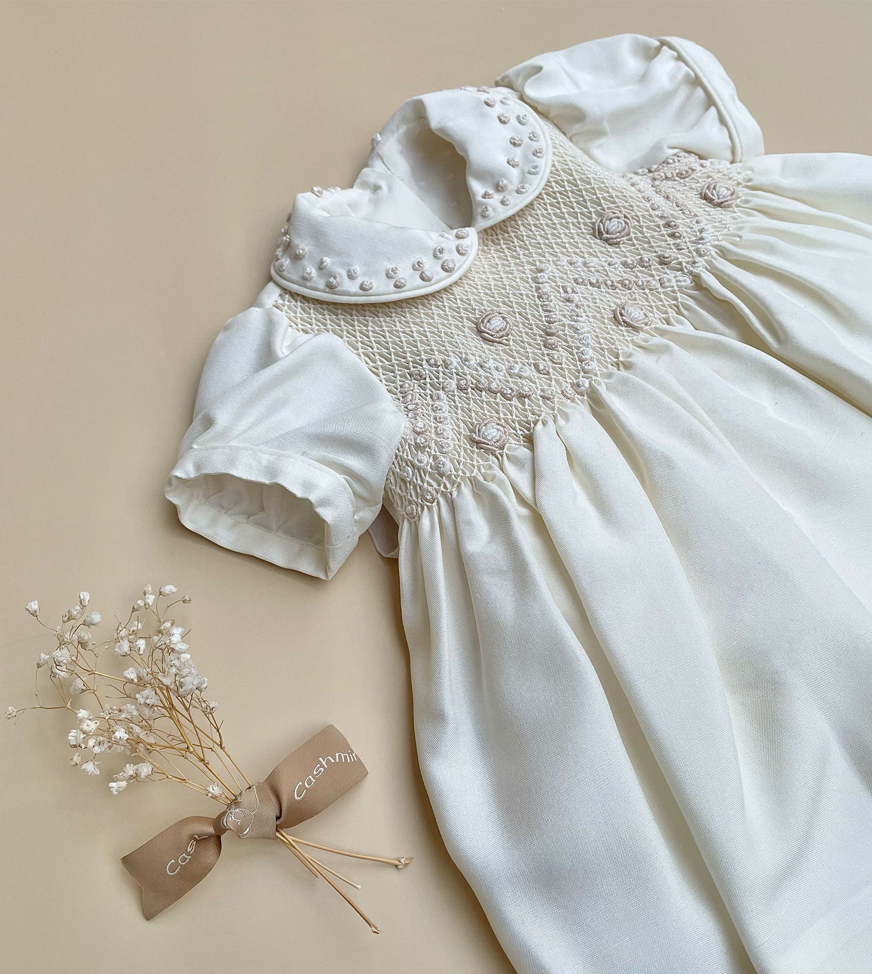 The midi-length Crystal Dress features a gently gathered skirt and charming puff sleeves, framed by a classic Peter Pan collar. The collar and sleeves are delicately piped with silk organza, while intricate hand smocking and embroidery adorn the chest and collar—each stitch lovingly sewn by hand.