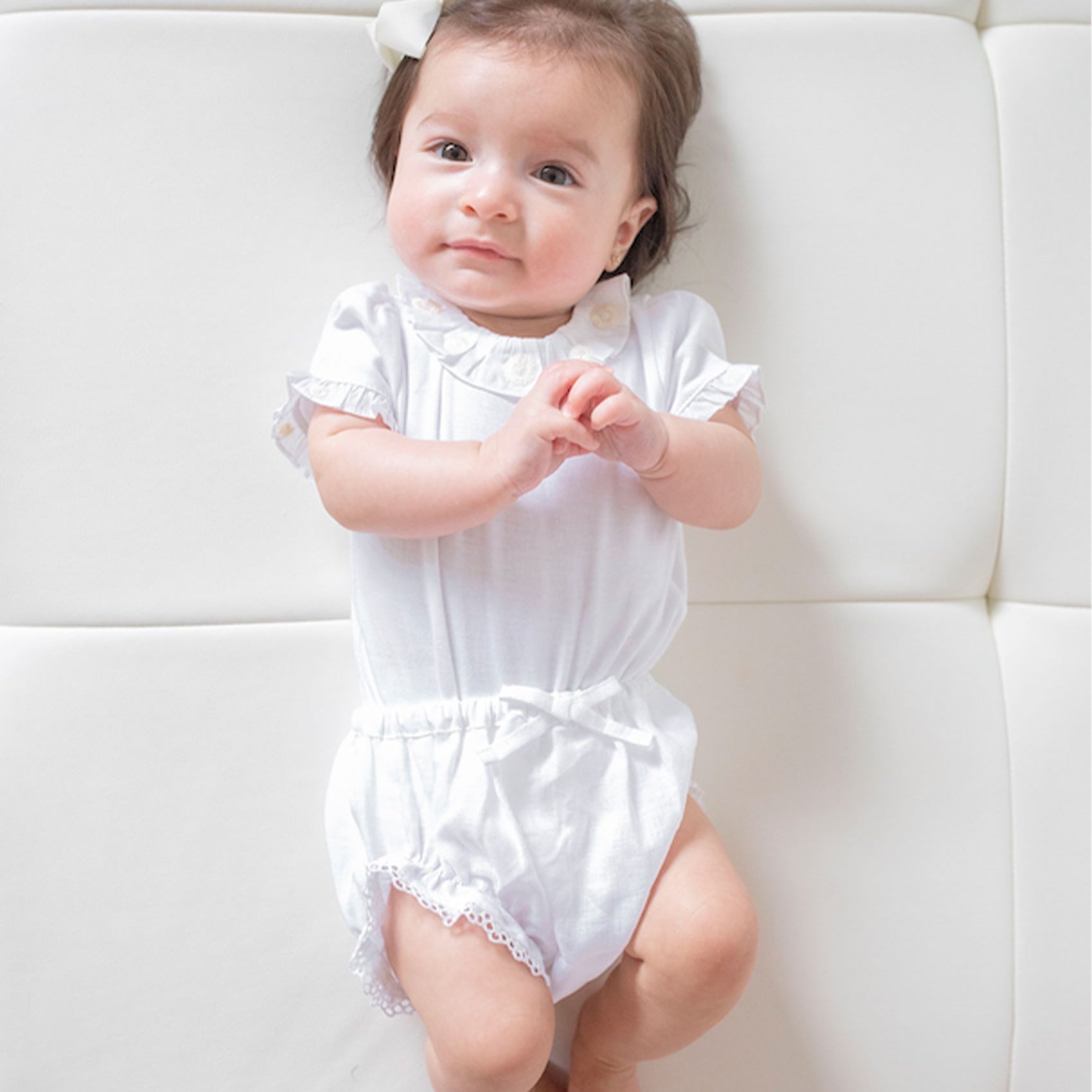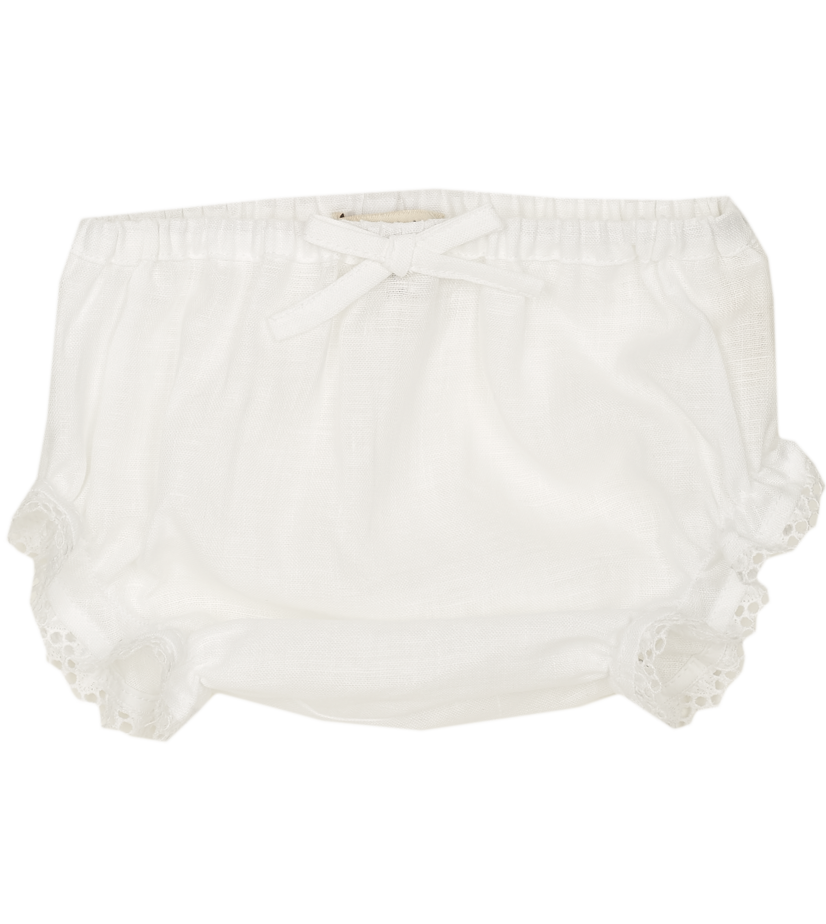 100% linen Baby Girl bloomers with delicate lace detail, finished off with a dainty bow at the front.