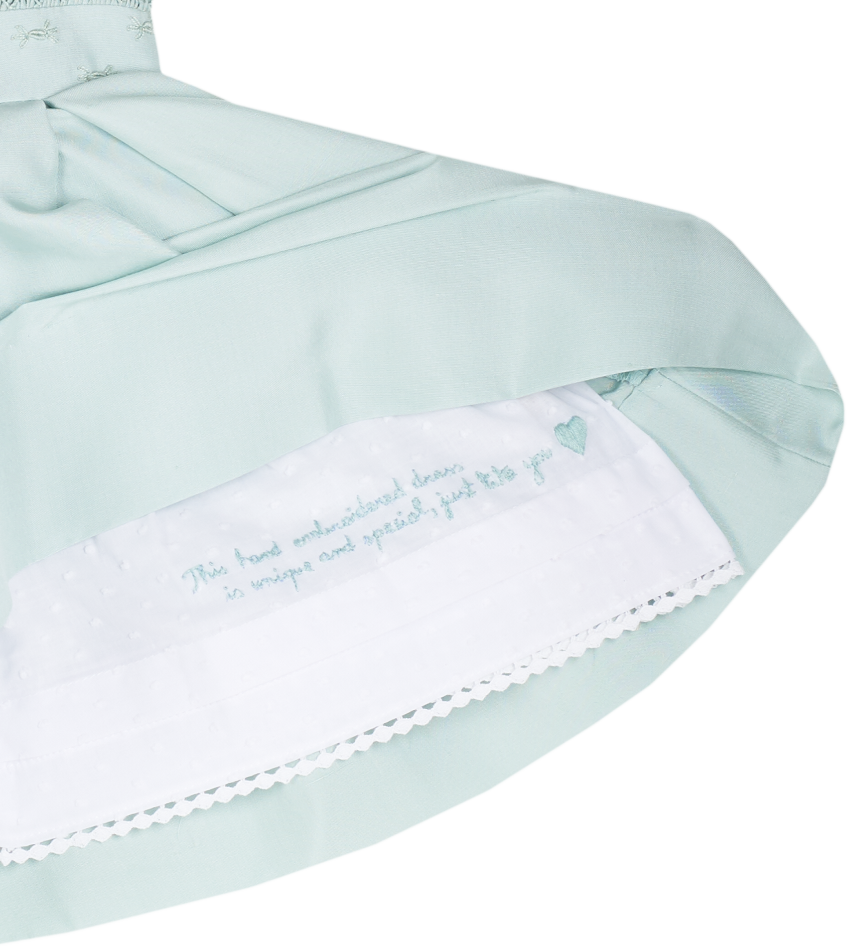 The dress is lined with 100% cotton, adorned with a crochet-trimmed lace hem, and features a hidden back zipper for a seamless silhouette. Adding a personal touch, each dress is embroidered along the lining hem with the message: “This hand-embroidered dress is unique and special, just like you.”