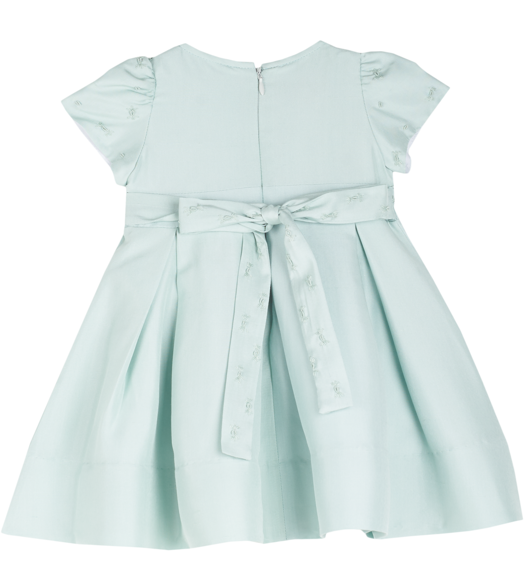 • Design: Knee-length, A-line pleated skirt, and smocked embroidered bodice