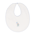 Our little embroidered bear can join your little one for breakfast, lunch and dinner. This delightful piece features an adorable bear, carefully and meticulously embroidered by hand - a testament to our dedication to craftsmanship and attention to detail. Easy to remove and put on with popper fastening and the perfect way to avoid any spills.