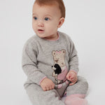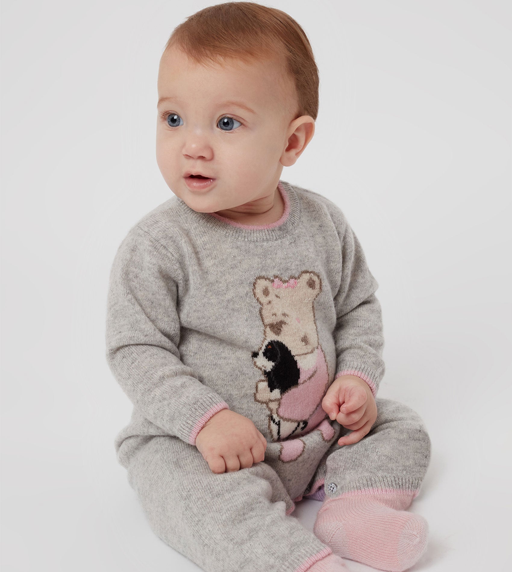 A perfect Baby Girl romper with 100% Cashmere, contrasting borders and internal contrast and paired with an adorable front intarsia of Neni and Weki. Naturally breathable.