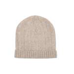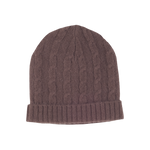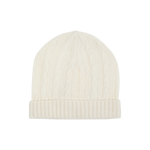 A stylish cable knit hat made from 100% cashmere featuring a turn up ribbed hem.