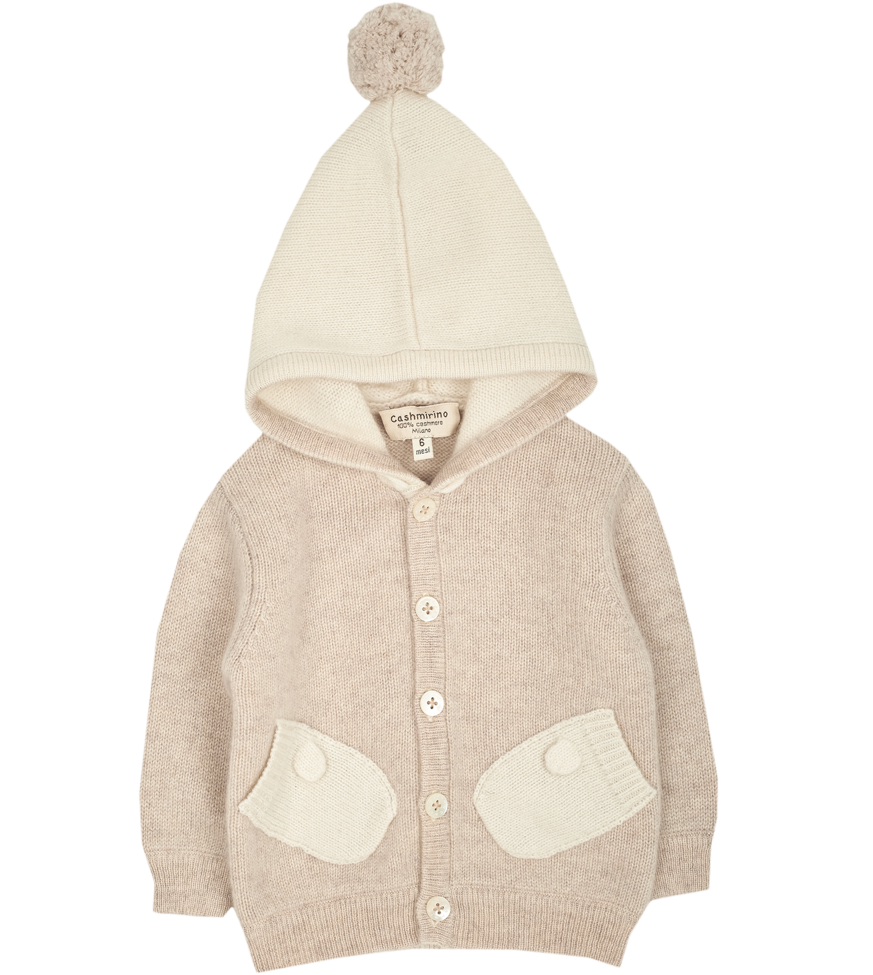 A stylish cardigan hoodie featuring cute mitten style pockets. Presented in 100% all-natural Mongolian cashmere this adorable twist on an everyday essential includes distinct attention to detail with the functional mitten-shaped pockets as well as a pompom detailed hood. Signature Cashmirino buttons adorn the front of this cardigan.