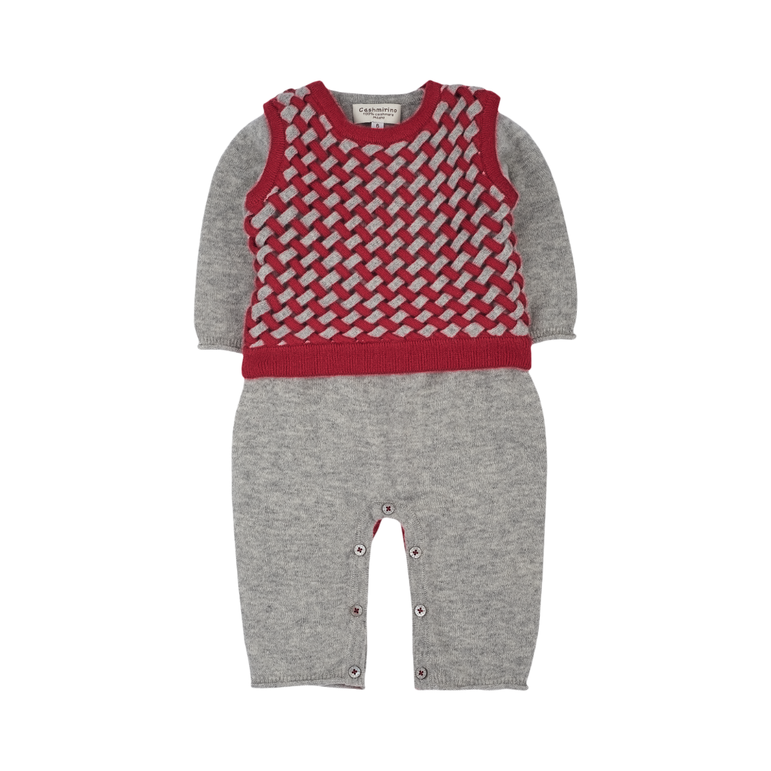 This unisex romper is made from 100% cashmere, designed to keep your baby comfortable and warm. Featuring long sleeves, a round neck, and convenient button fastening along the legs for easy dressing and diaper changes. The romper comes with a removable slipover, showcasing a two-color woven braided design for added style and texture. Soft, lightweight, and cozy, this piece is perfect for colder days while ensuring both comfort and warmth.