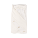 Hooded towel with bear and clover embroidery, featuring a smocked panel detail and wash mitt, the perfect gift for newborns.