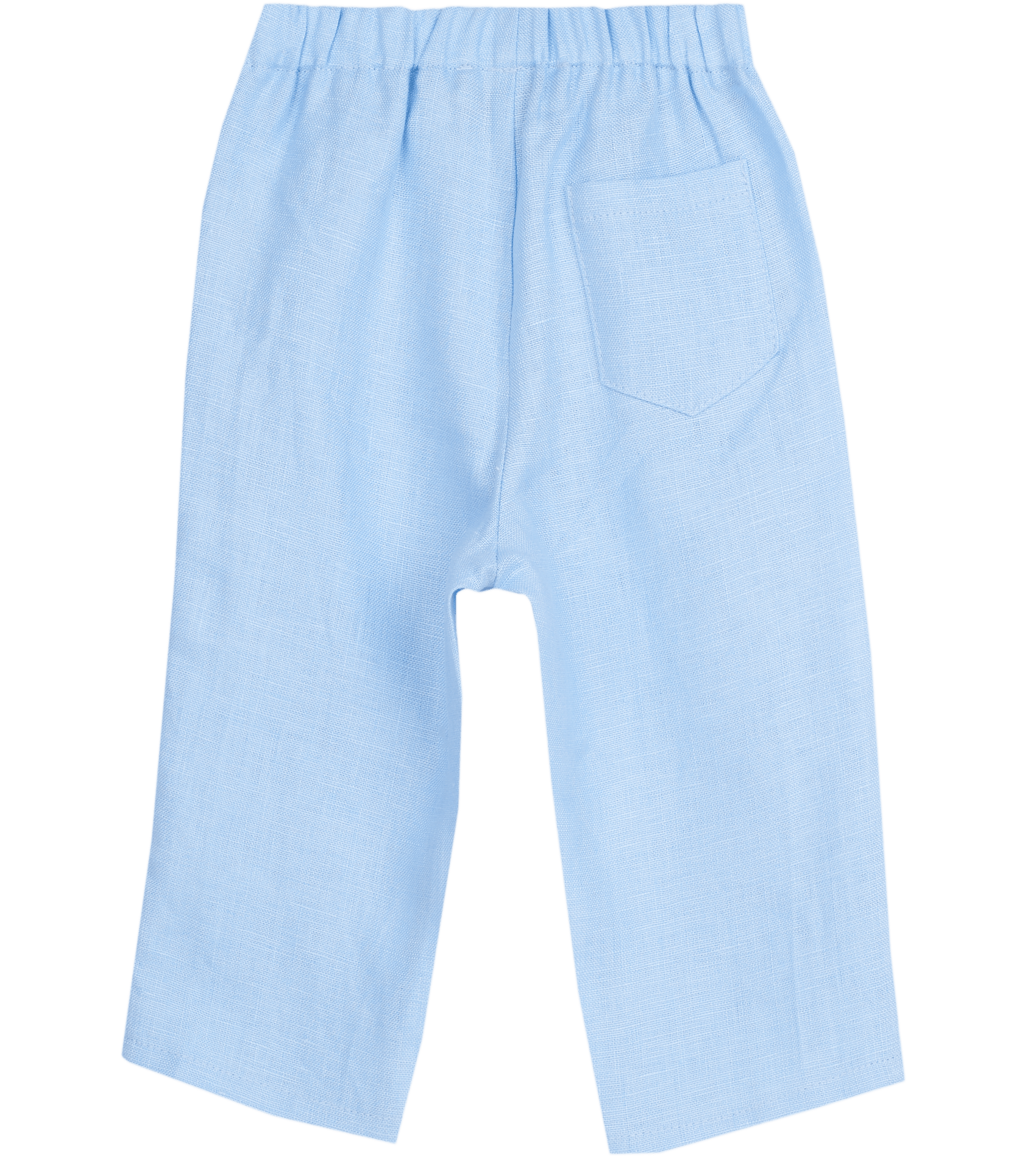 A pair of 100% linen baby unisex trousers with a back pocket and an elasticated waistband to allow plenty of room for growth.