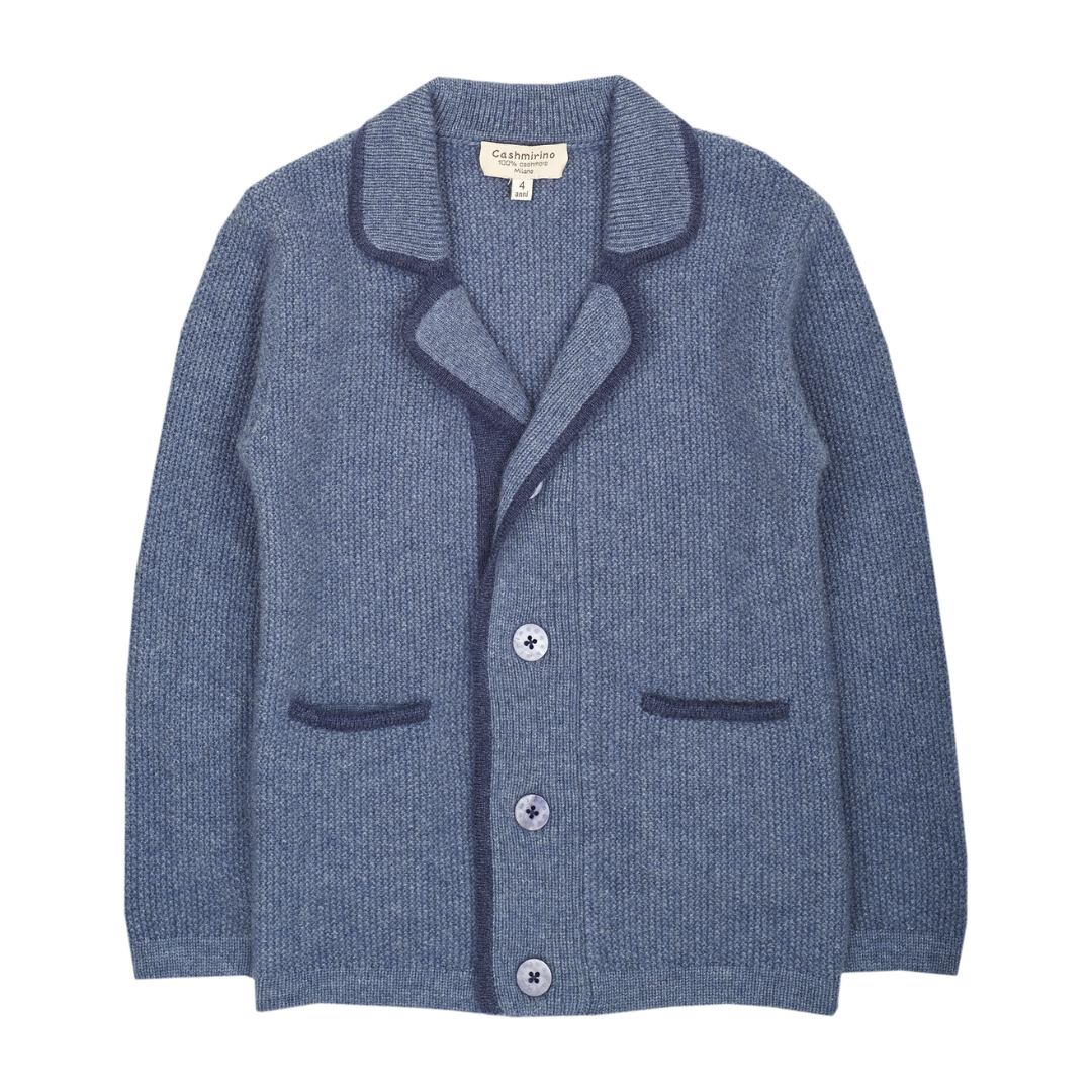 Smarten up with this 100% cashmere boy blazer - a classic piece that features contrasting coloured lapels and buttons, elbow patches and pockets and Cashmirino signature buttons. In spring and autumn, this blazer can be worn instead of a jacket directly on top of a shirt, making your little boy look very cute and elegant like a little Prince.